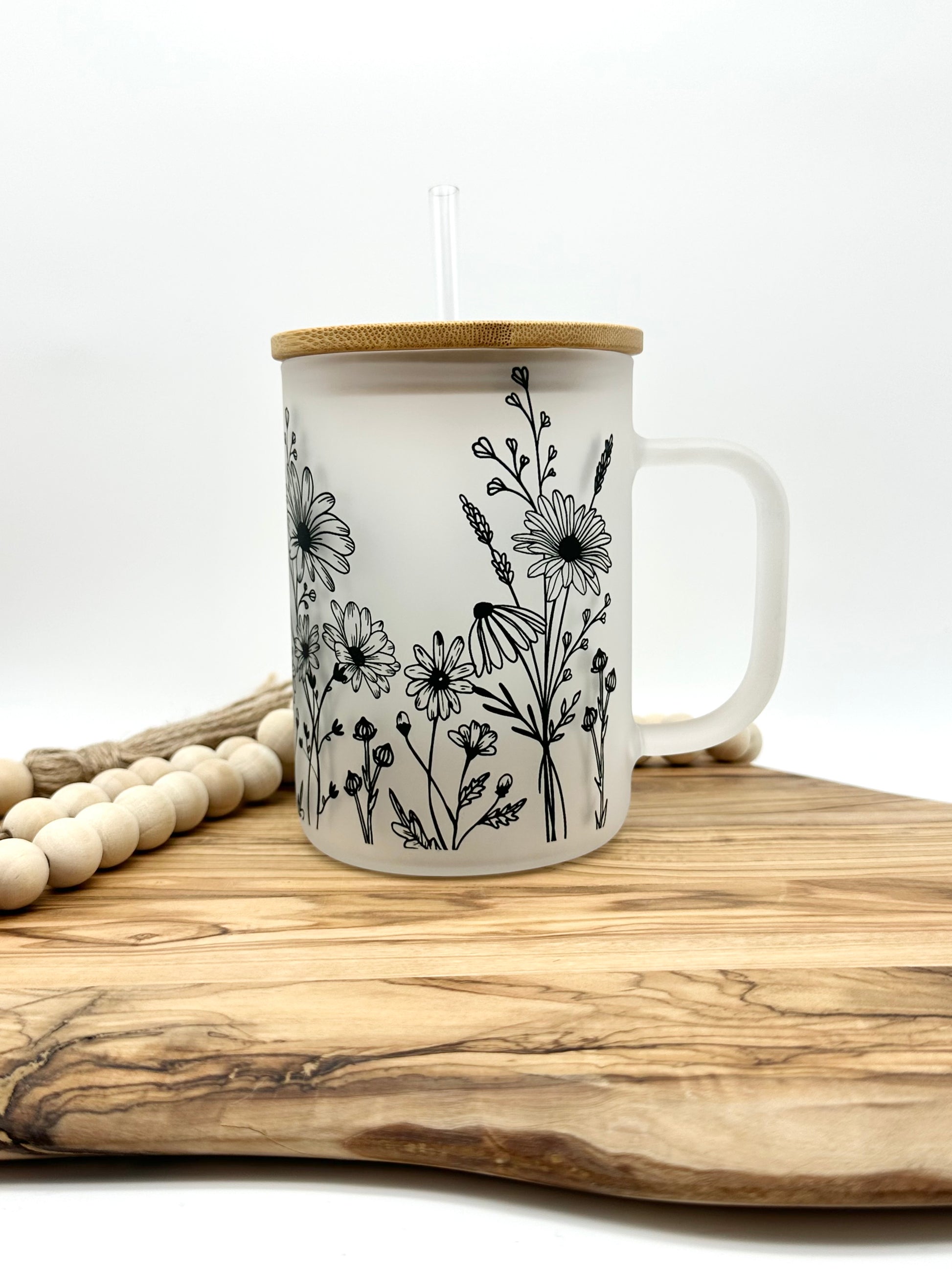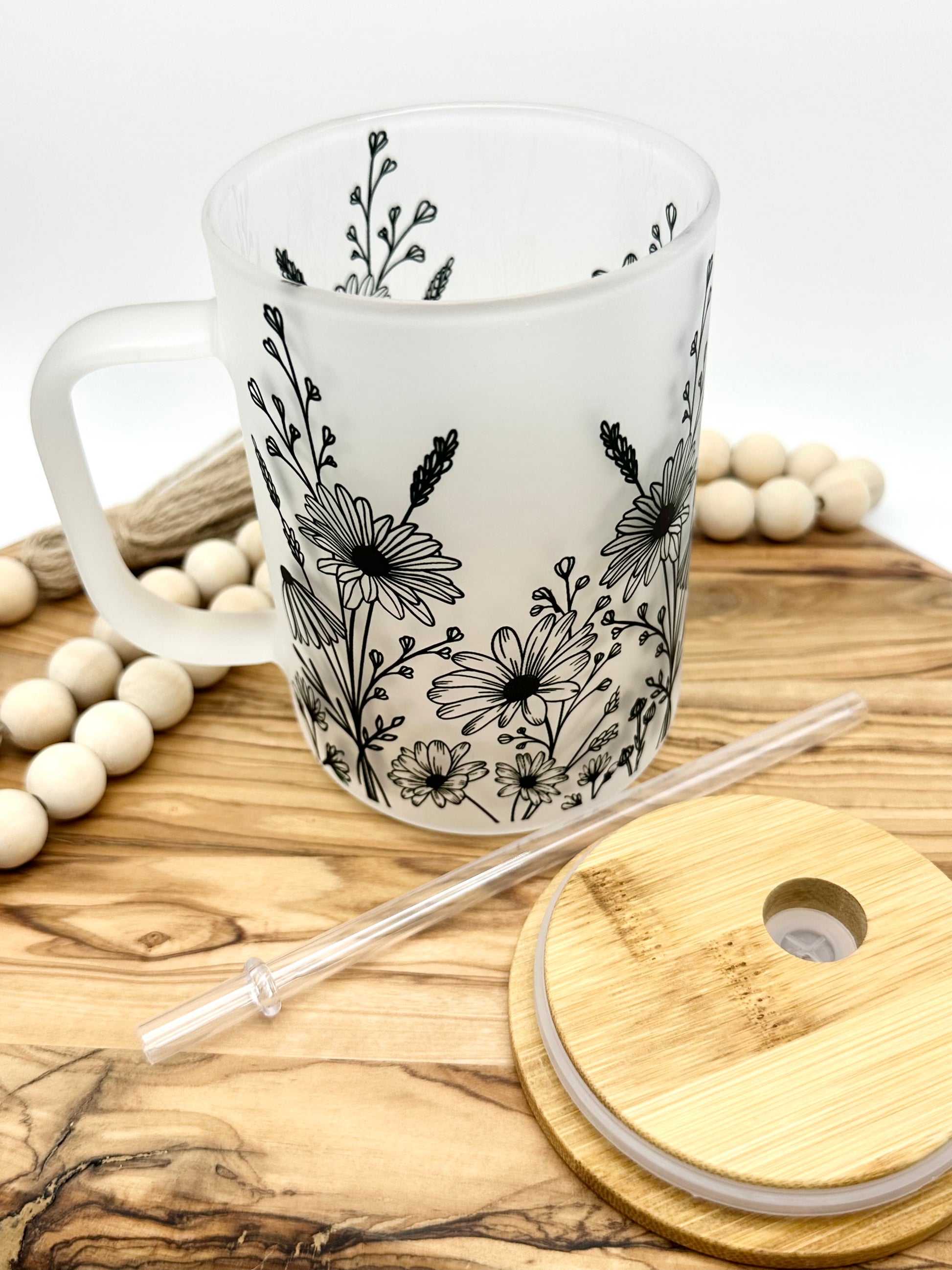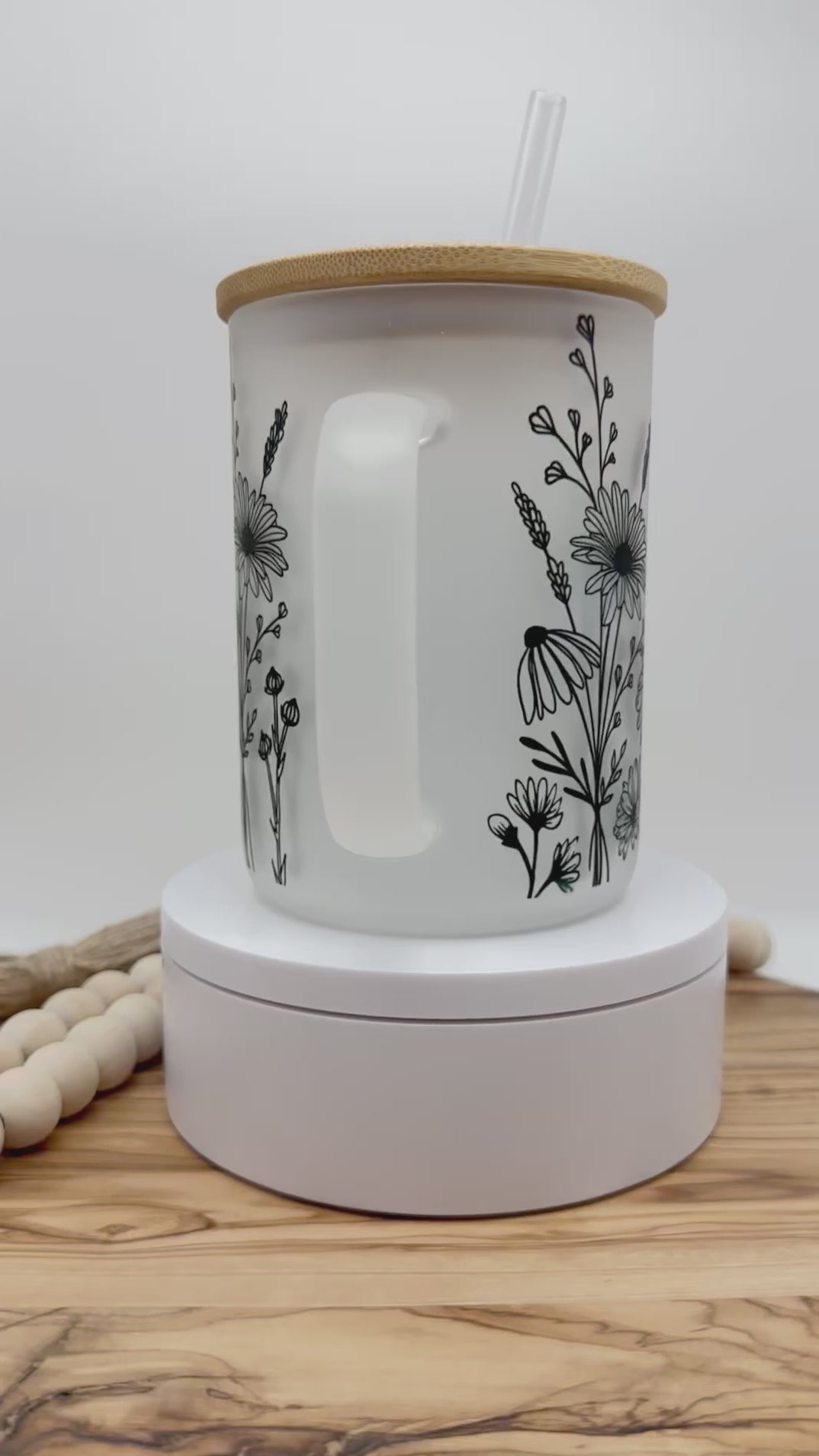 Introducing our 15oz frosted glass mug with a bamboo lid and plastic straw. The bamboo lid and straw make it easy to take your drink on the go! There is a silicone ring around the lid to help keep it firmly in place.