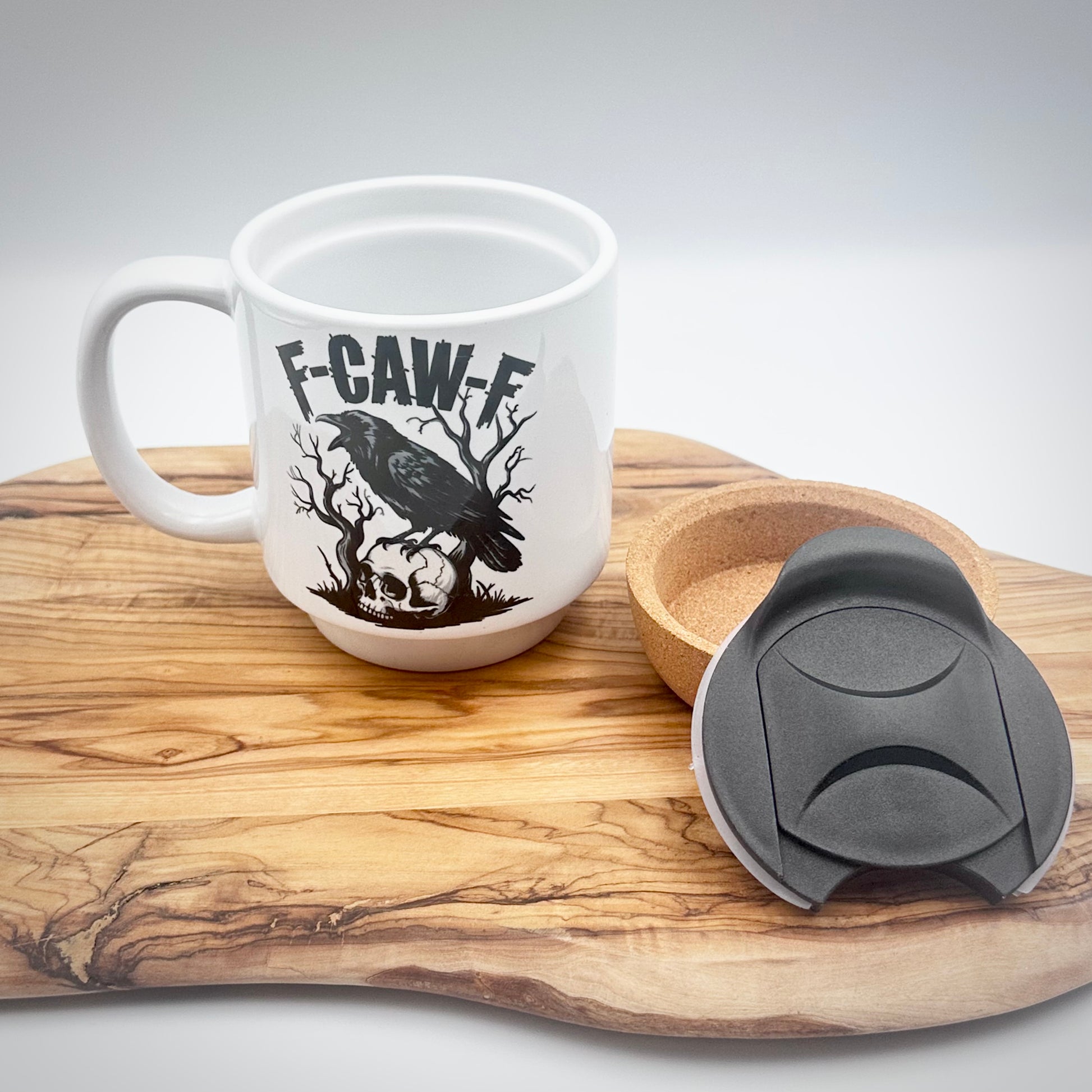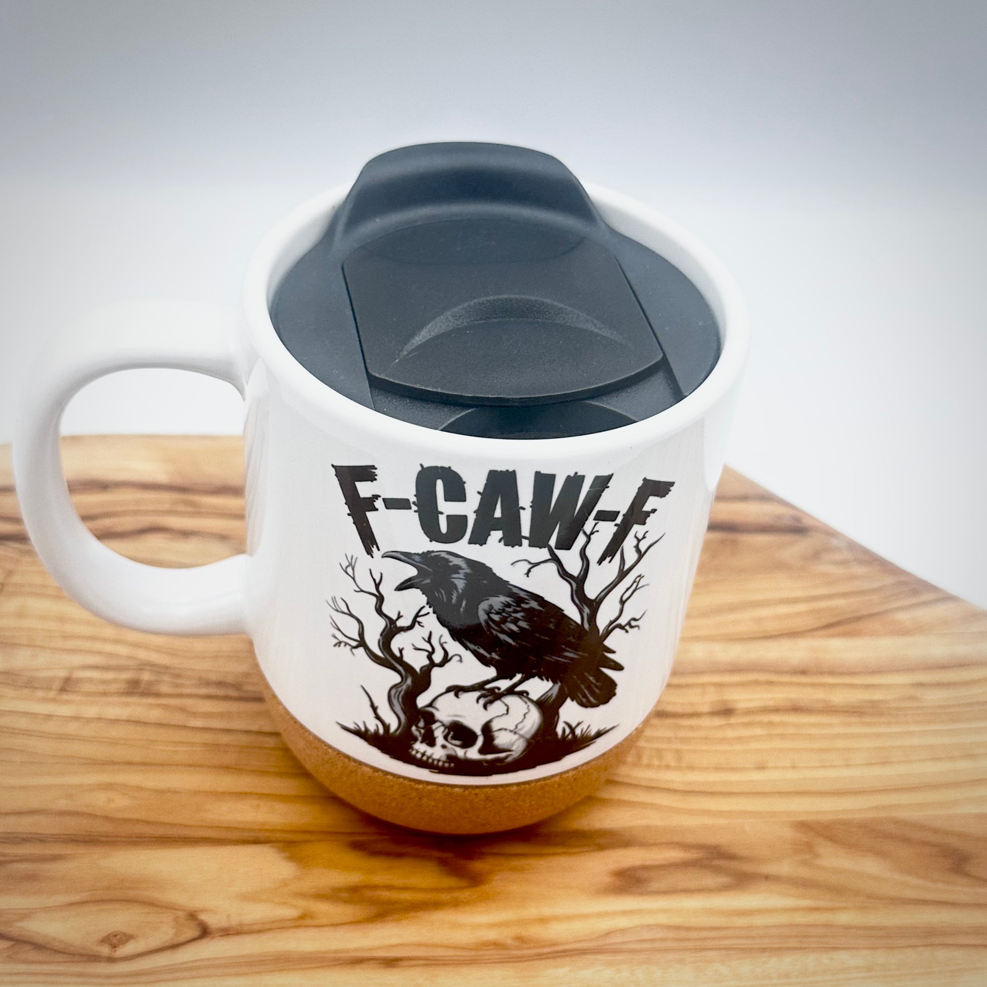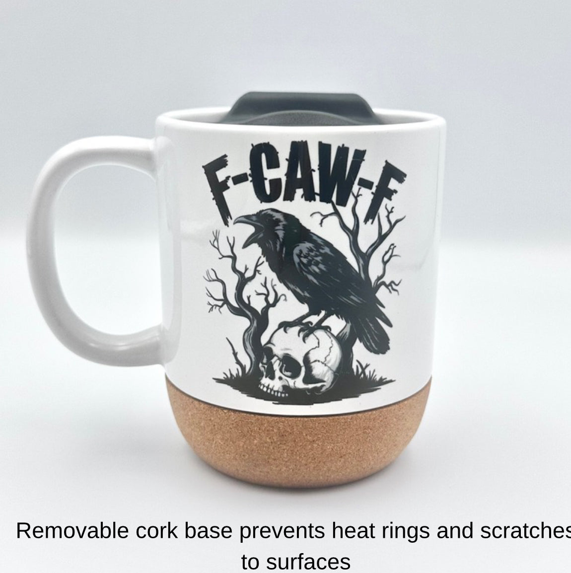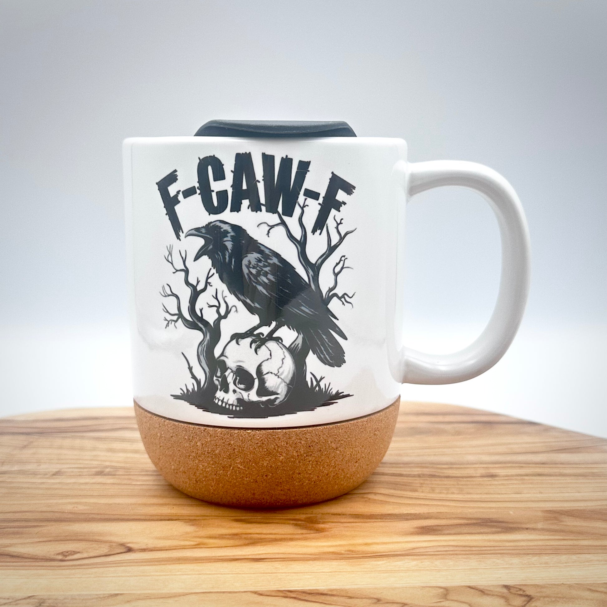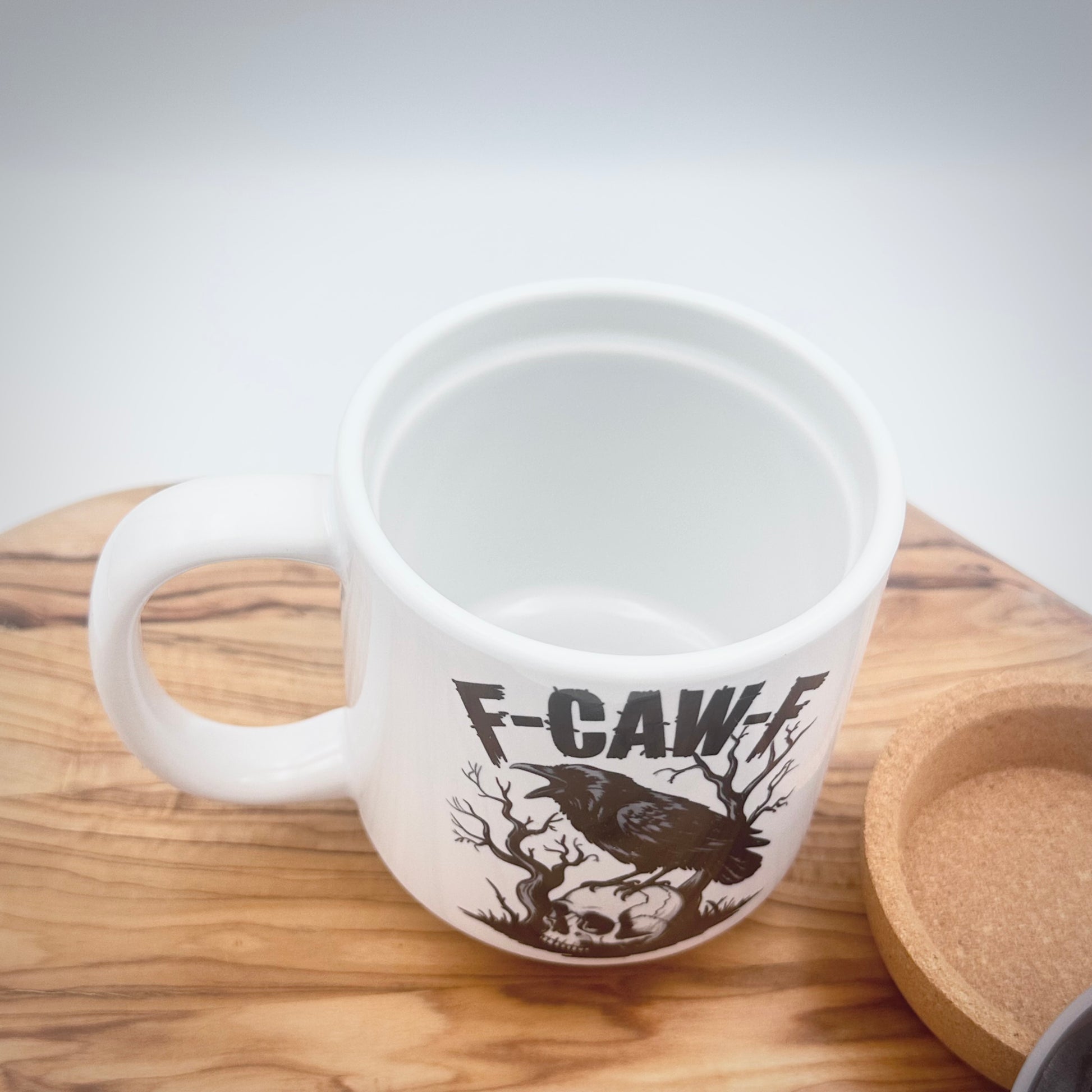 This 15oz ceramic coffee mug combines bold design with everyday functionality. The front features a detailed black raven perched on a skull with the phrase “F-CAW-F,” making it a standout piece for anyone who appreciates dark, gothic, or alternative style drinkware.
