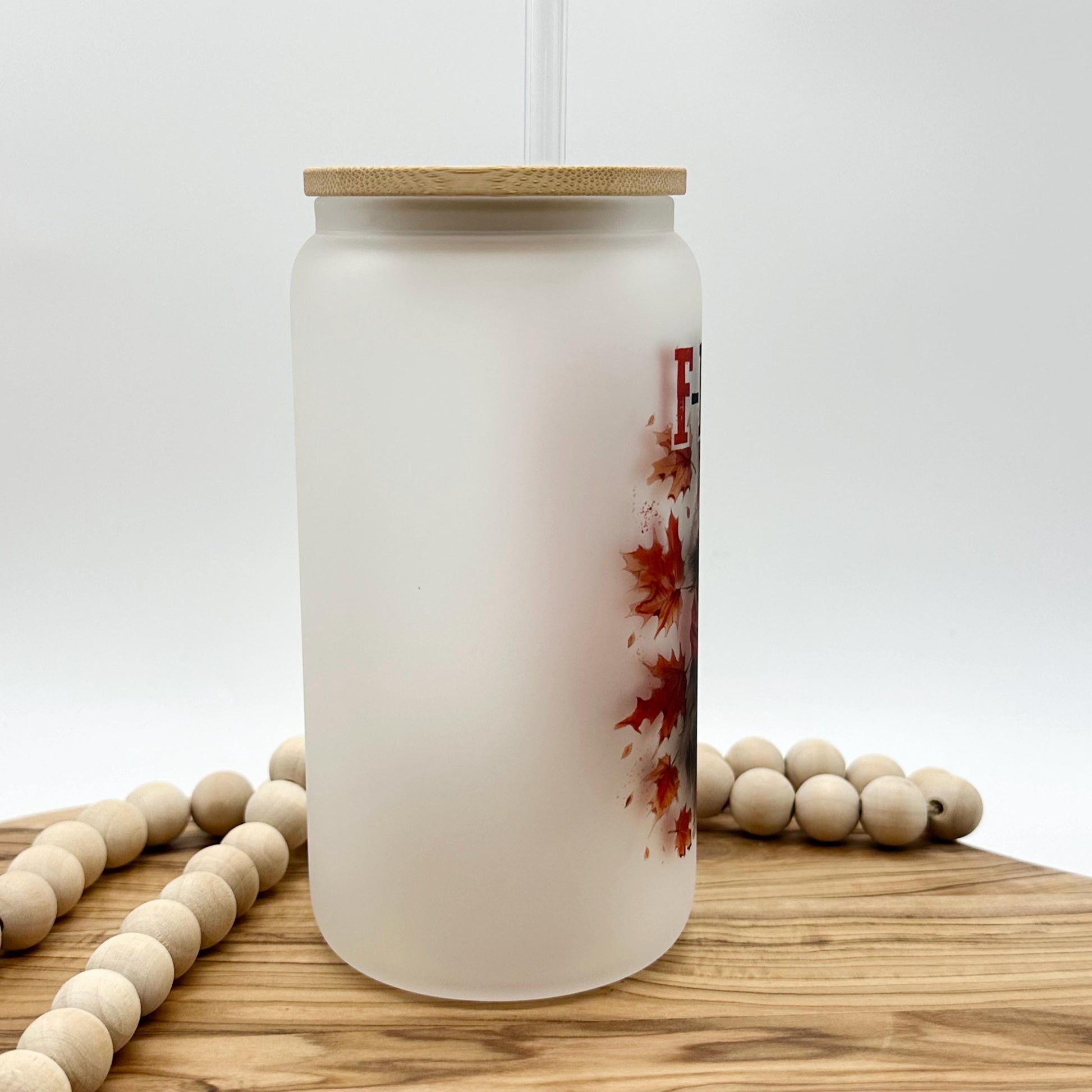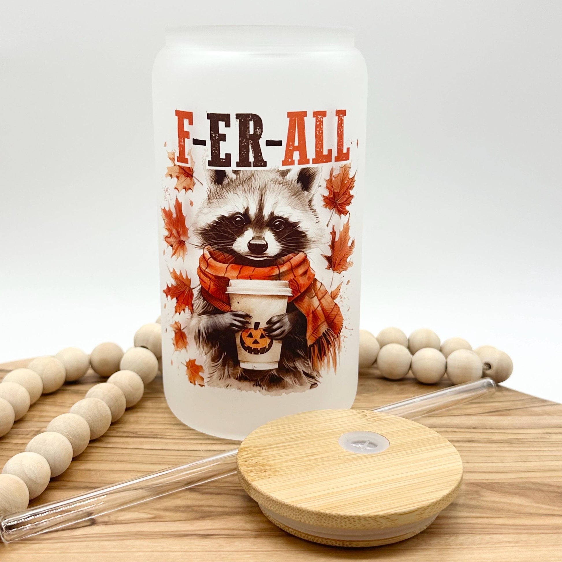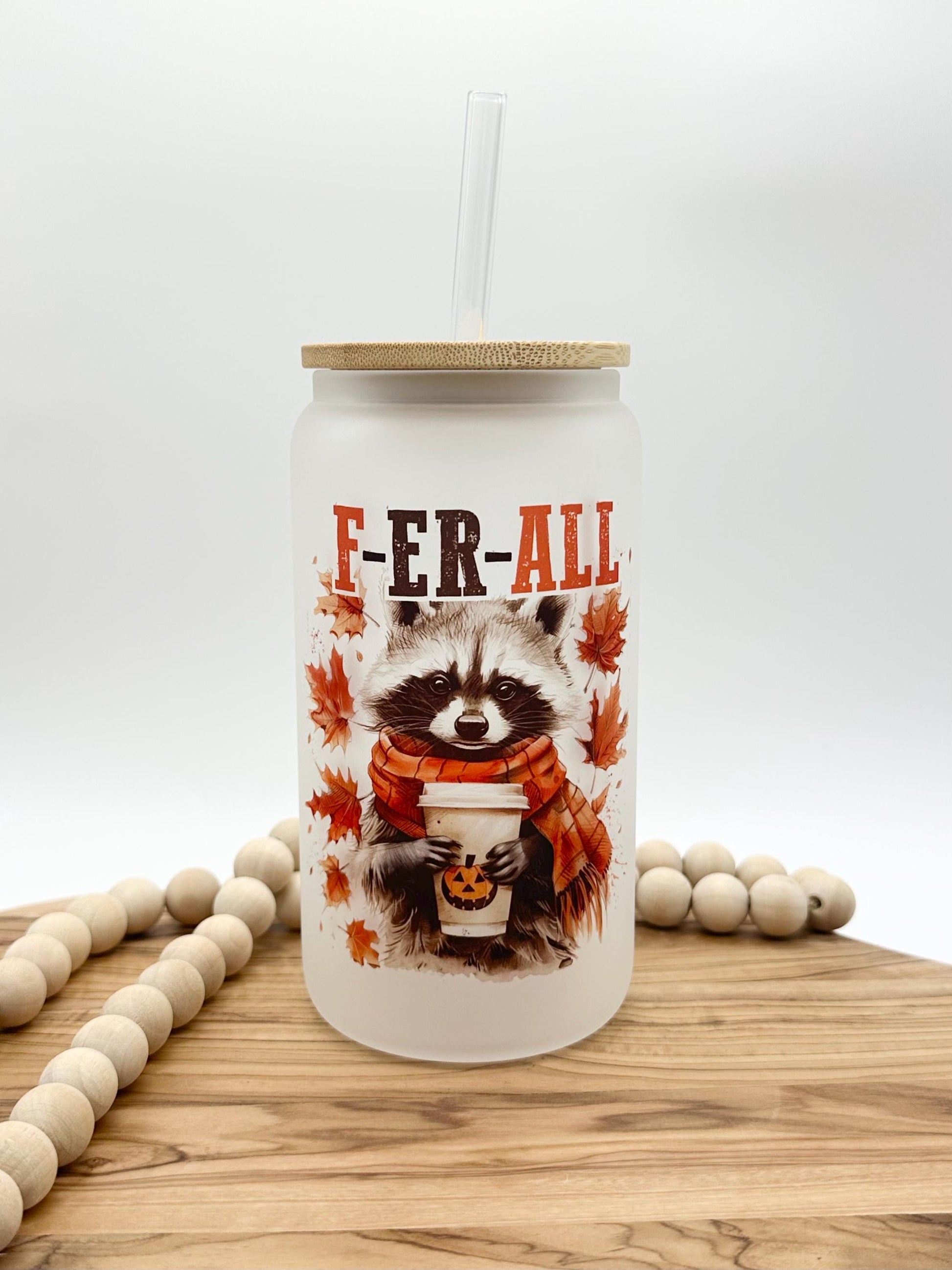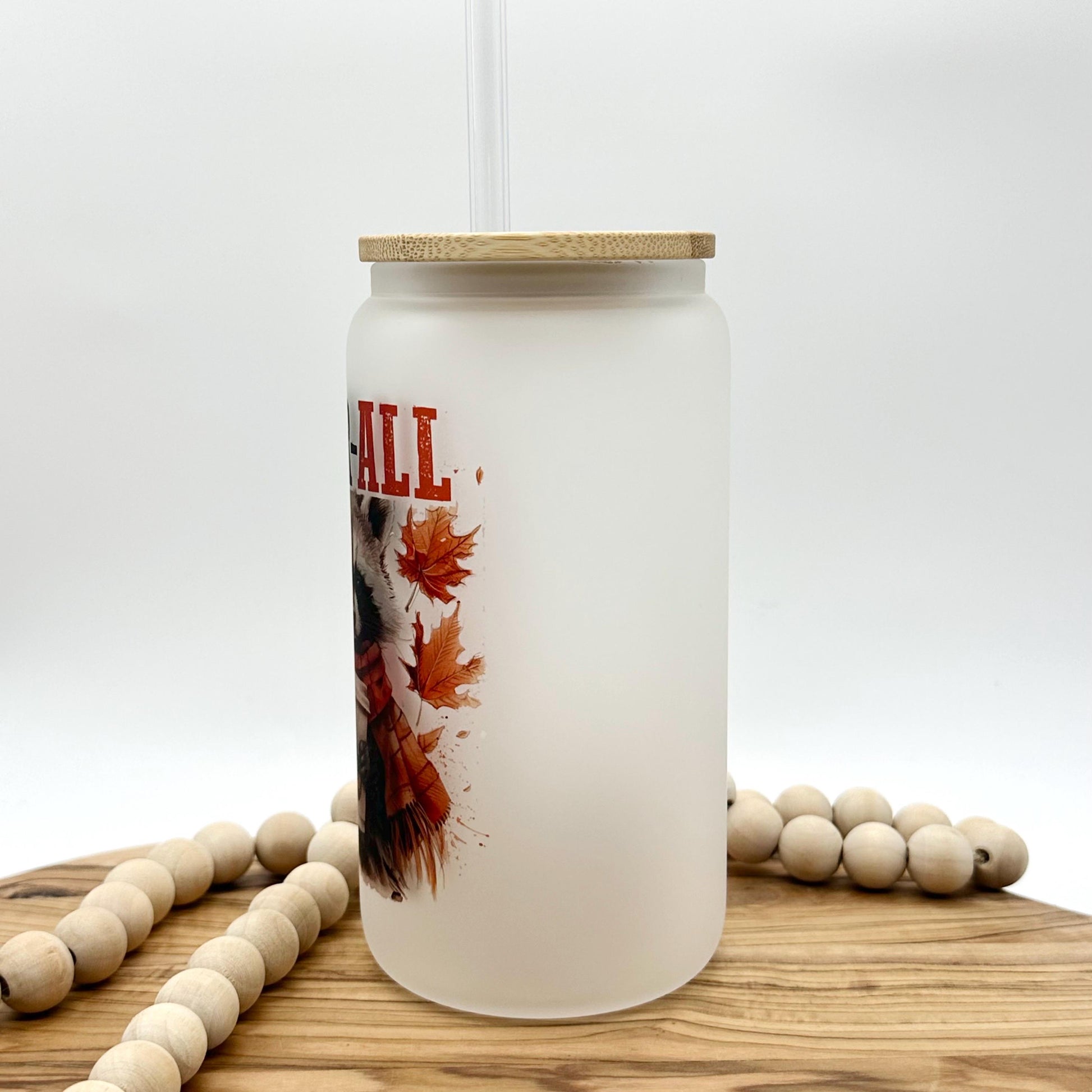 This frosted glass can is so cute and would make an excellent gift for anyone who is a raccoon lover. This glass is perfect for iced coffee, iced tea, or any other cold beverage. It holds up to 16 ounces, making it the perfect size for your favorite drink. And when you're not using it, the bamboo lid doubles as a coaster, so you can keep your surfaces clean and free of water rings. The image has been added using sublimation which infuses the image onto the glass. This means the image will not fade or peel.
