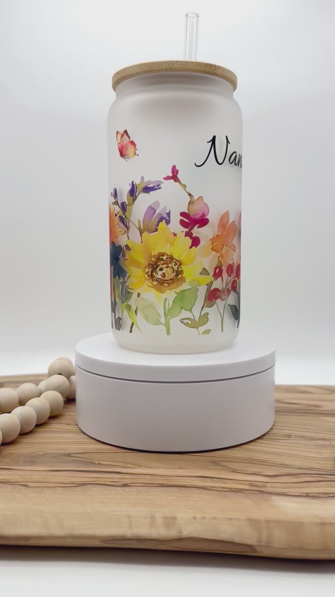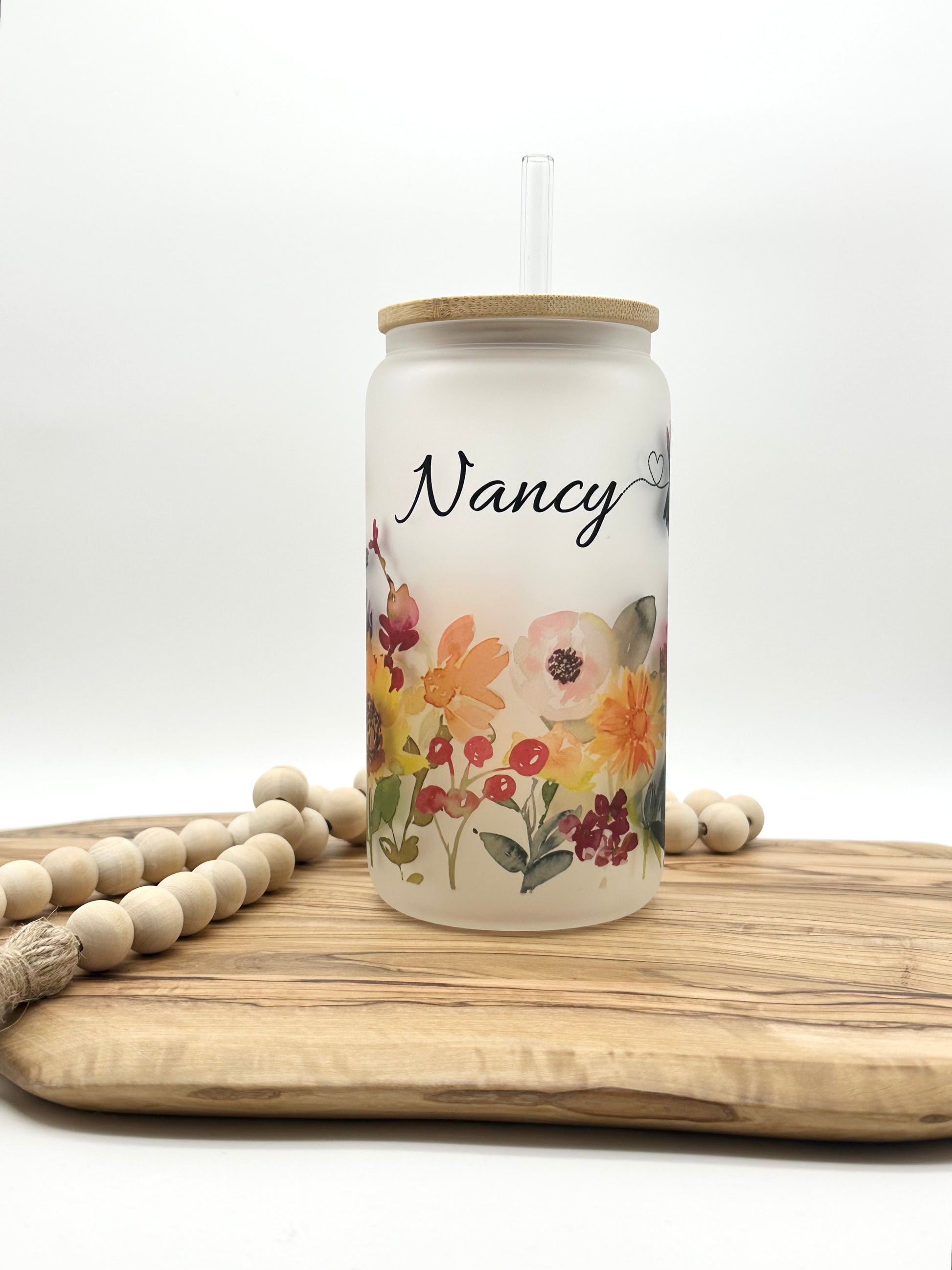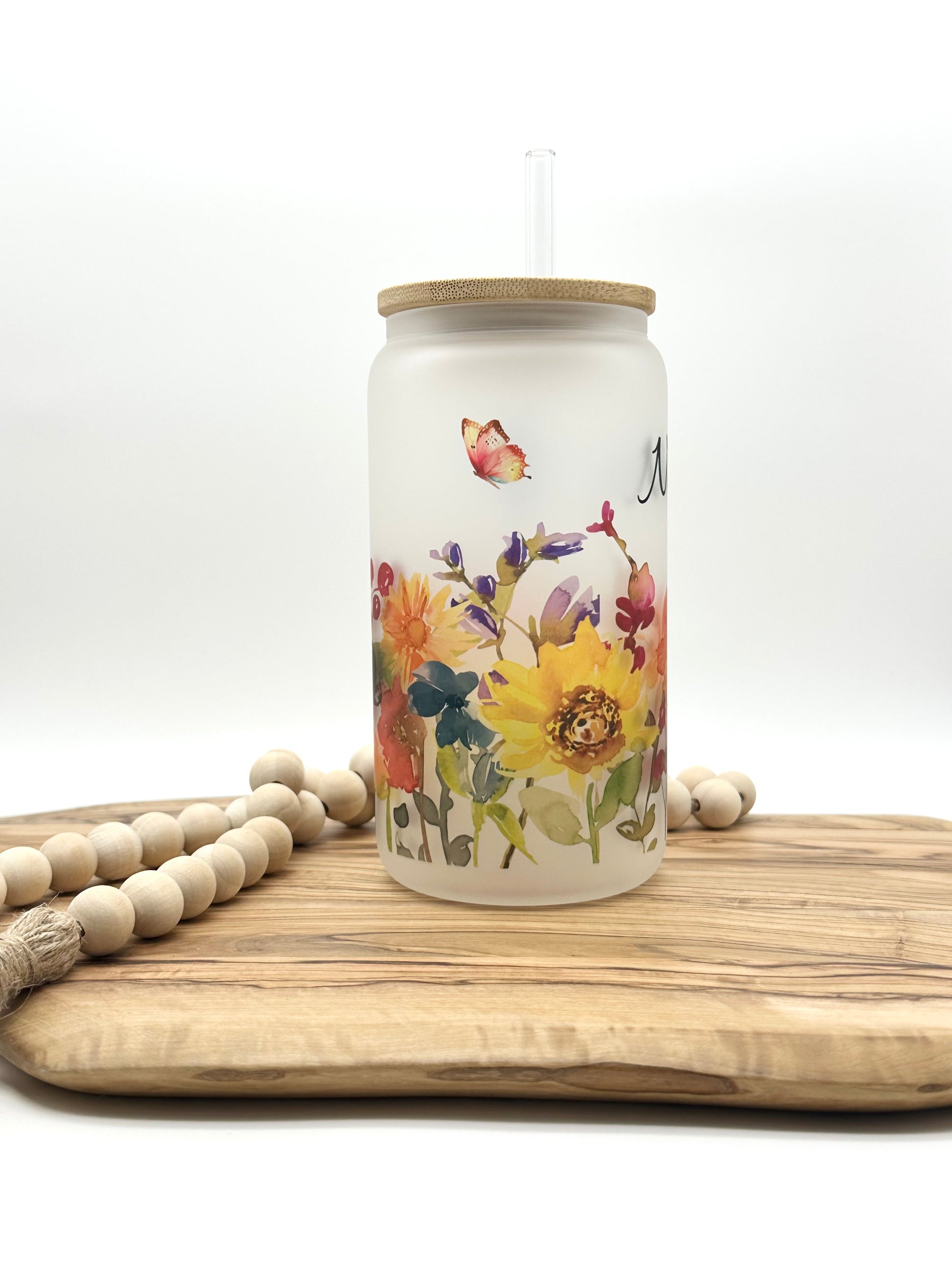 Order now and enjoy a refreshing drink in our stylish and eco-friendly floral frosted glass can with a bamboo lid and straw. It also makes a great gift for any flower or iced coffee lover!