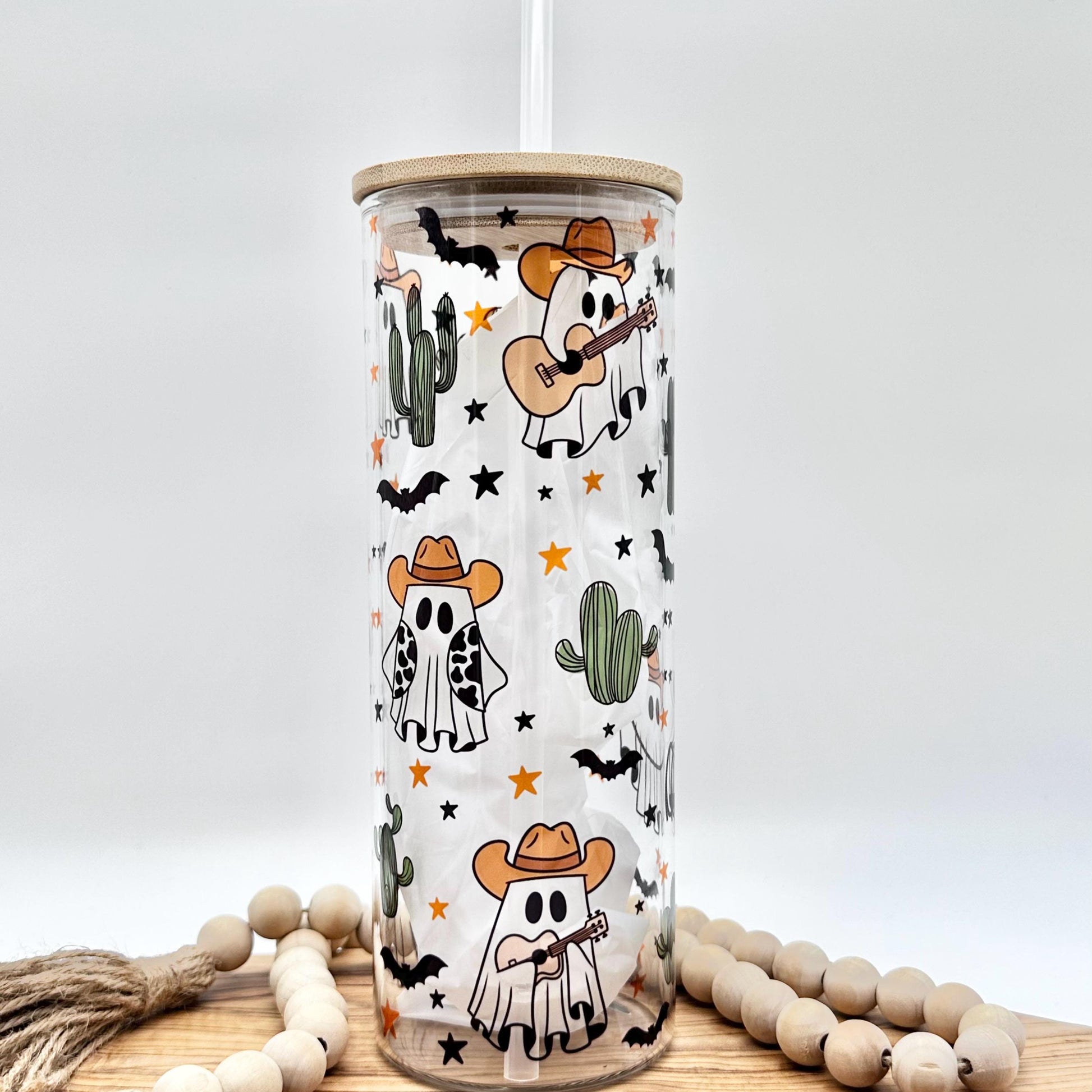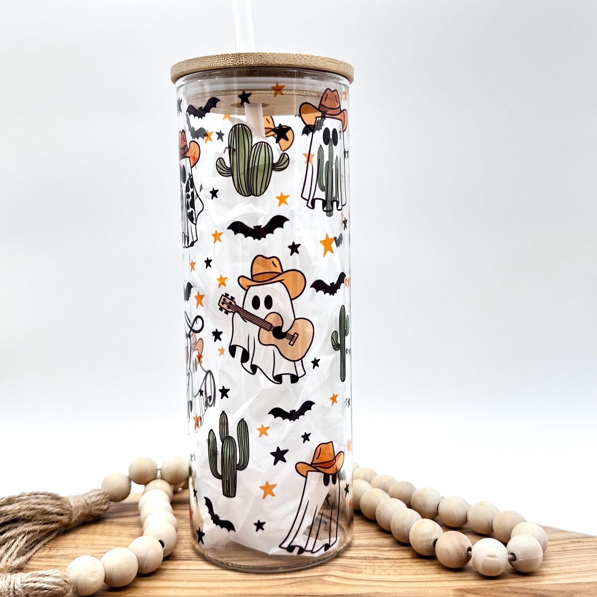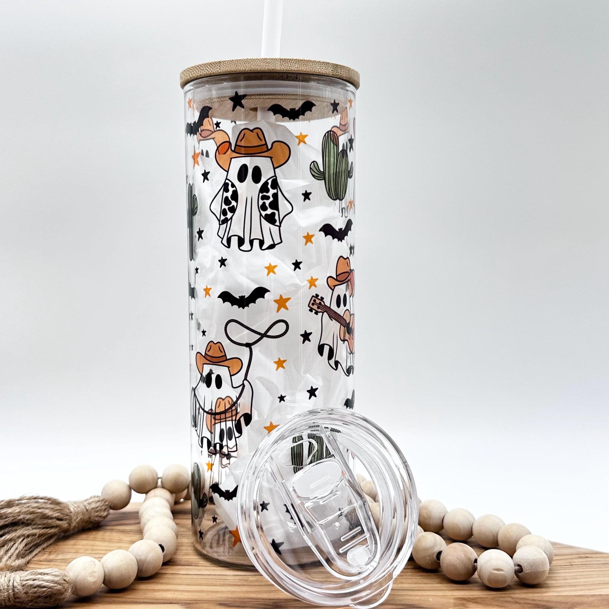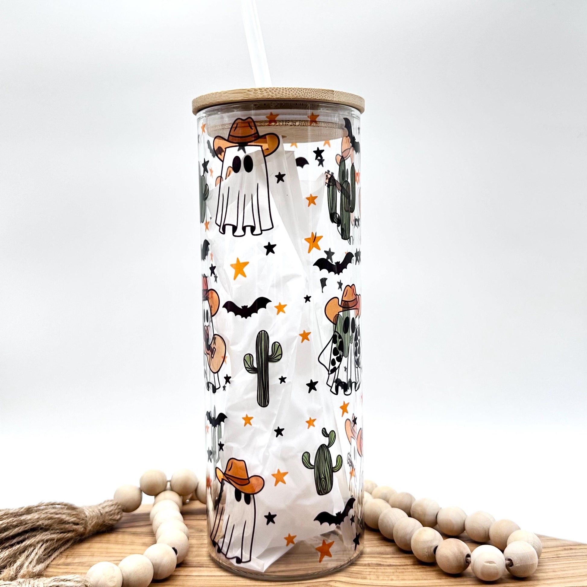 20oz Cowboy Ghost Clear Glass Tumbler, Skinny Glass Tumbler with Bamboo and Plastic Lid, Halloween Ghosts and Bats, Eco Friendly Drinkware