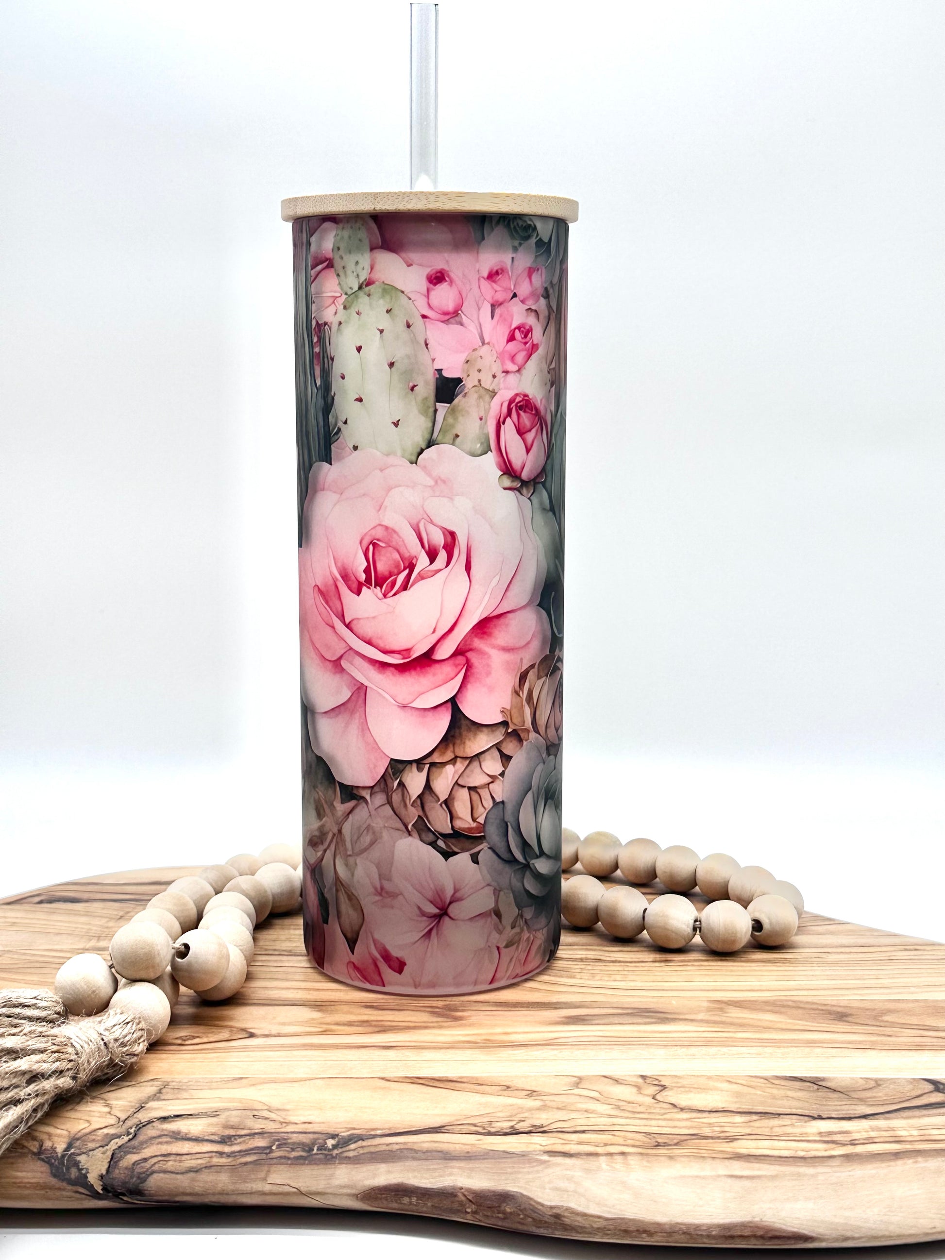 This 20oz frosted glass tumbler features a beautiful watercolor mountain landscape design, perfect for nature enthusiasts. It comes with both a bamboo lid and a plastic lid with a slide closure, offering versatile options for easy use. The tumbler also includes a plastic straw for convenient sipping. With its stylish and functional design, this tumbler is perfect for everyday use, whether you're enjoying a drink at home or on the go.