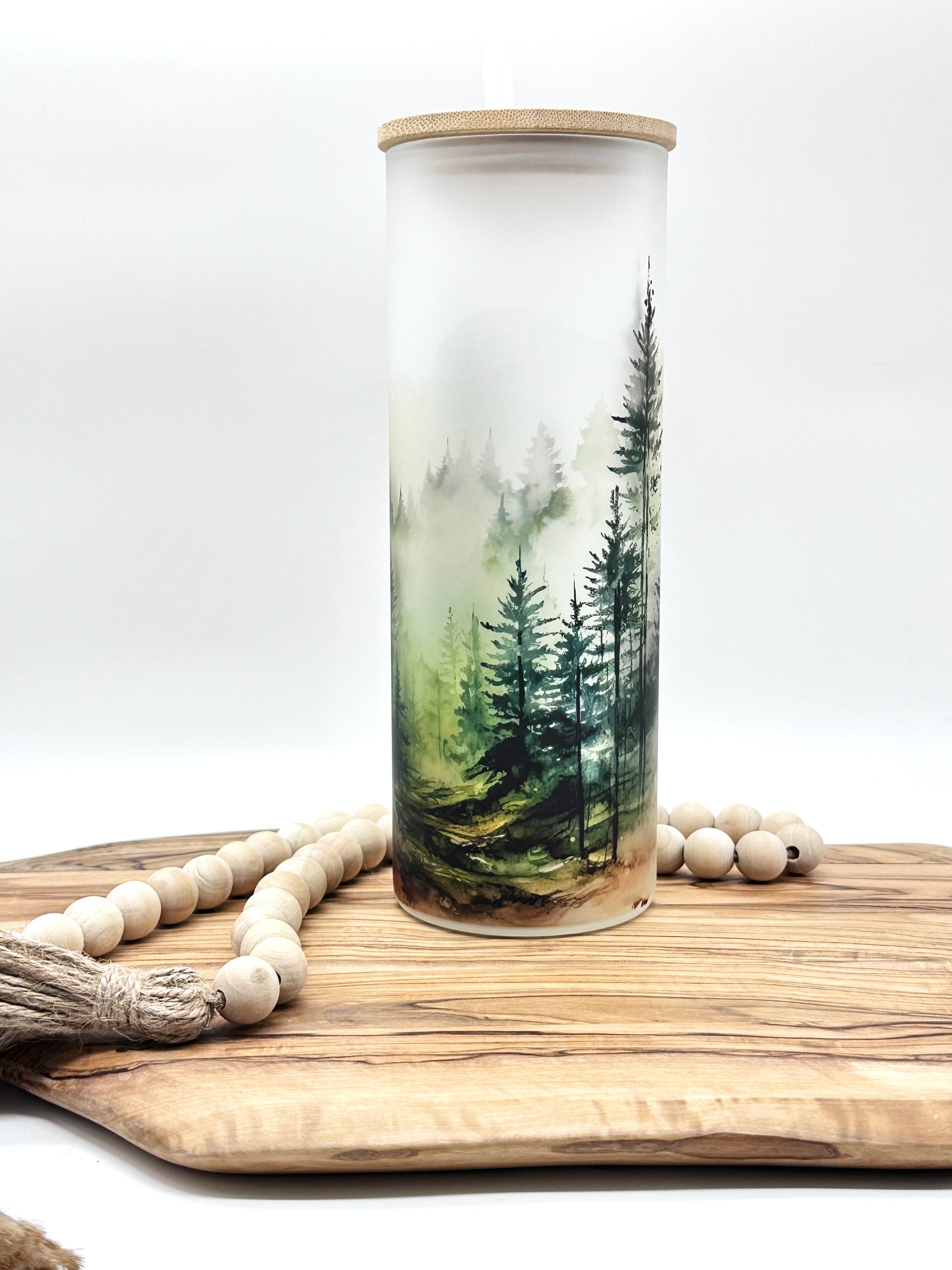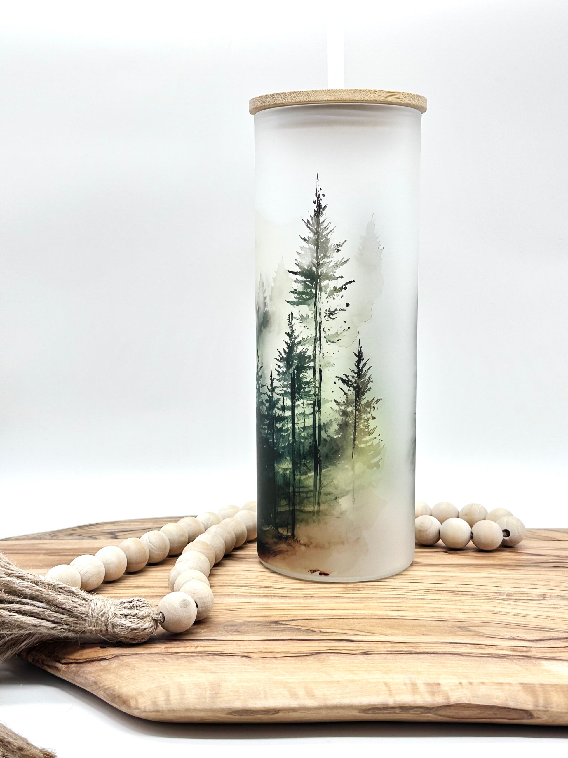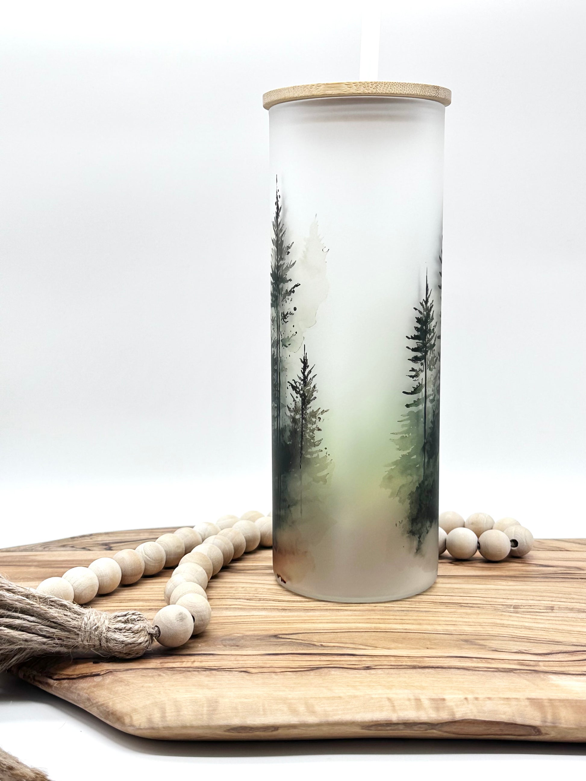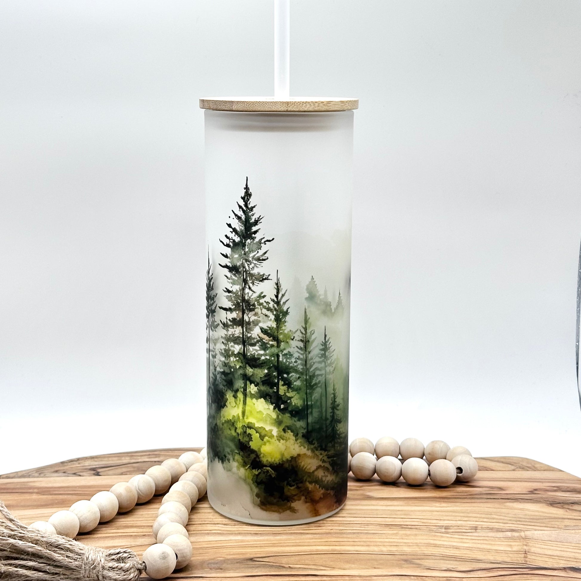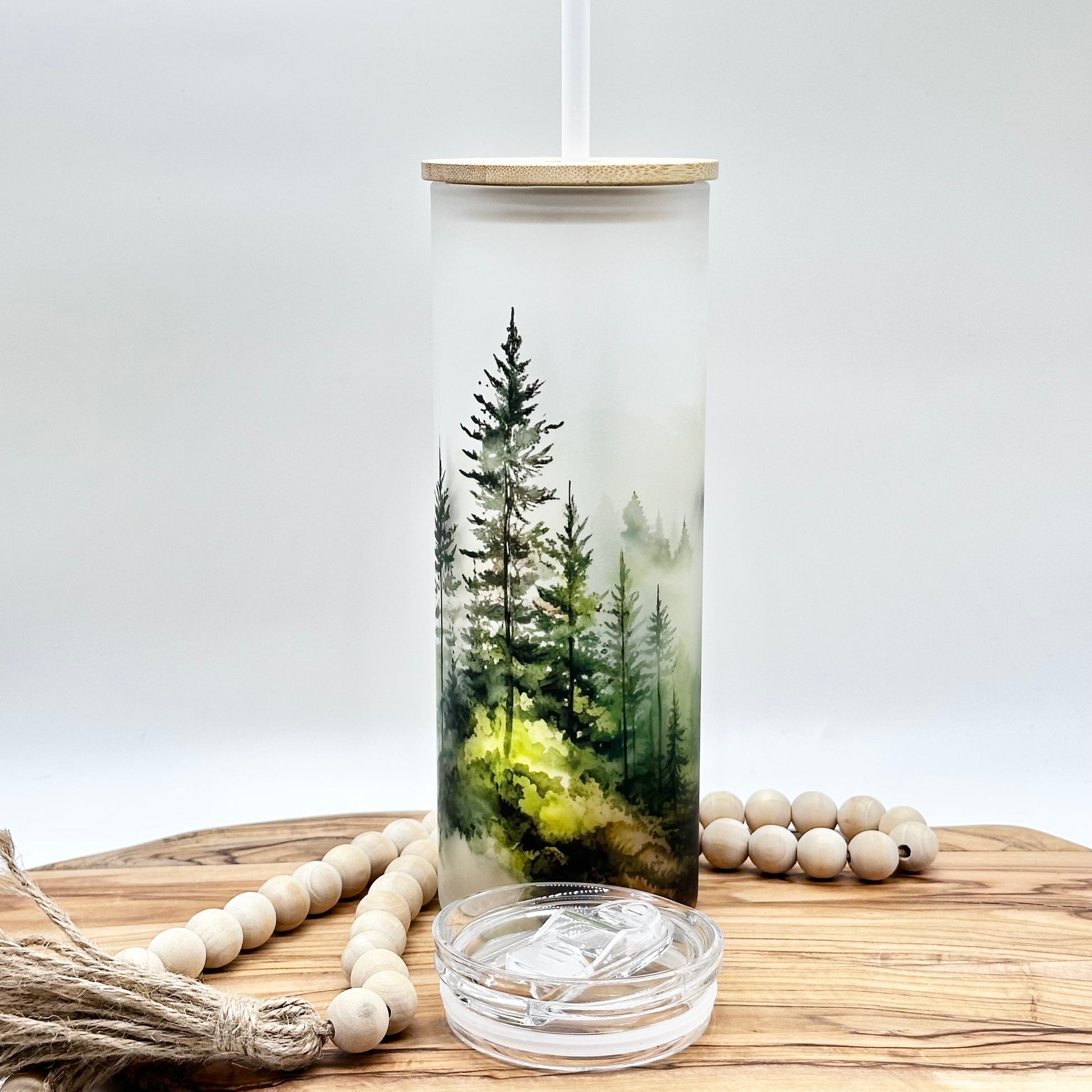This 20oz frosted glass tumbler features a beautiful watercolor forest landscape design, perfect for nature enthusiasts. It comes with both a bamboo lid and a plastic lid with a slide closure, offering versatile options for easy use. The tumbler also includes a plastic straw for convenient sipping. With its stylish and functional design, this tumbler is perfect for everyday use, whether you're enjoying a drink at home or on the go.