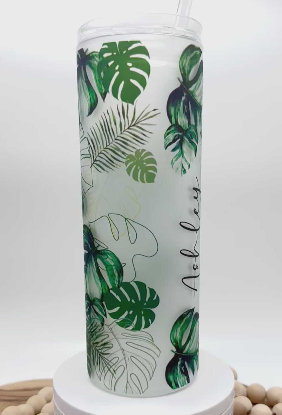 This 20oz frosted glass tumbler features a beautiful watercolor mountain landscape design, perfect for nature enthusiasts. It comes with both a bamboo lid and a plastic lid with a slide closure, offering versatile options for easy use. The tumbler also includes a plastic straw for convenient sipping. With its stylish and functional design, this tumbler is perfect for everyday use, whether you're enjoying a drink at home or on the go.