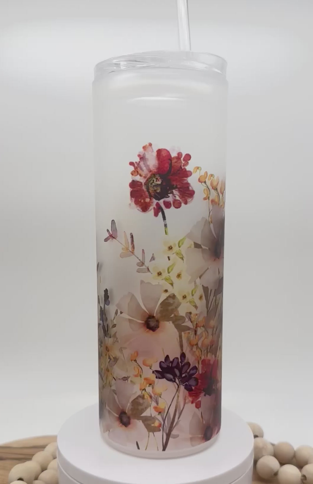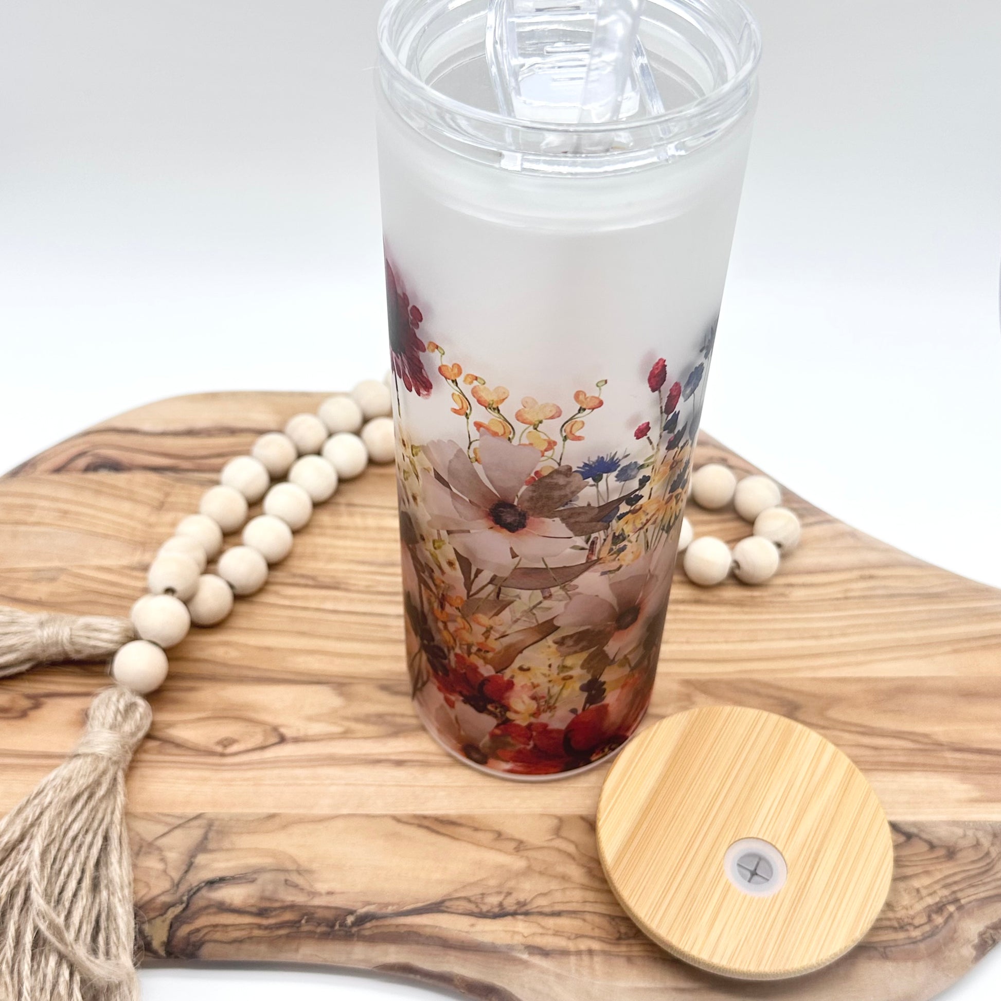 This 20oz frosted glass tumbler features a beautiful watercolor mountain landscape design, perfect for nature enthusiasts. It comes with both a bamboo lid and a plastic lid with a slide closure, offering versatile options for easy use. The tumbler also includes a plastic straw for convenient sipping. With its stylish and functional design, this tumbler is perfect for everyday use, whether you're enjoying a drink at home or on the go.