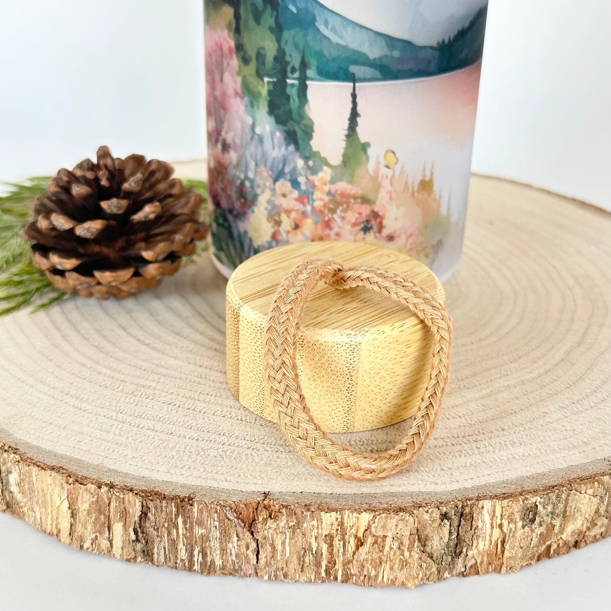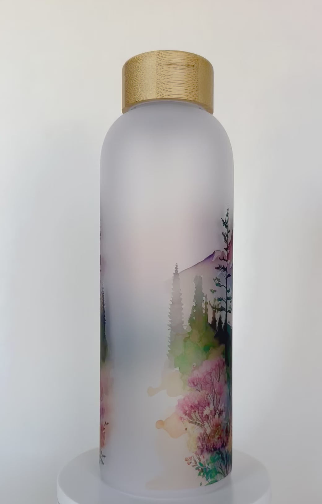Introducing our beautiful mountain wildflower frosted glass water bottle with bamboo lid! This glass water bottle has a bamboo lid that screws on and a rope handle. This makes it easy to take on-the-go, but ensures that the lid stays securely in place.
