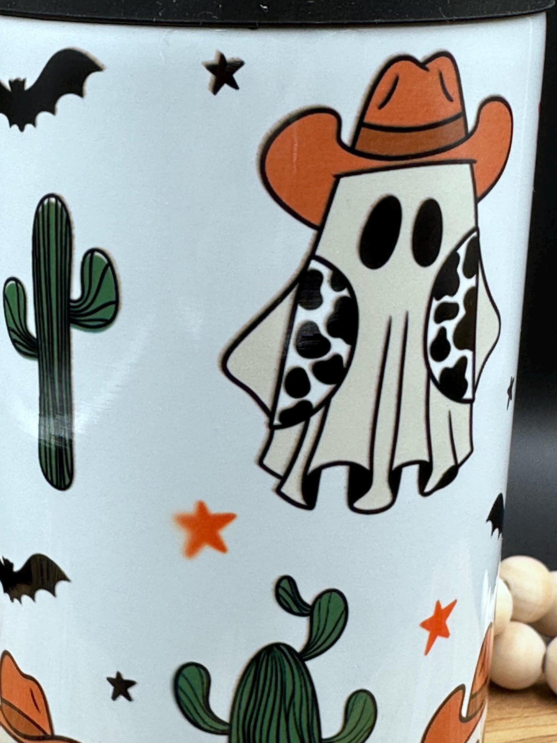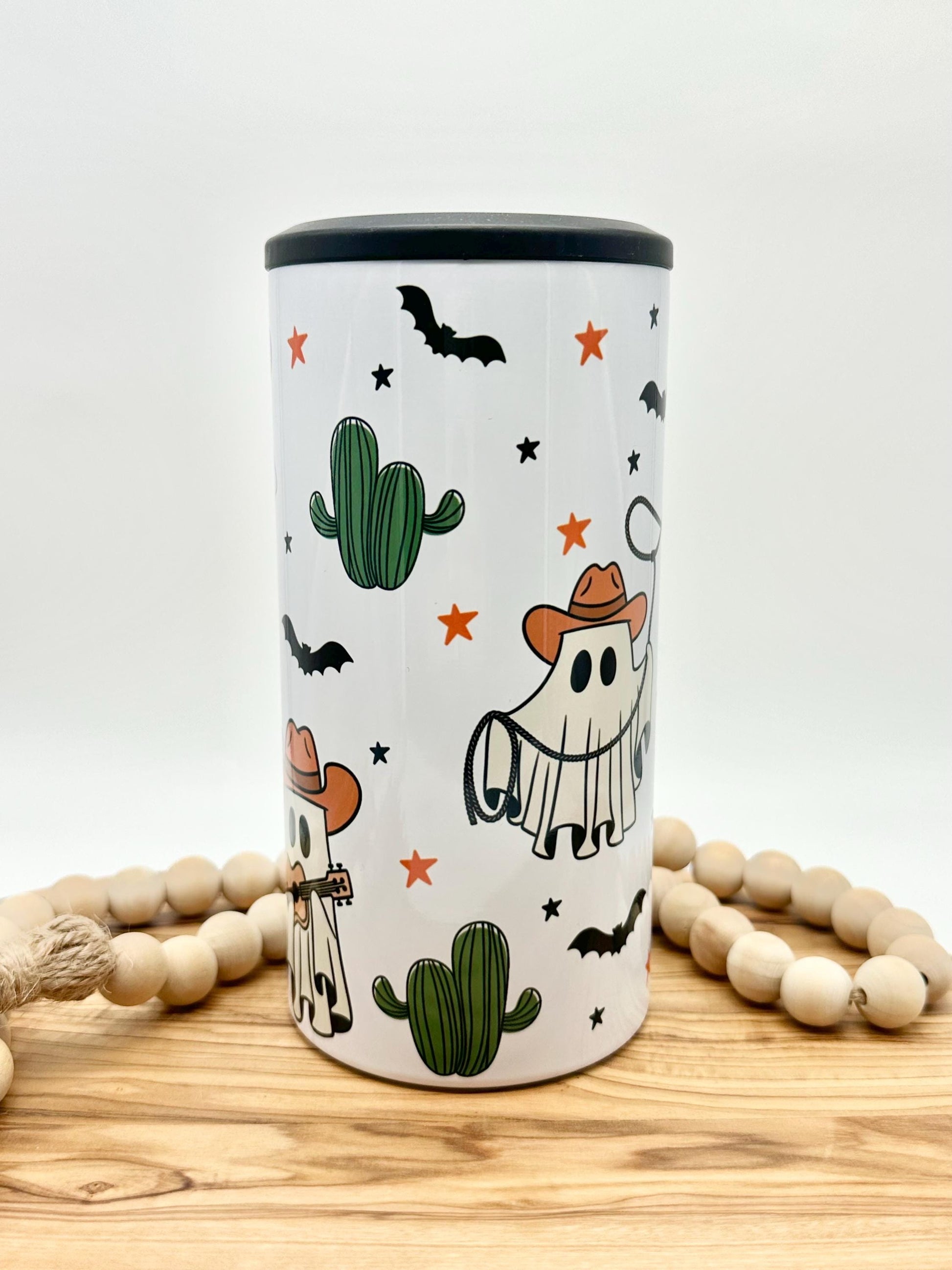 Keep your drinks cold this summer with this cute, cowboy ghost 4-in-1 insulated can cooler. This stainless steel double wall, vacuum insulated can cooler can accommodate: