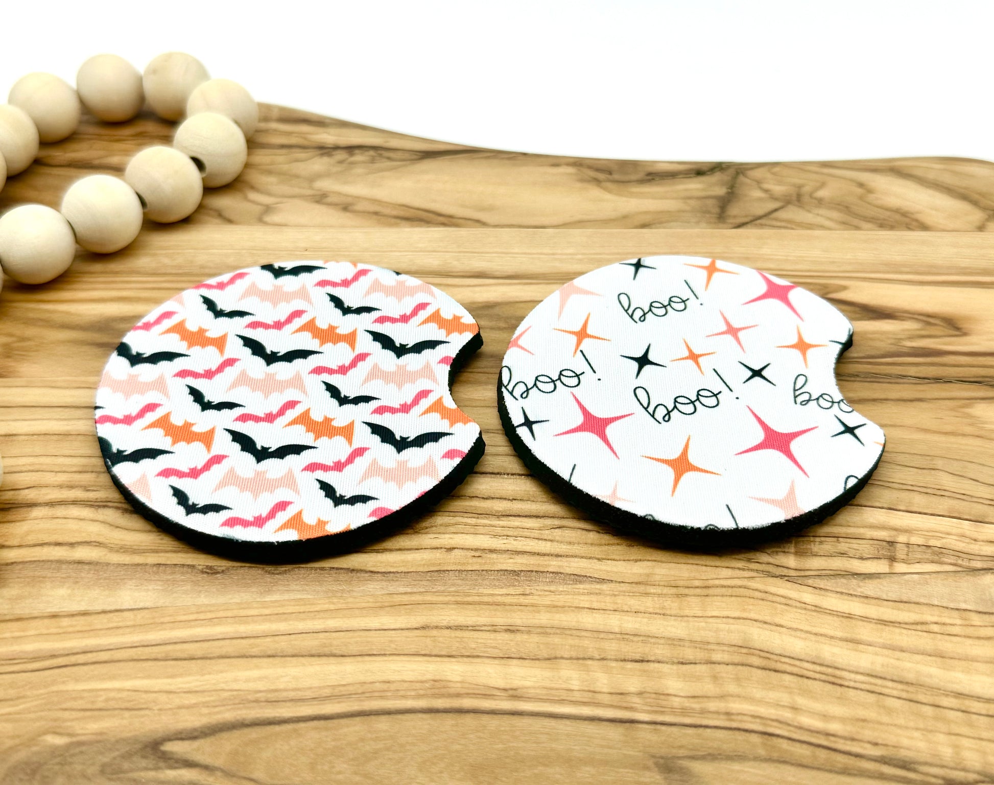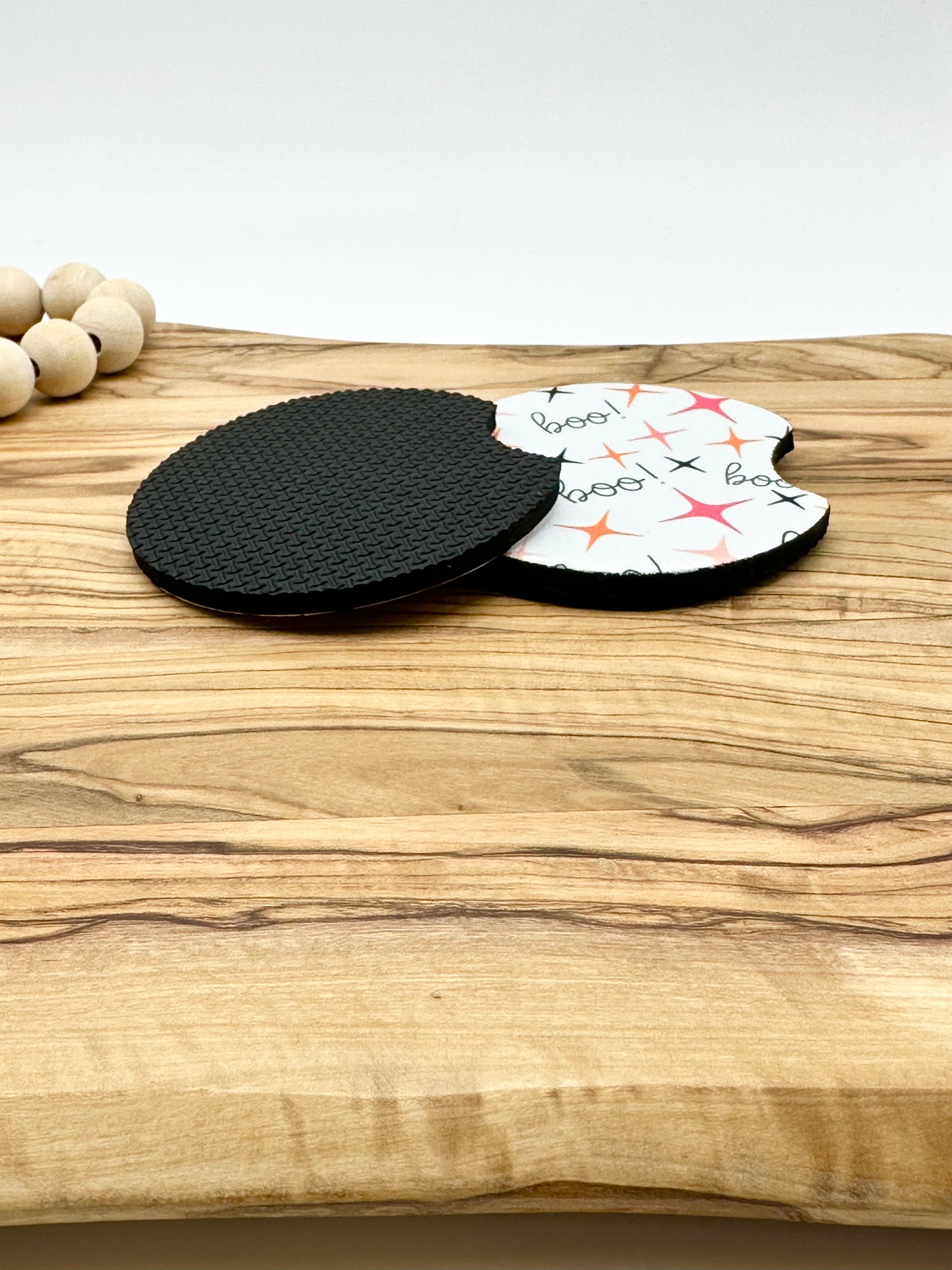 Car coasters are a great way to help keep your car or couch cupholders clean. These car coasters are made with a neoprene material. These are similar to mousepads, and have a rubber bottom and a polyester top.