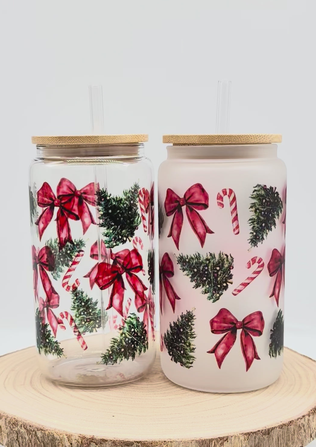 This Christmas themed glass tumbler has a capacity of 16 fluid ounces and includes a bamboo lid and your choice of a plastic or glass straw. This cute cup is available in either frosted or clear glass. Images are infused into the surface and are not a sticker decal, so they won’t peel off over time.