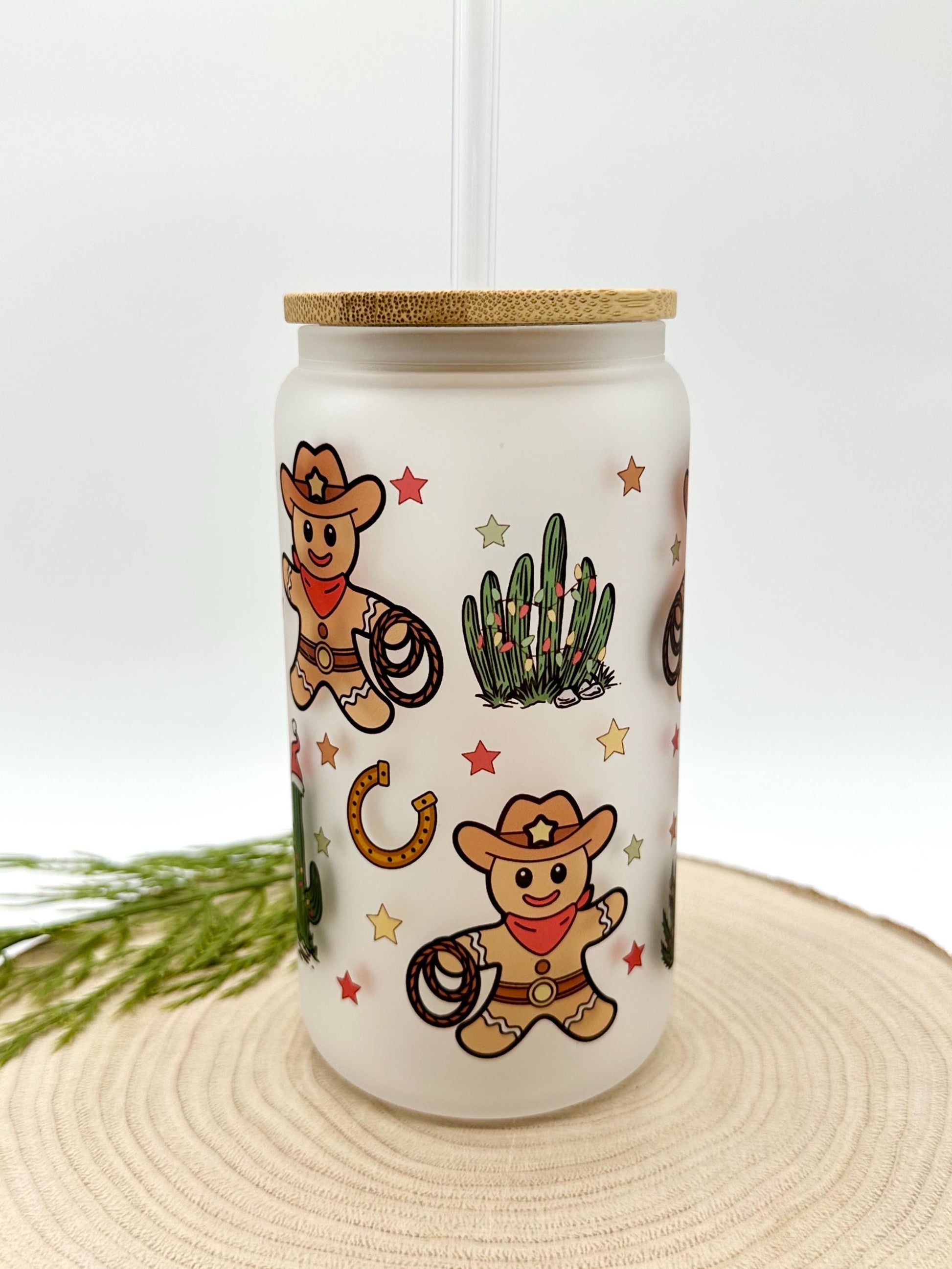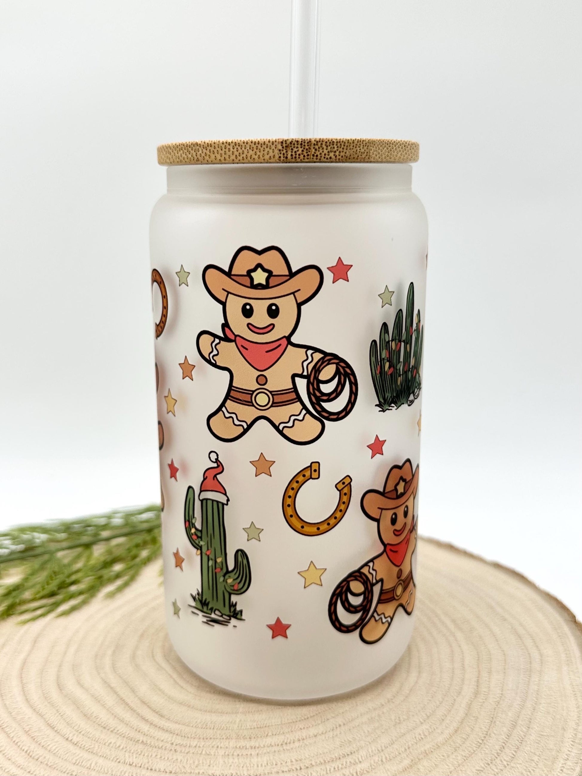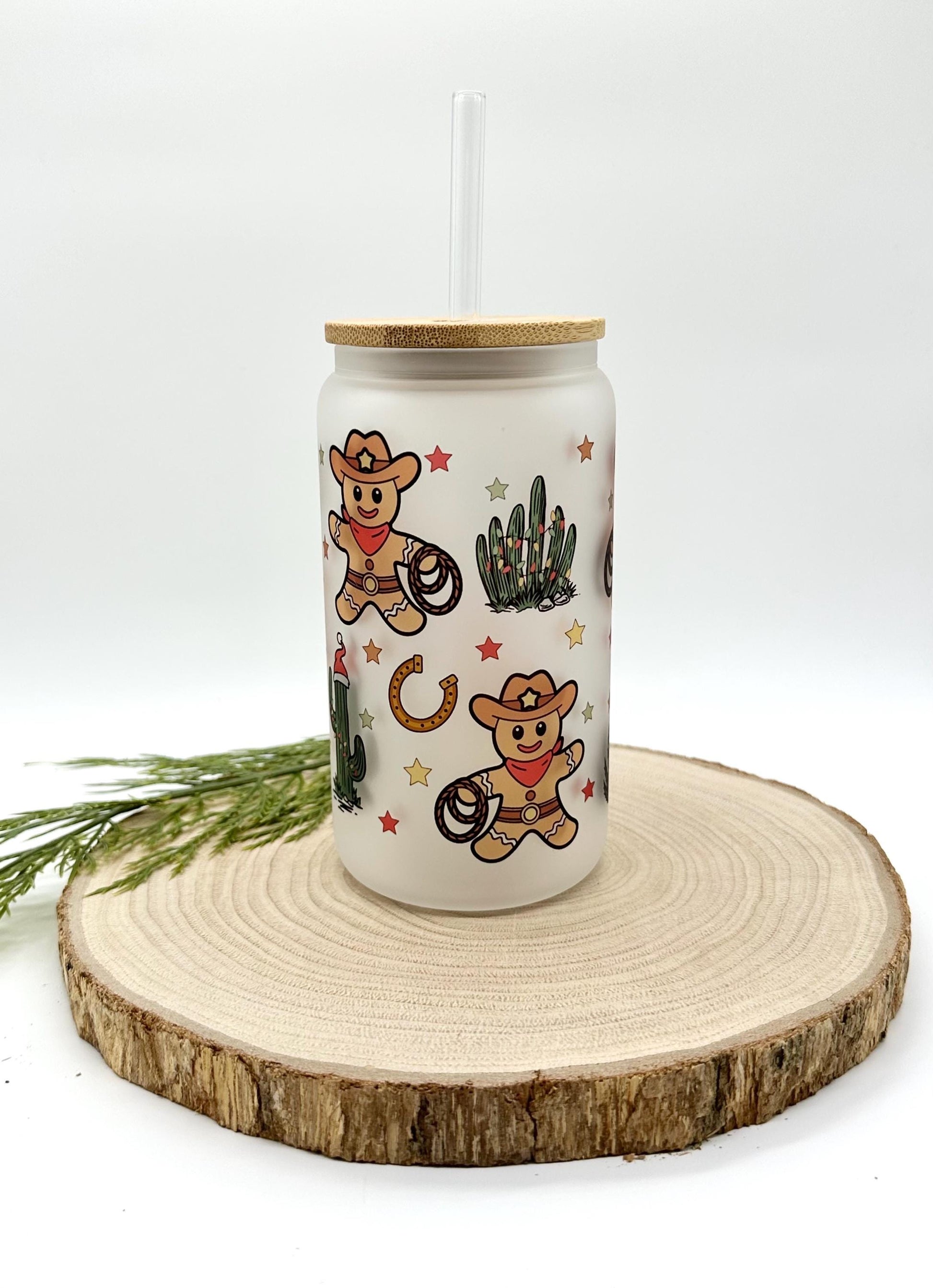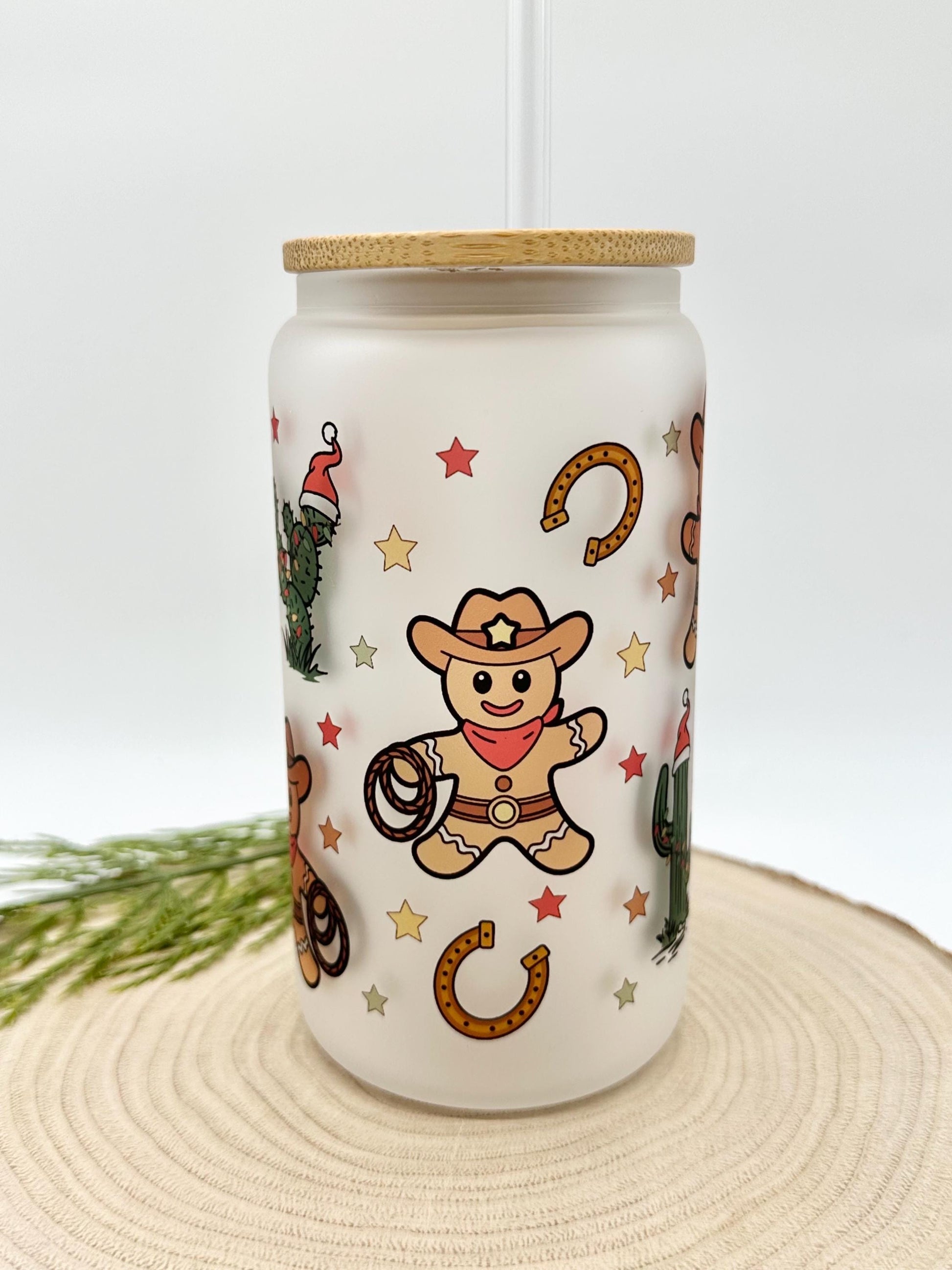 Gingerbread Man Iced Coffee Cup - 16oz Christmas Frosted Glass Tumbler with Lid and Straw