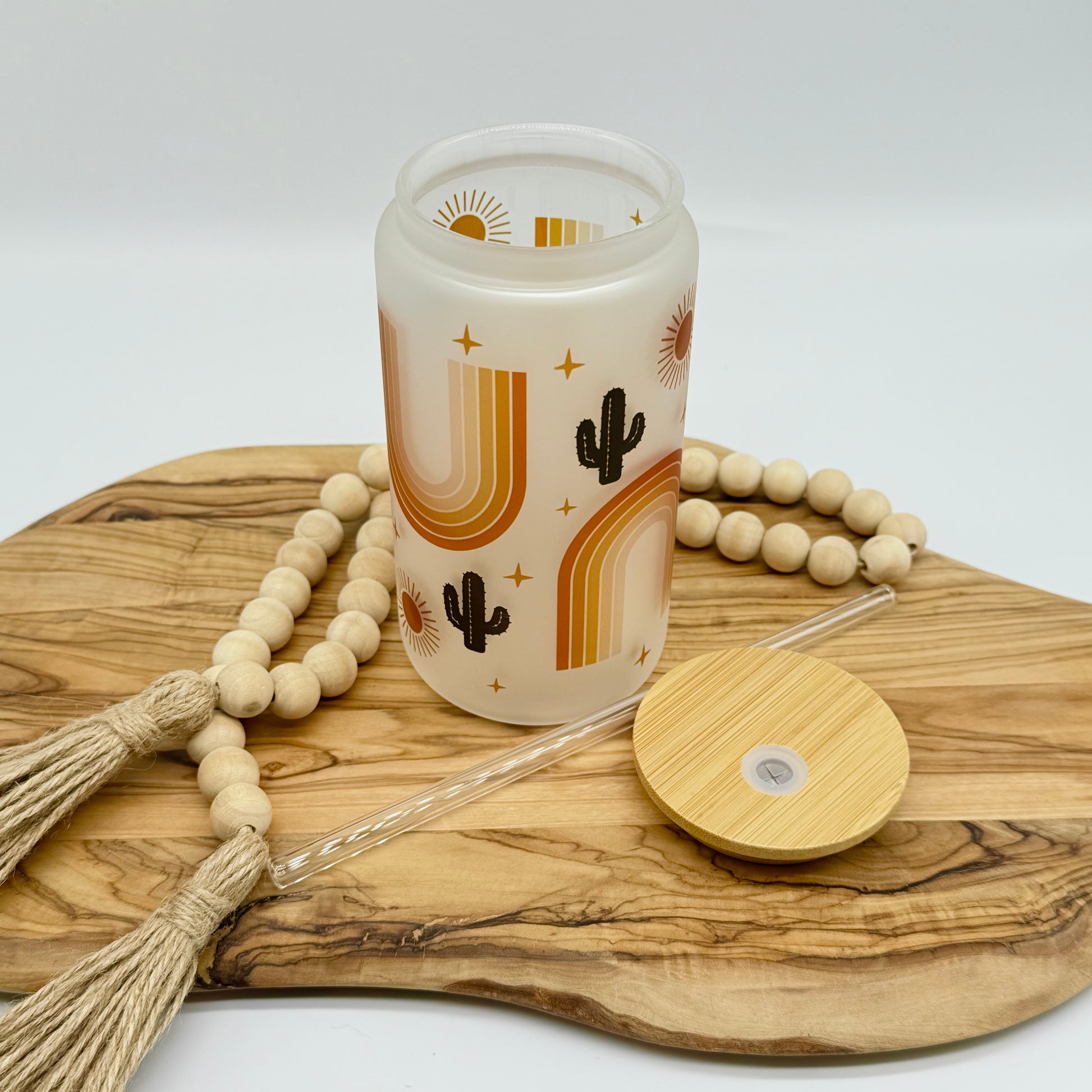 This cute, Boho glass tumbler is the perfect way to enjoy your favorite cold drink. The bamboo lid and straw make it easy to take your drink on the go.