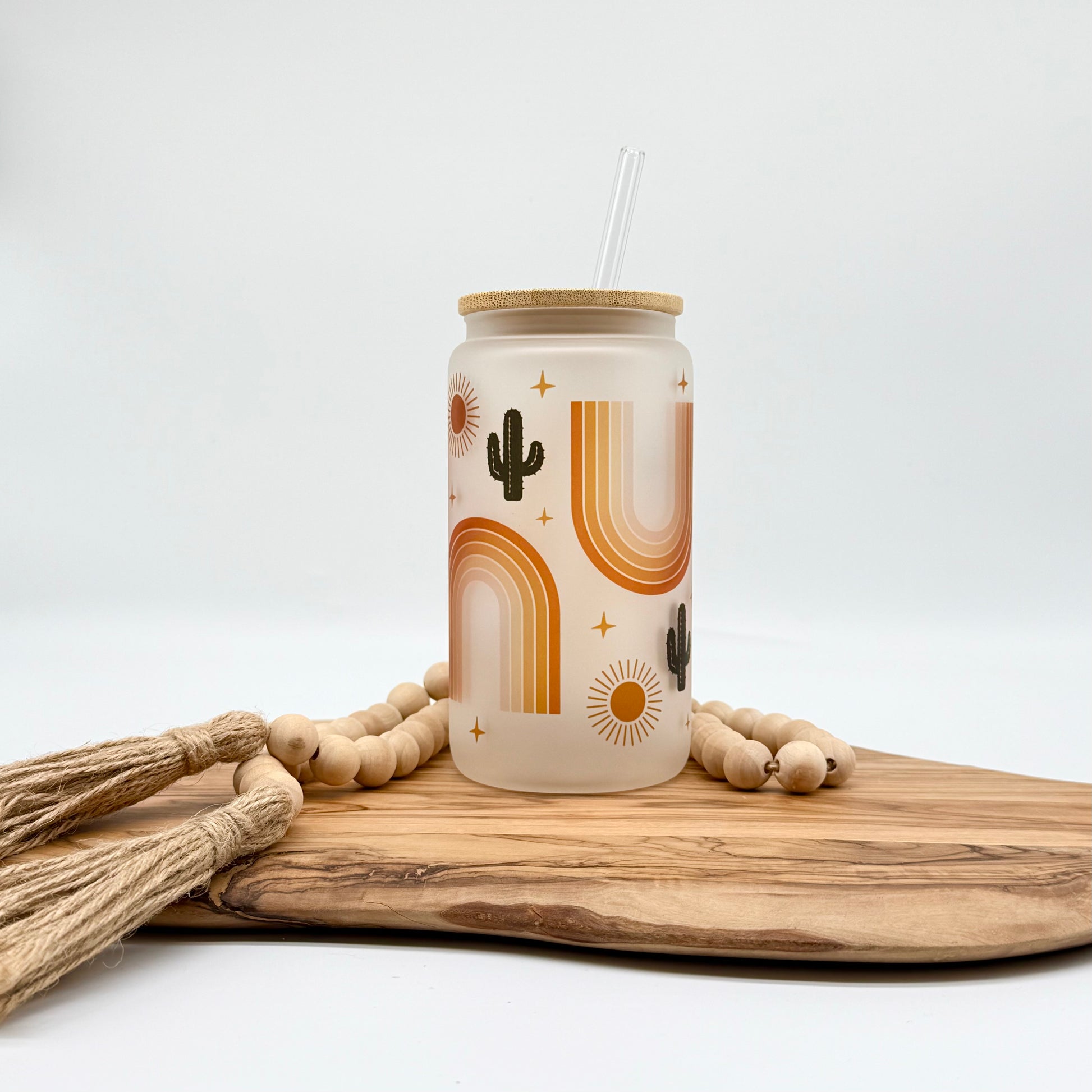 Cactus Rainbow Iced Coffee Cup- 16oz Boho Frosted Glass Tumbler with Lid and Straw
