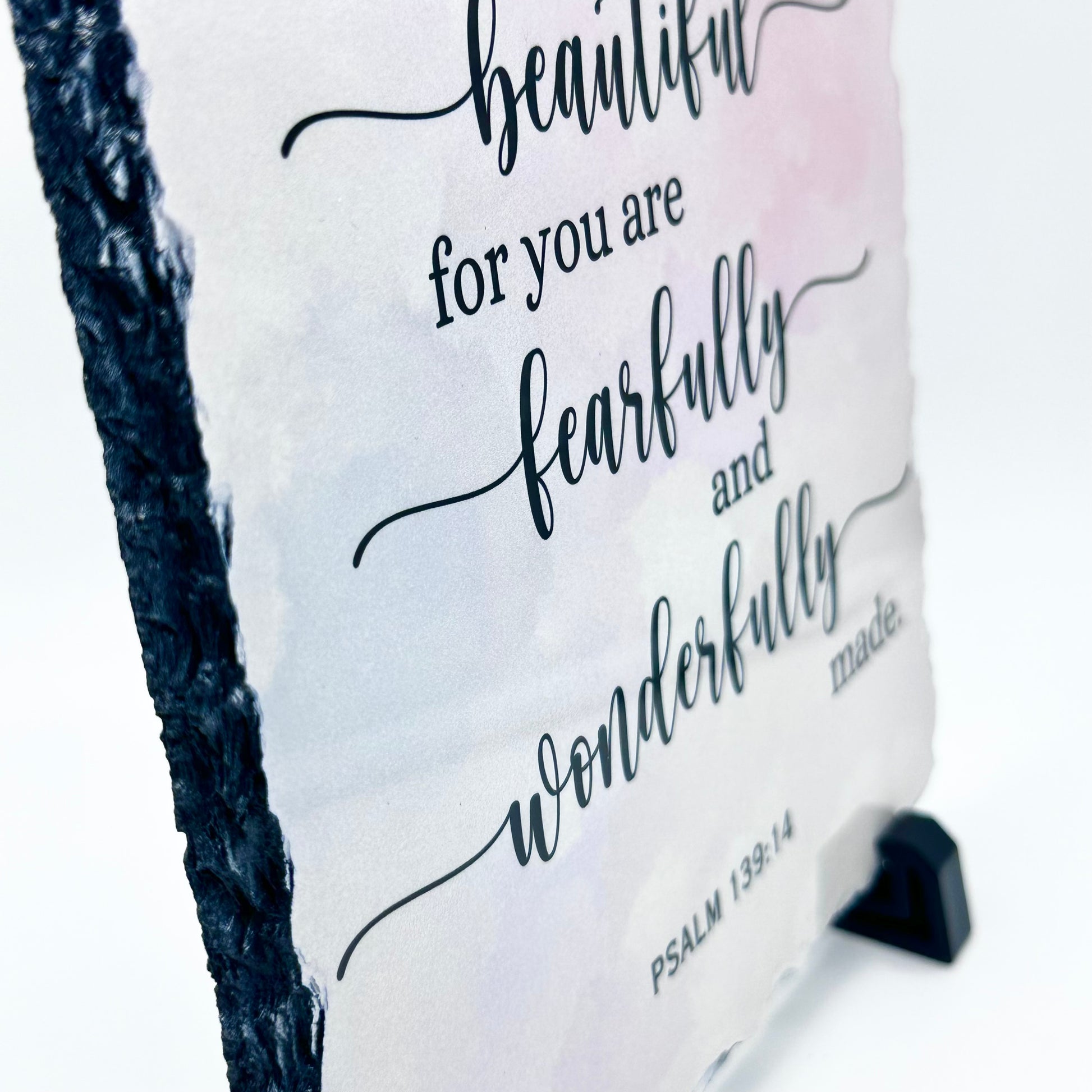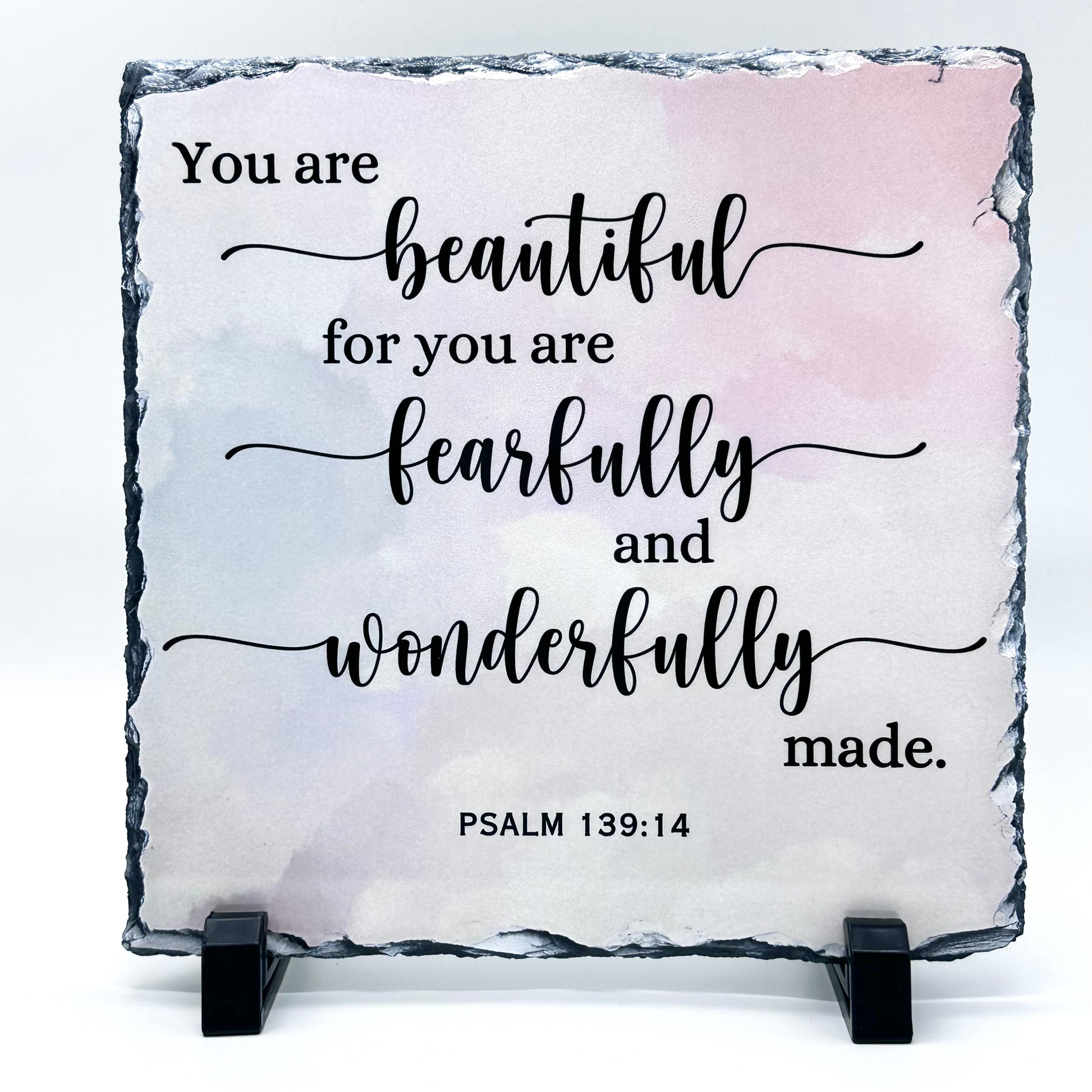 Add a touch of inspiration and elegance to any space with our 8x8 inch slate. Available in two beautiful designs, each featuring a meaningful Bible verse to uplift and encourage.