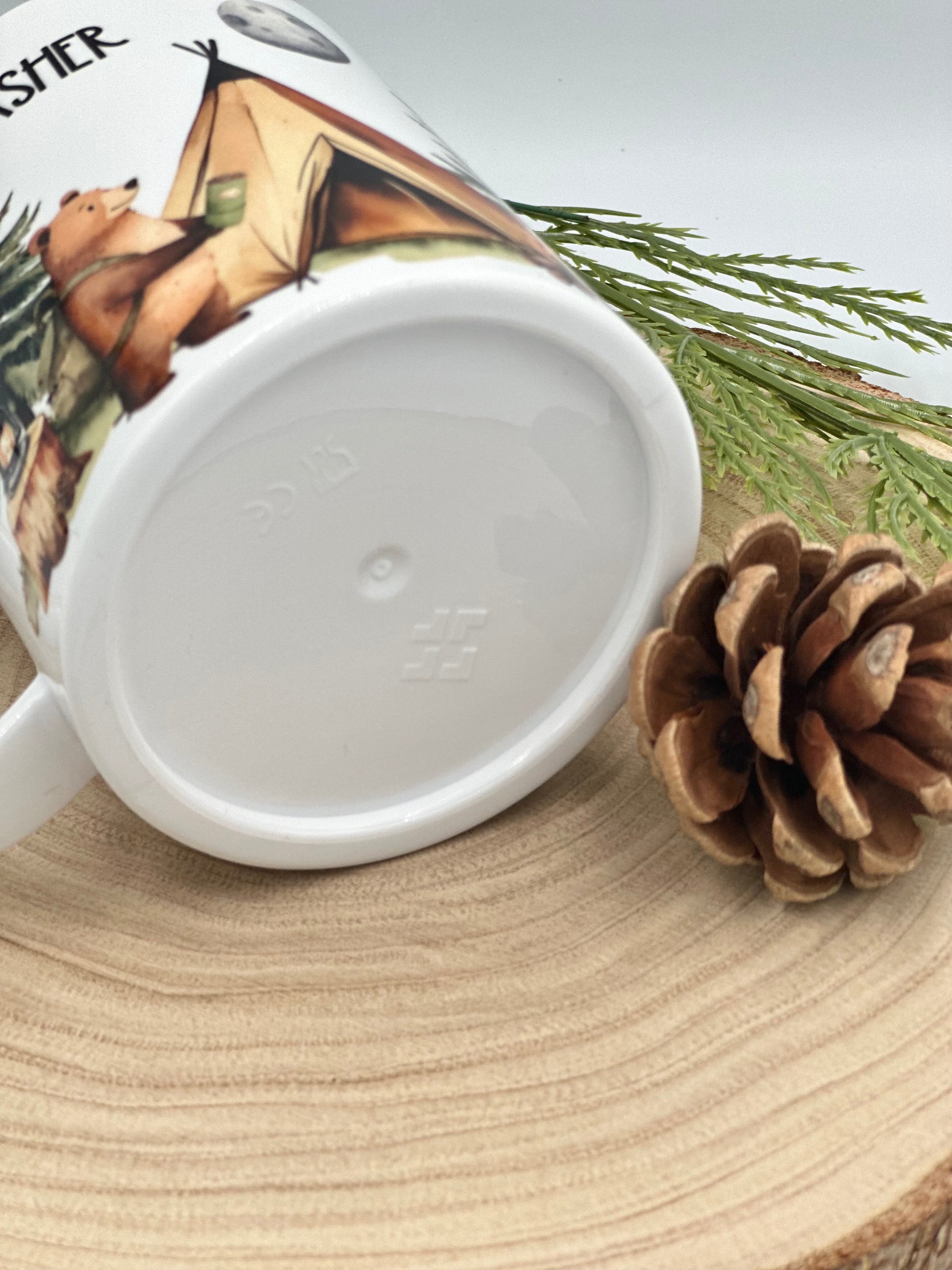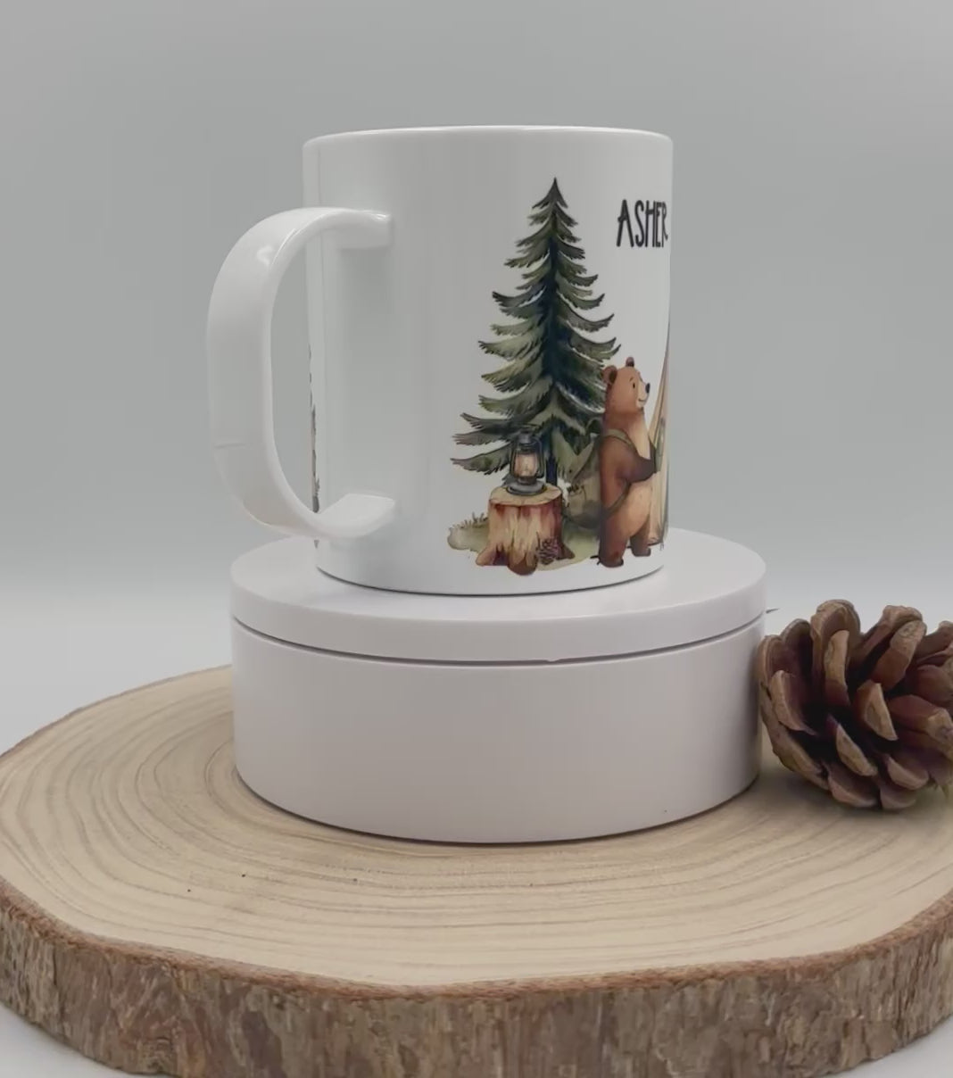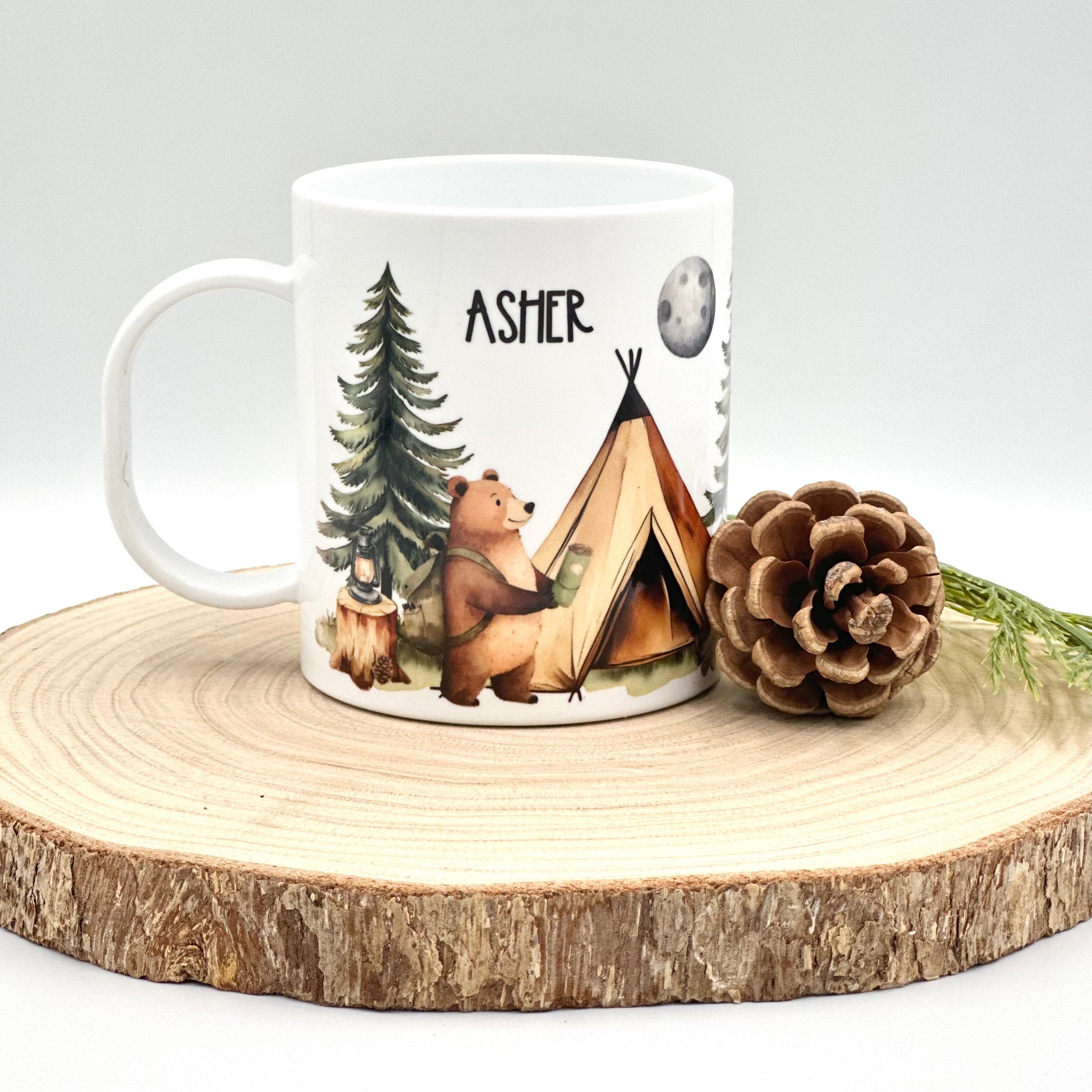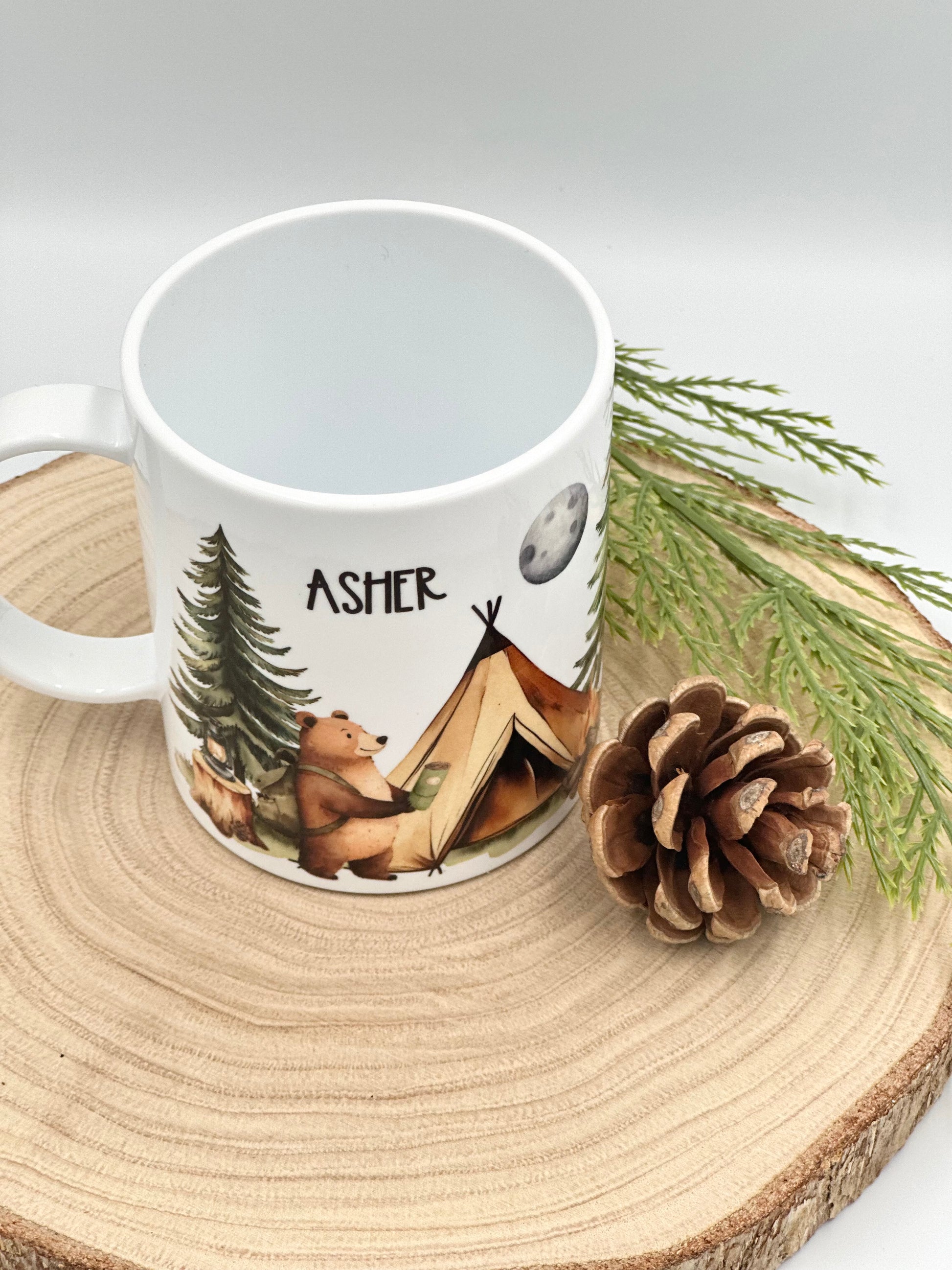 Custom Kids Camping Mug – 11oz Durable Plastic Mug with Bear and Tent Design, Personalized with Name
