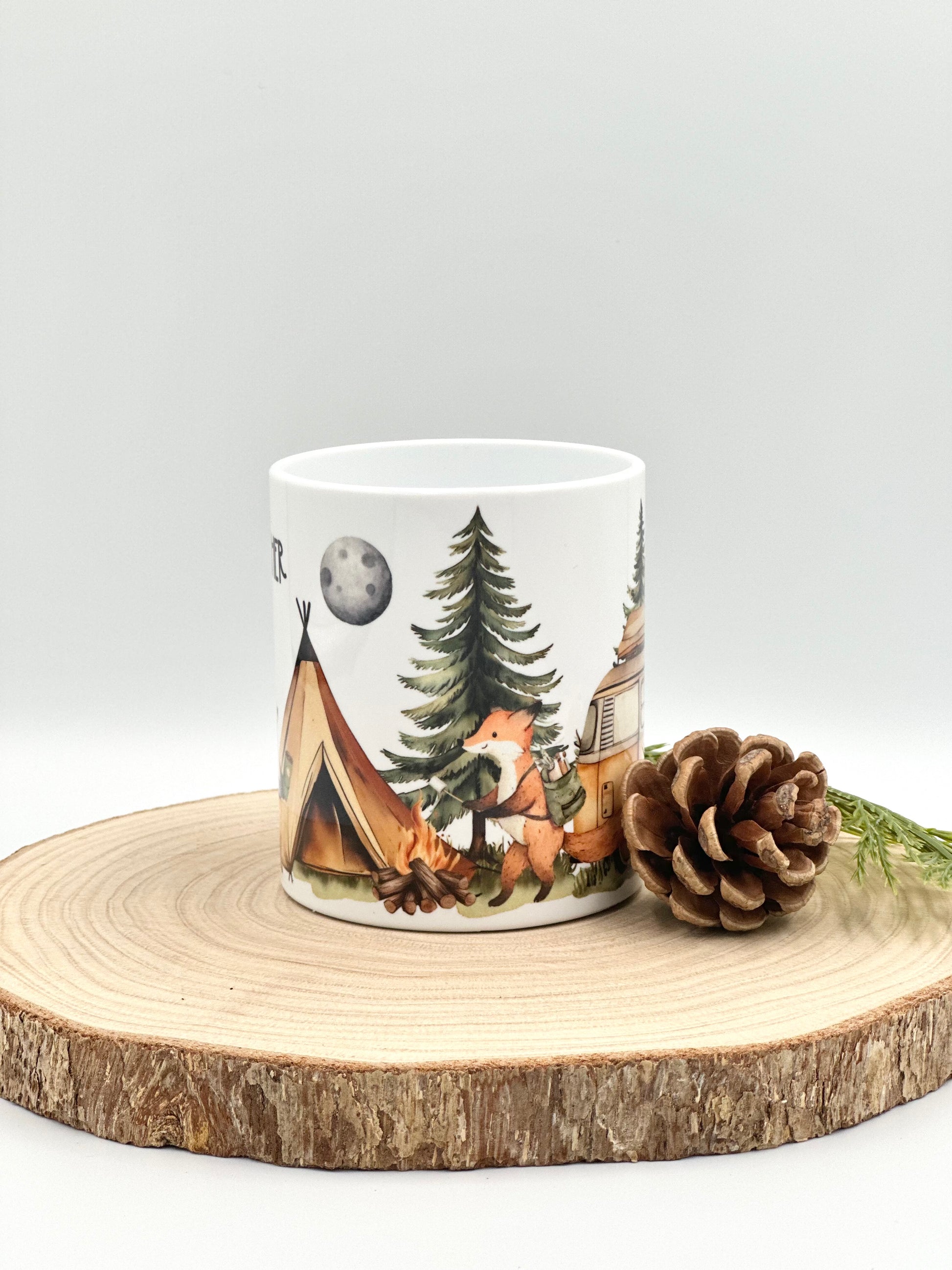 This 11oz kids camping mug is made from thick, durable plastic that is shatterproof, BPA-free, and lightweight, making it safe for everyday use. Featuring a playful bear, tent, and forest design, it can be personalized with your child’s name, creating a unique and practical gift.