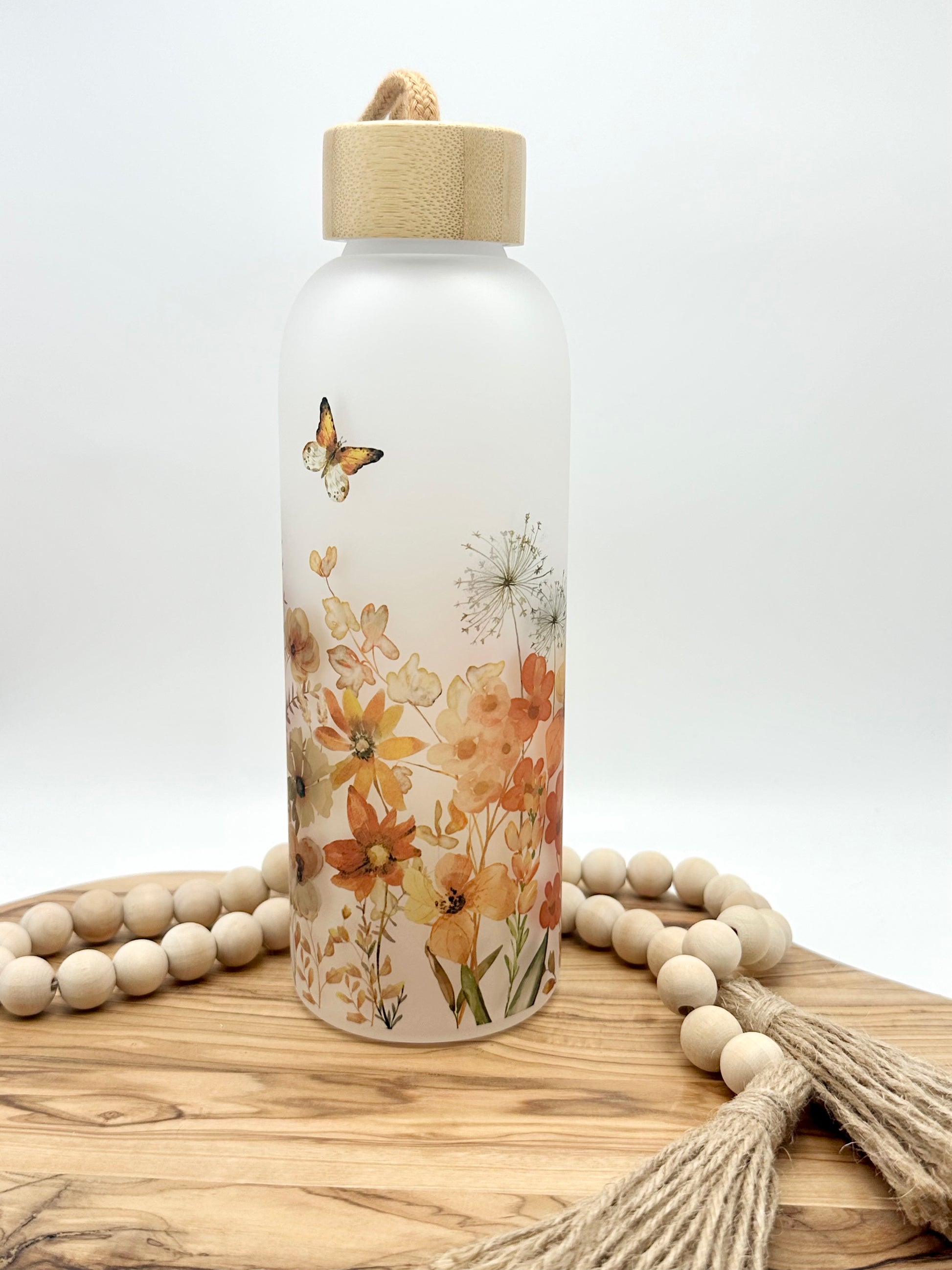Introducing our colorful fall floral frosted glass water bottle with bamboo lid! This glass water bottle has a capacity of 25 fluid ounces and includes a bamboo lid that twists on and off. This makes it easy to take on-the-go. The frosted glass gives a unique and elegant touch, while the pretty floral image adds a touch of natural beauty to your drinkware collection.