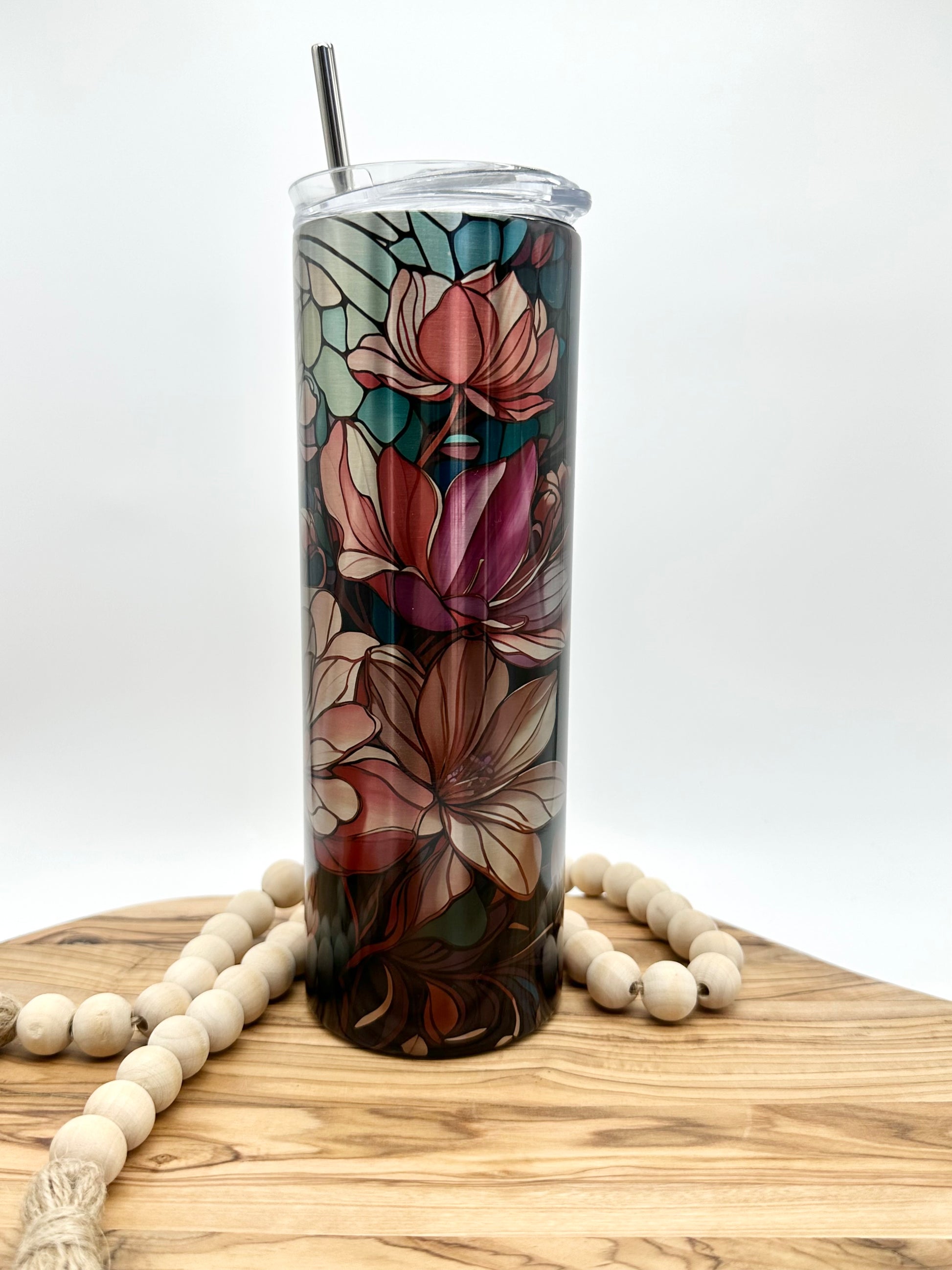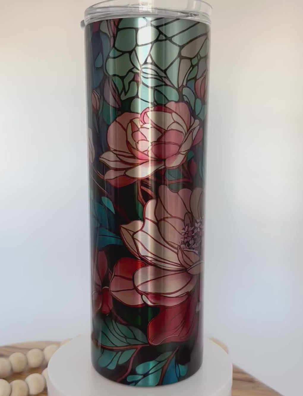 This pretty, floral stainless steel tumbler is a great way to enjoy your favorite hot or cold beverages. It will keep your drinks hot or cold for hours. This 20oz insulated stainless steel tumbler's image is added using sublimation, which means the design is permanently printed onto the tumbler and won't peel off over time like vinyl.