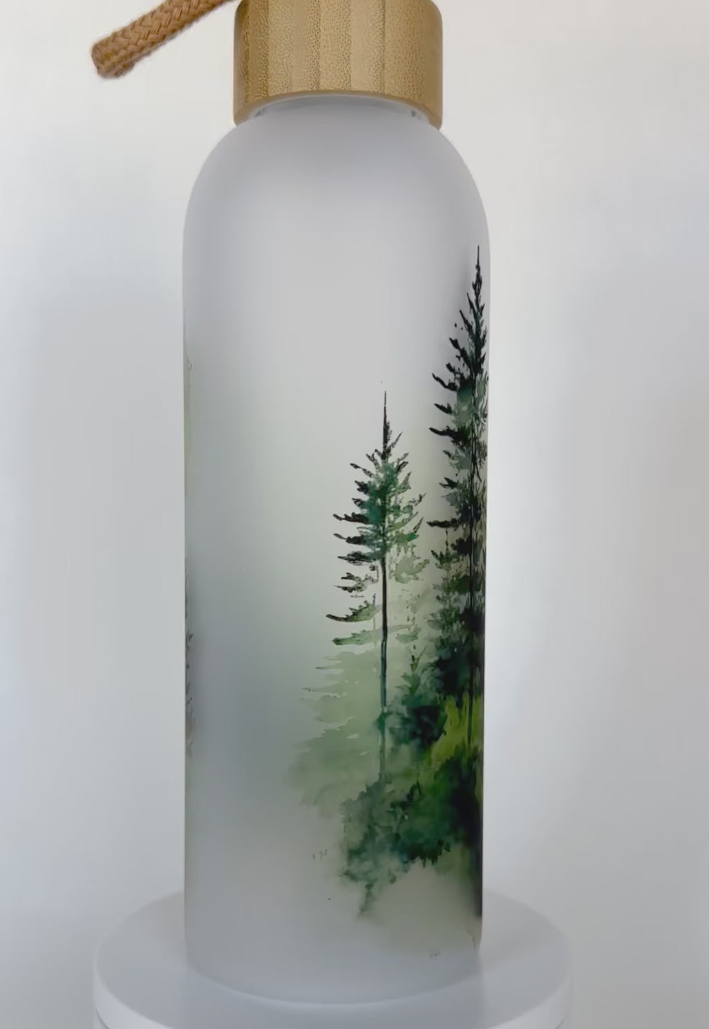Introducing our beautiful mountain wildflower frosted glass water bottle with bamboo lid! This glass water bottle has a bamboo lid that screws on and a rope handle. This makes it easy to take on-the-go, but ensures that the lid stays securely in place.