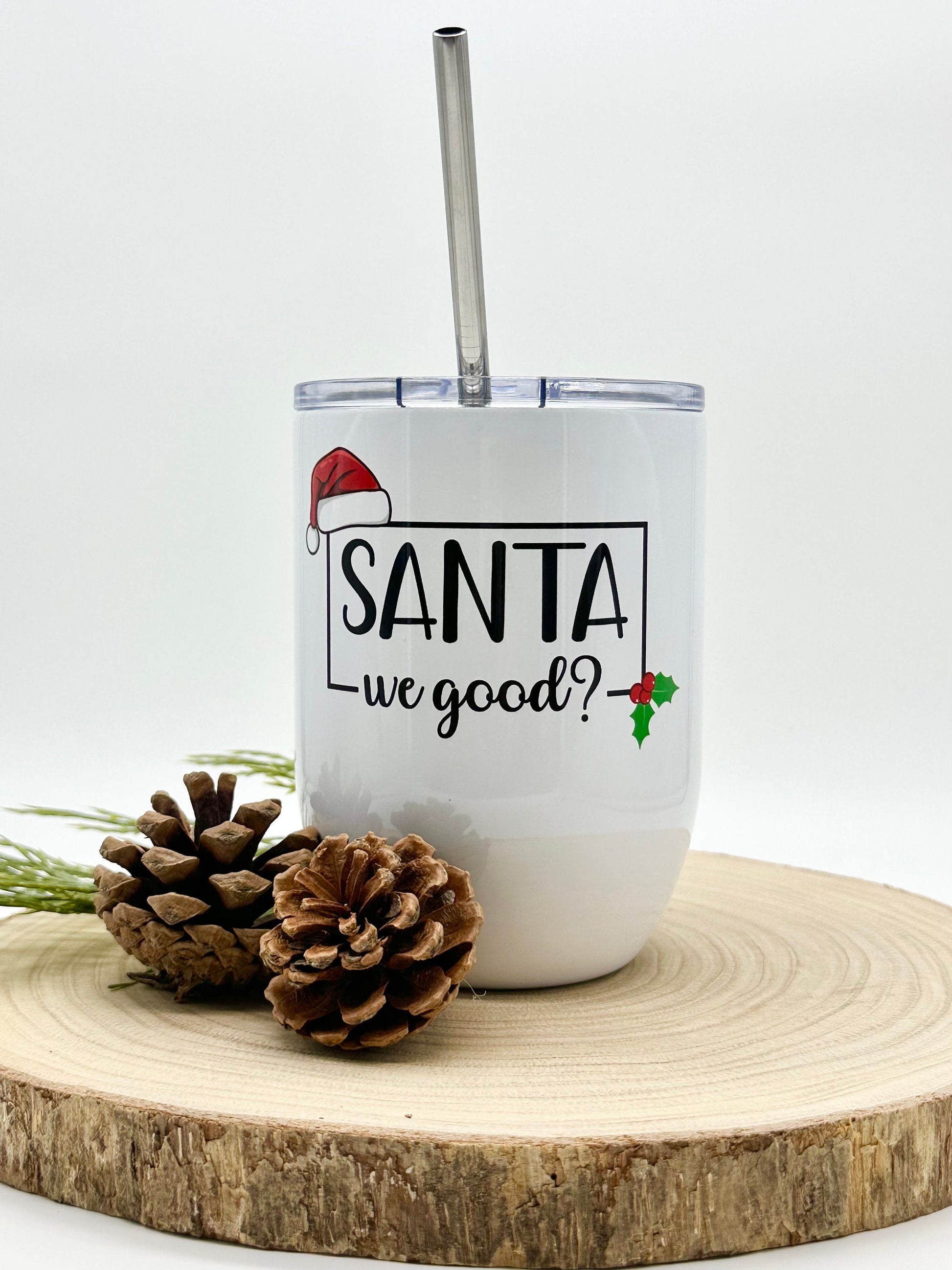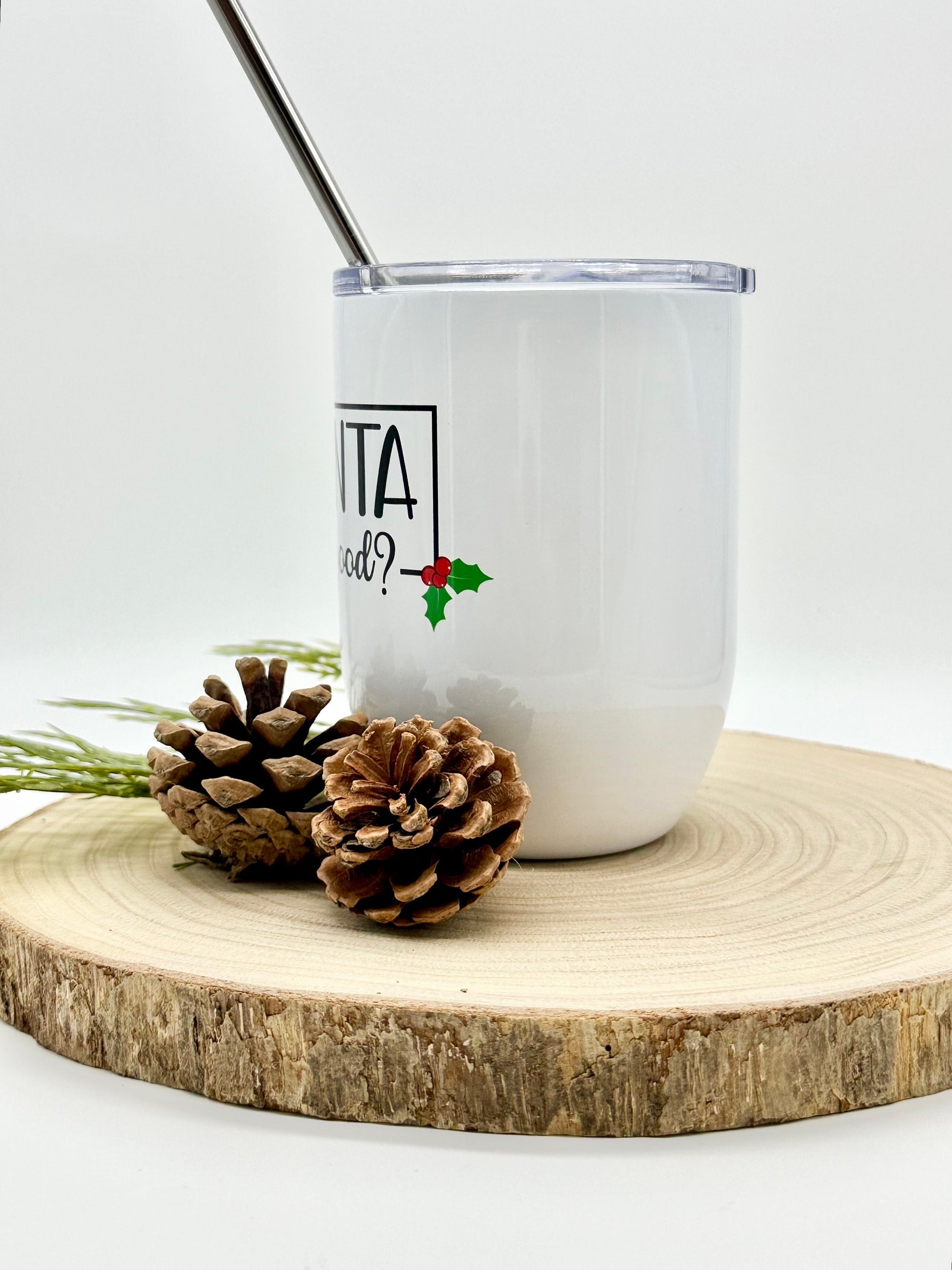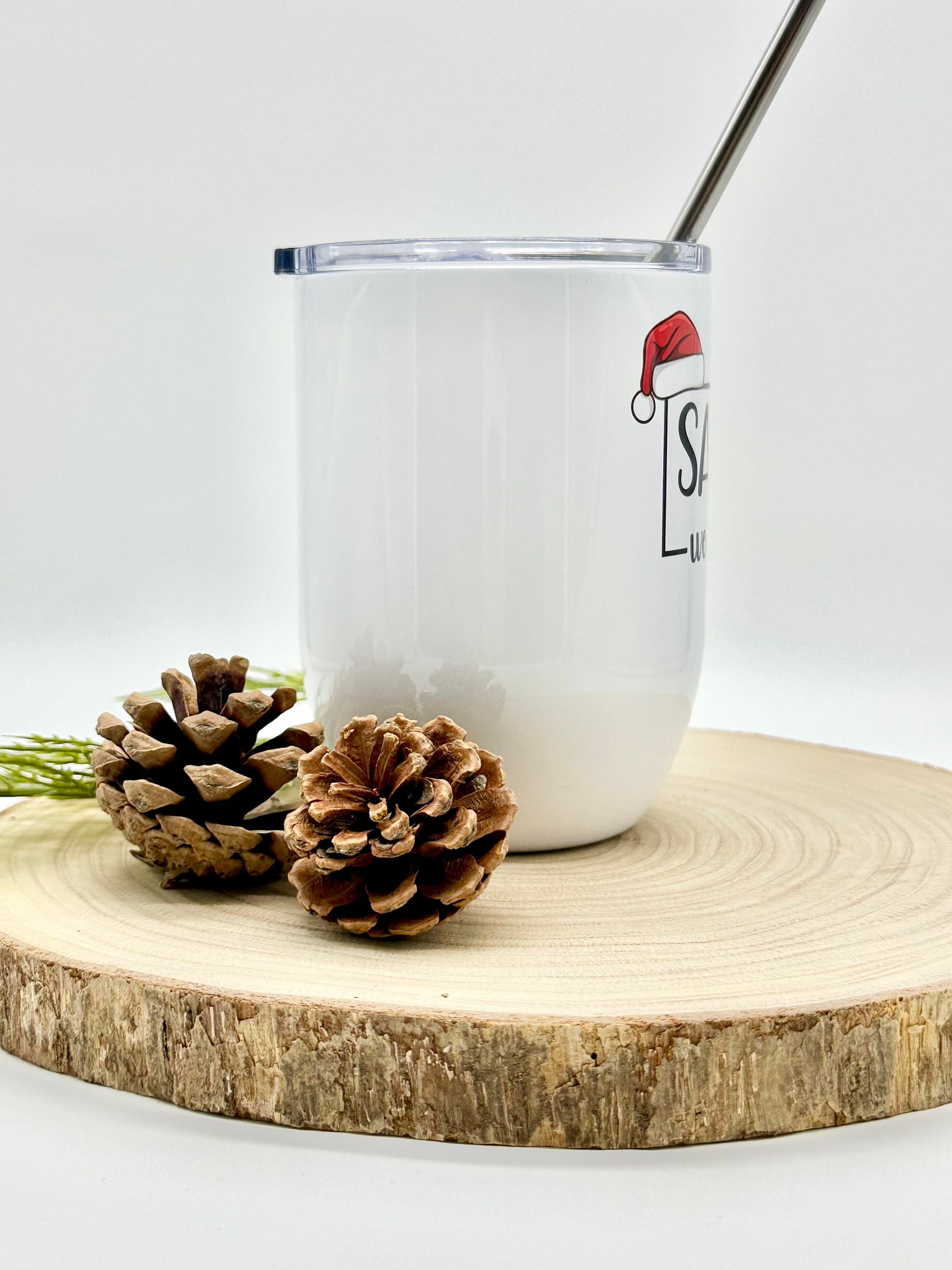 This 15oz insulated wine glass is perfect for the holiday season. This glass is stainless steel and is insulated and vacuum sealed to keep your drinks hot or cold for hours. This wine tumbler includes a plastic lid with slide closure, and also a stainless steel straw. The funny Christmas themed image would make this cup a perfect gift for a friend or coworker.