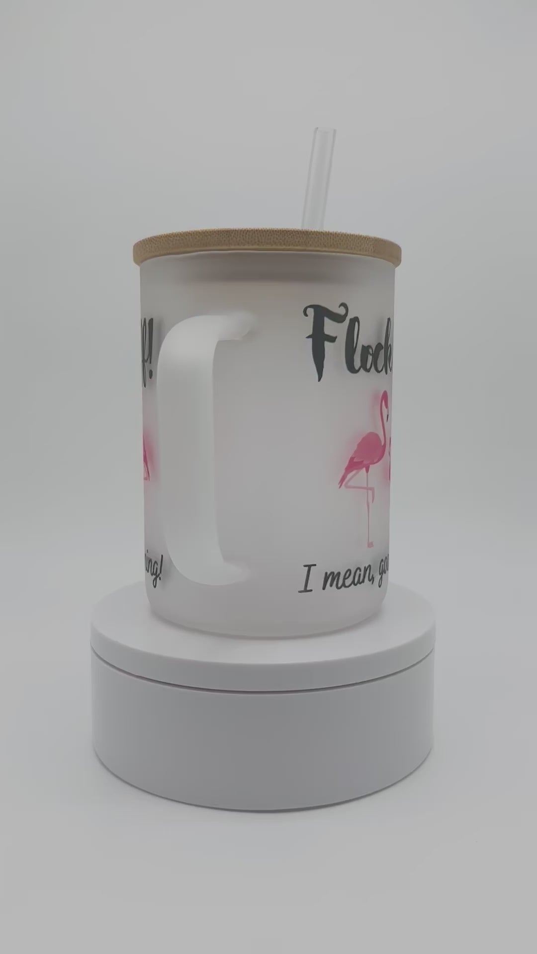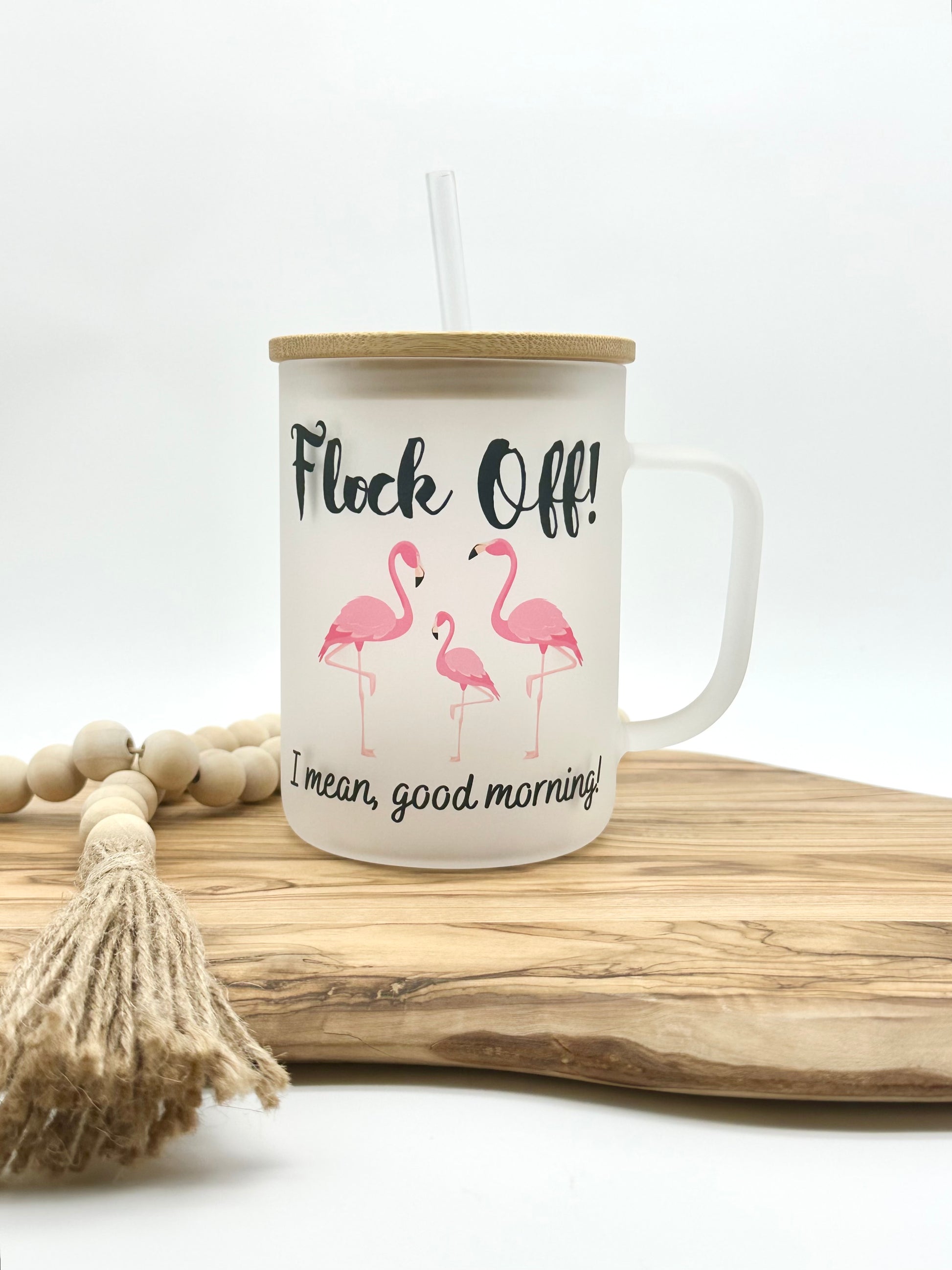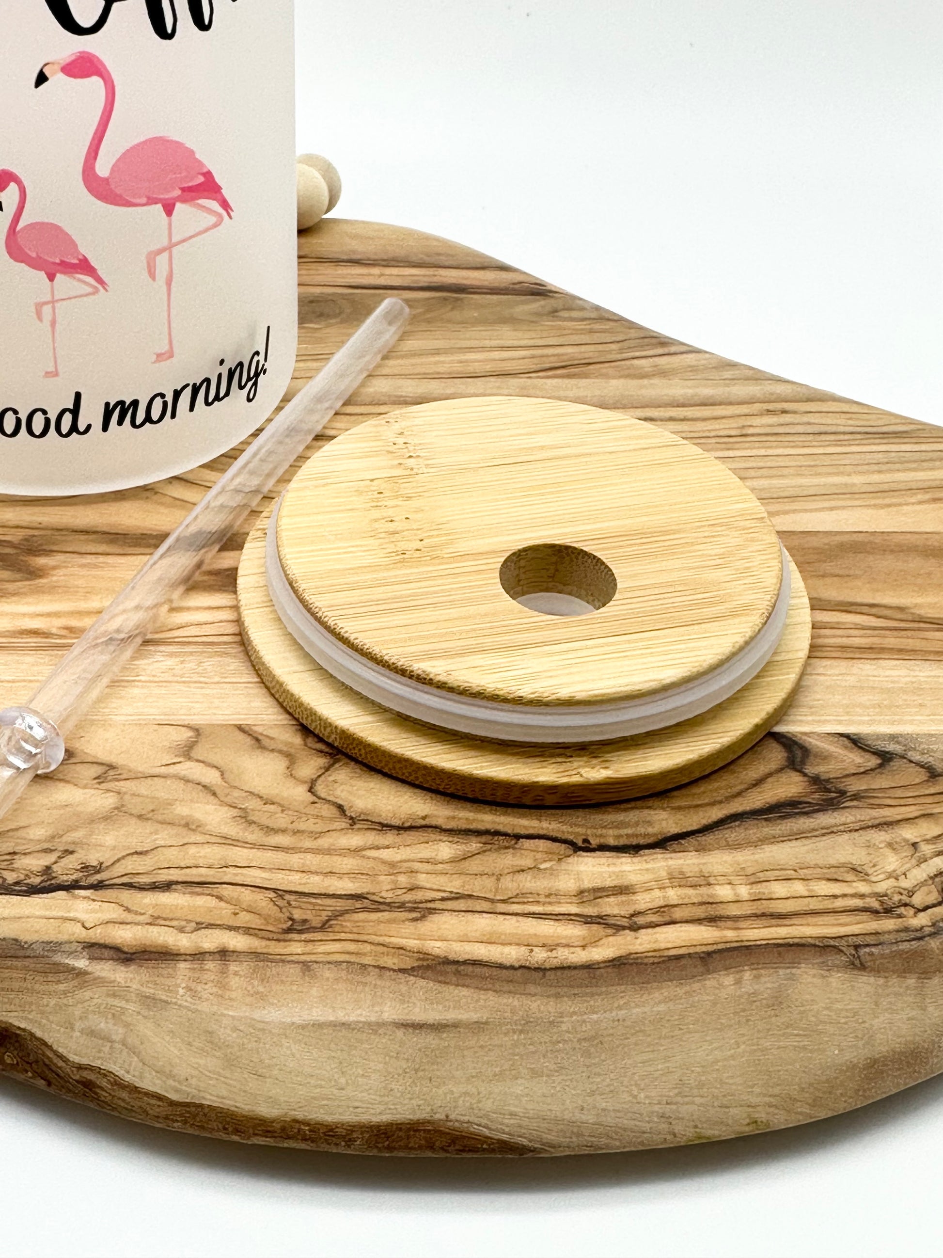 Introducing our 15oz frosted glass frosted mug with a bamboo lid and plastic straw. The bamboo lid and straw make it easy to take your drink on the go! There is a silicone ring around the lid to help keep it firmly in place.