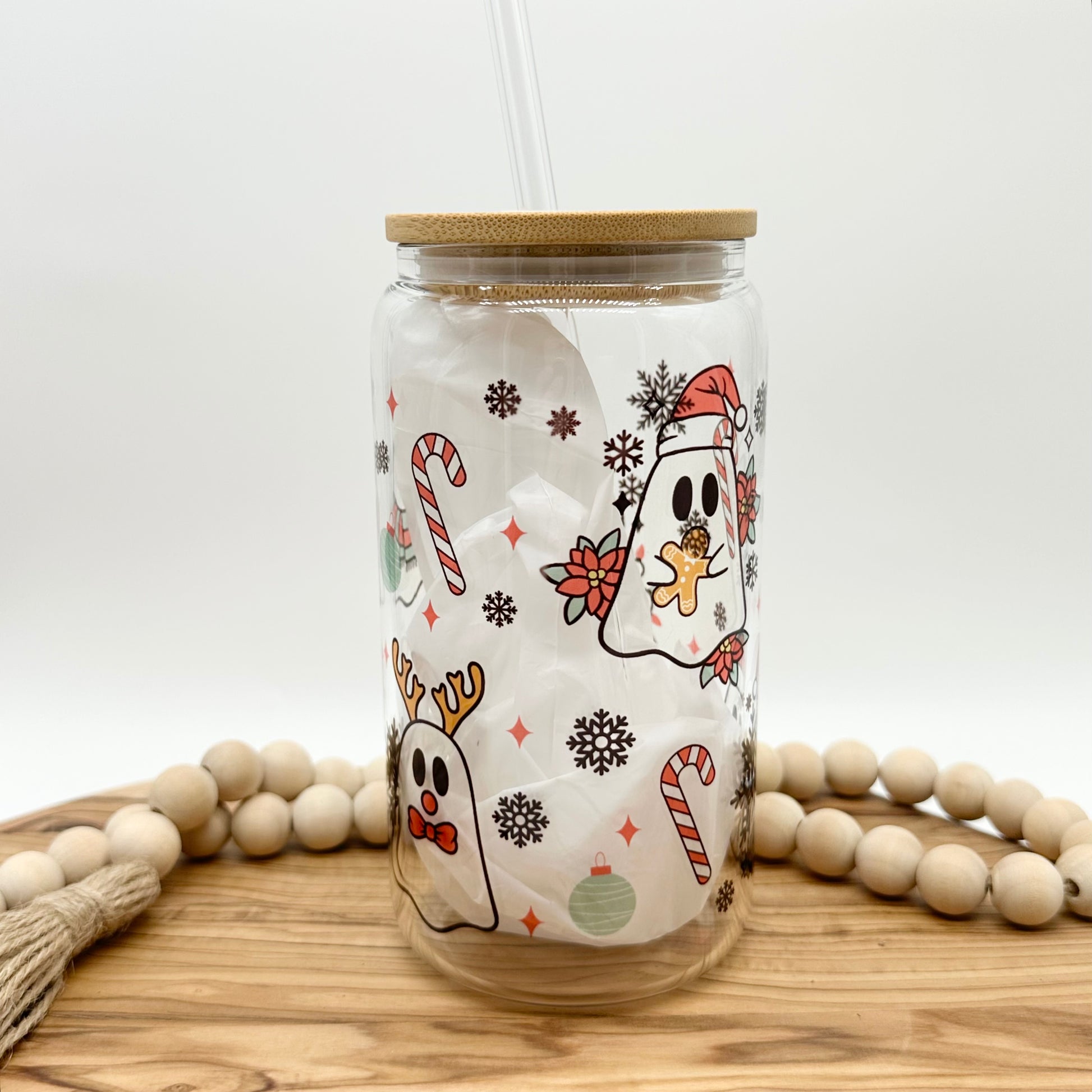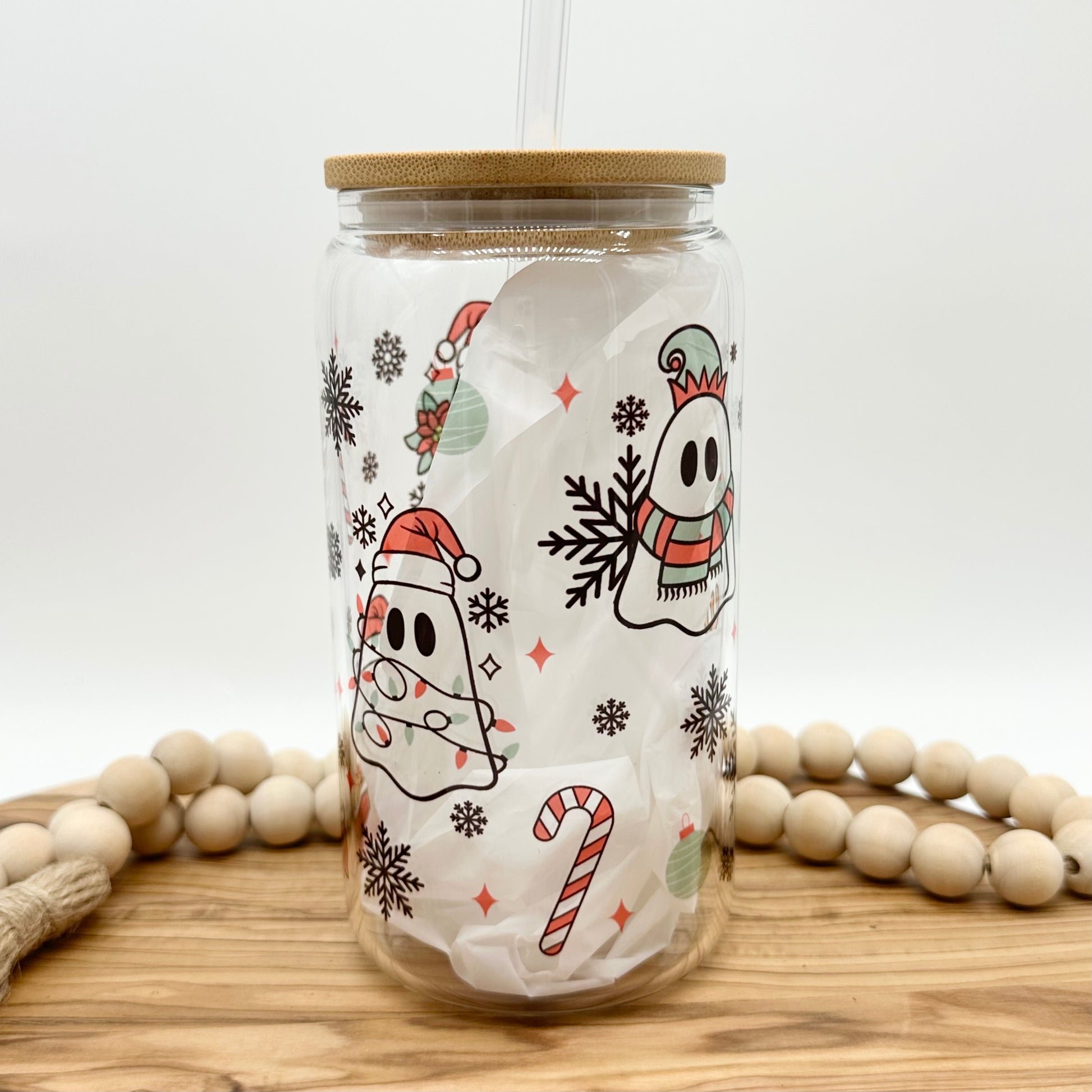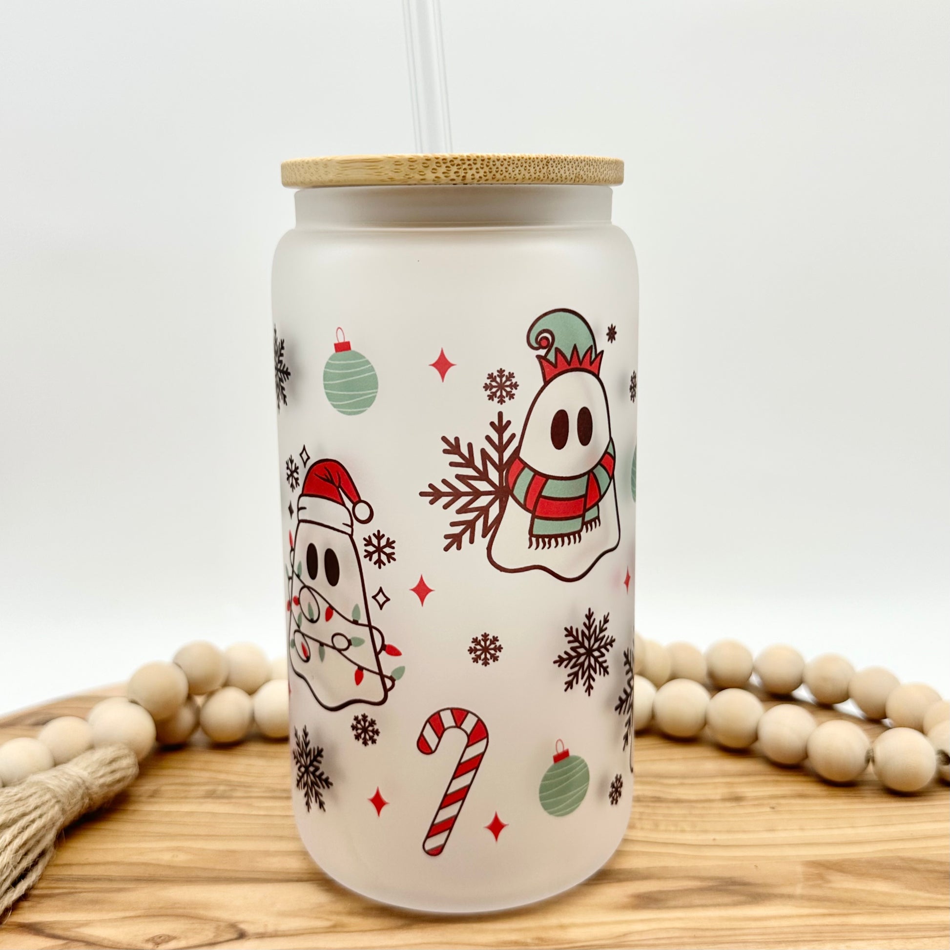 This Christmas themed ghost tumbler has a capacity of 16 fluid ounces and includes a bamboo lid and your choice of a plastic or glass straw. This cute cup is available in either frosted or clear glass. Images are infused into the surface and are not a sticker decal, so they won’t peel off over time.