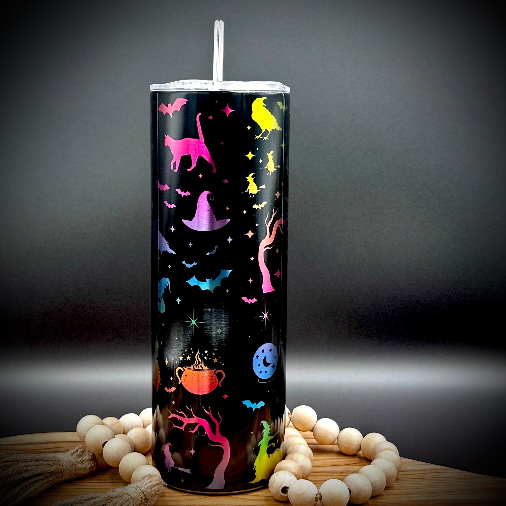 This Halloween witch themed tumbler is made of insulated stainless steel, and is a great way to enjoy your favorite hot or cold beverages. It will keep your drinks hot or cold for hours. This colorful tumbler's image is added using sublimation, which means the design is permanently printed onto the tumbler and won't peel off over time.