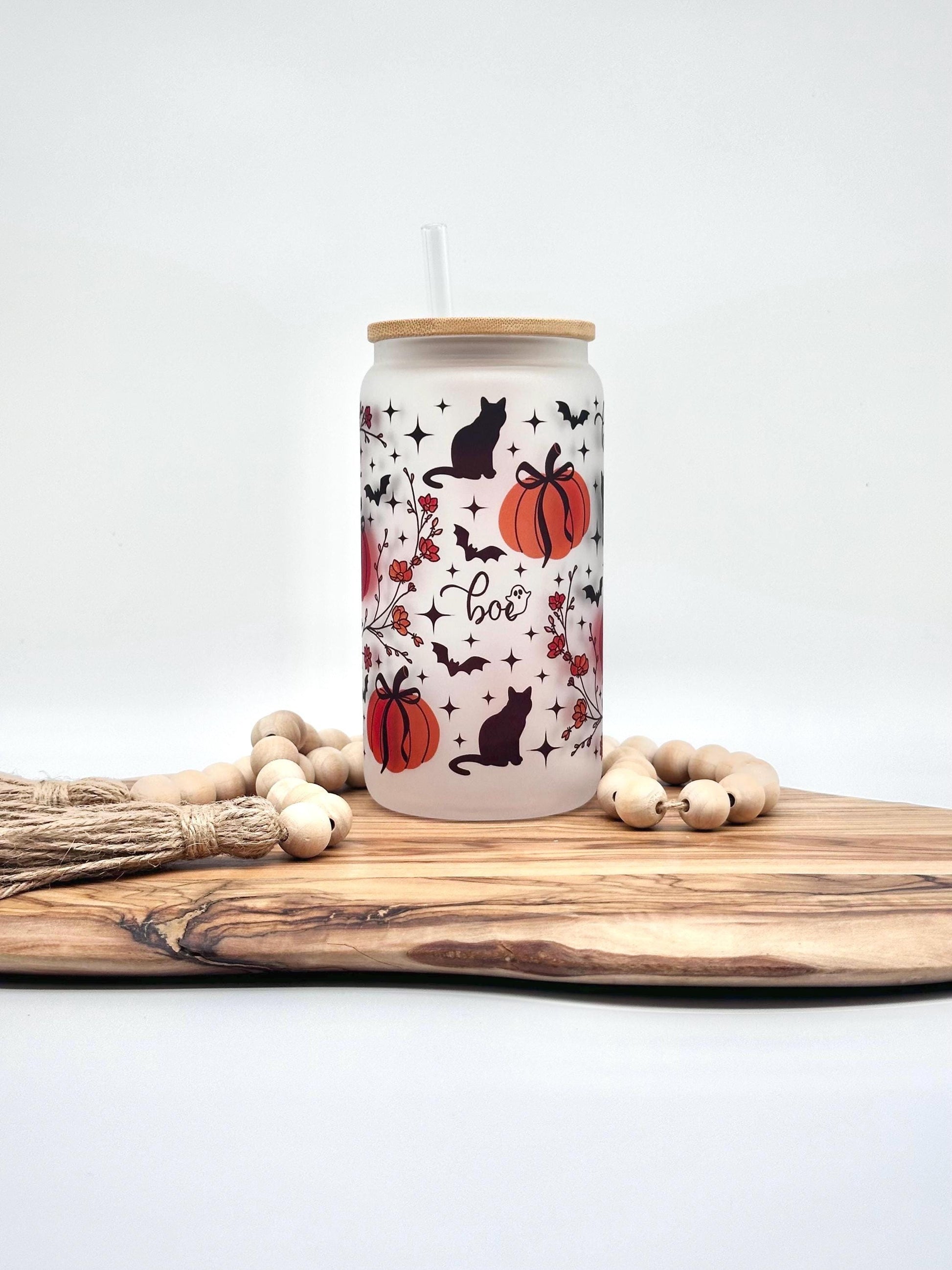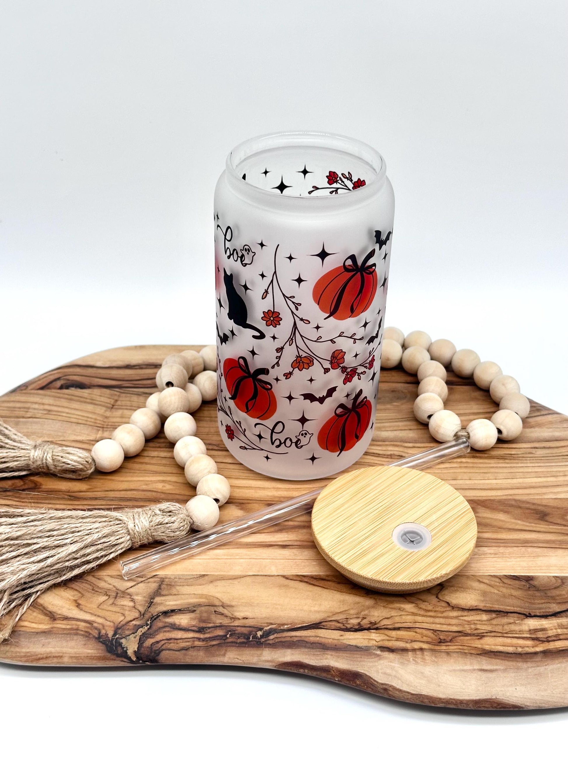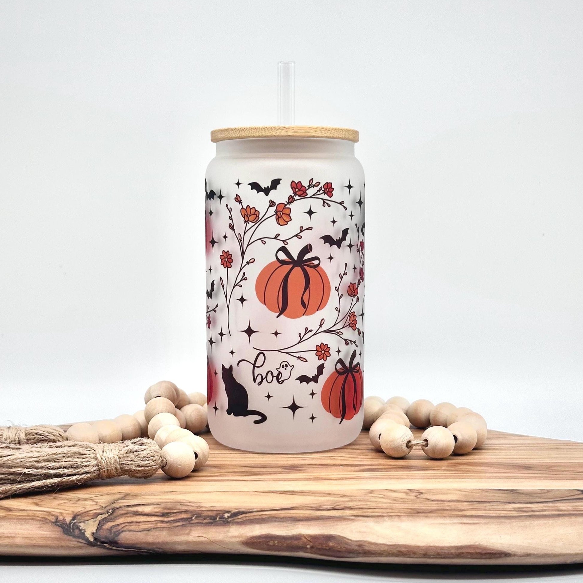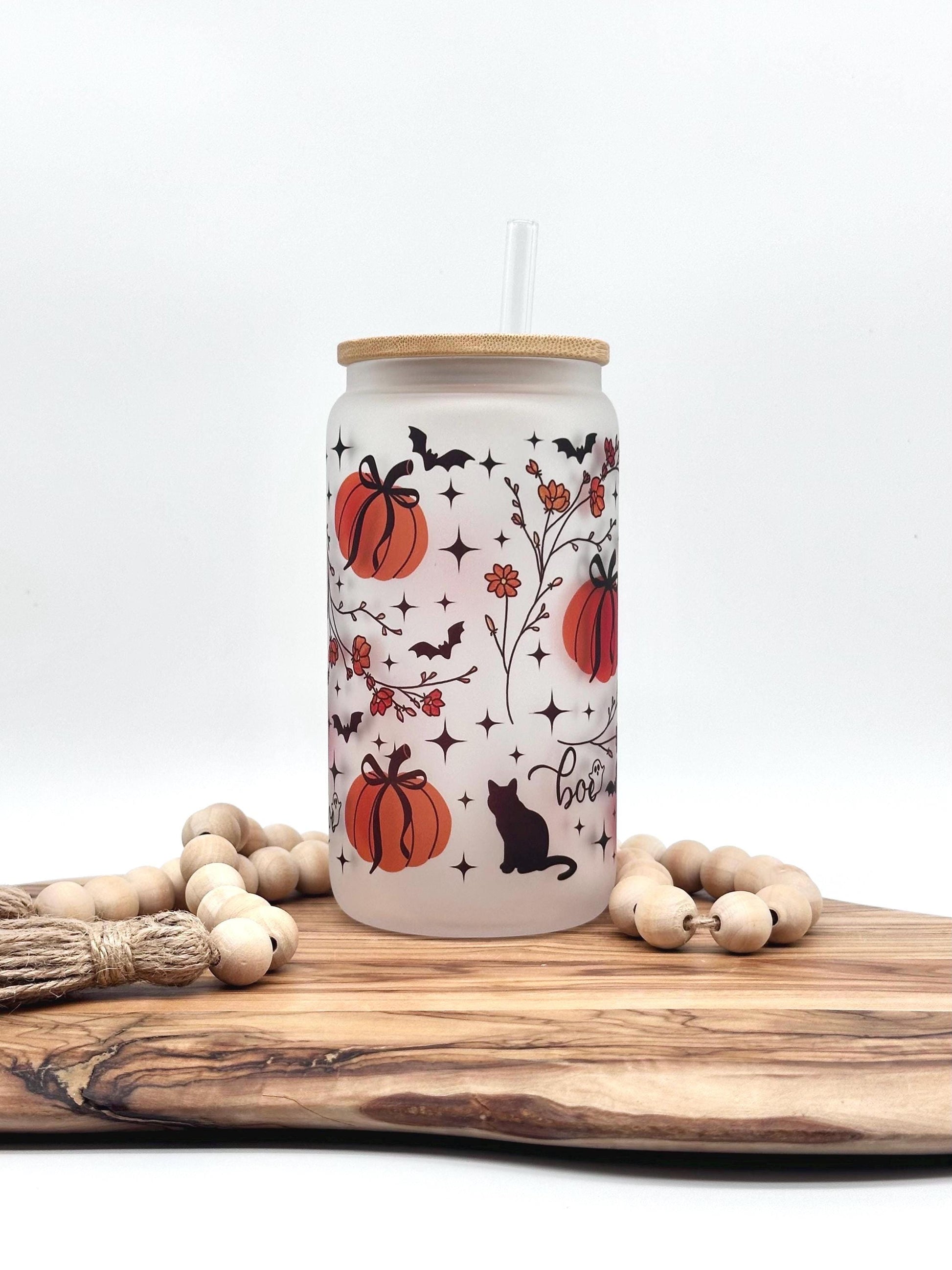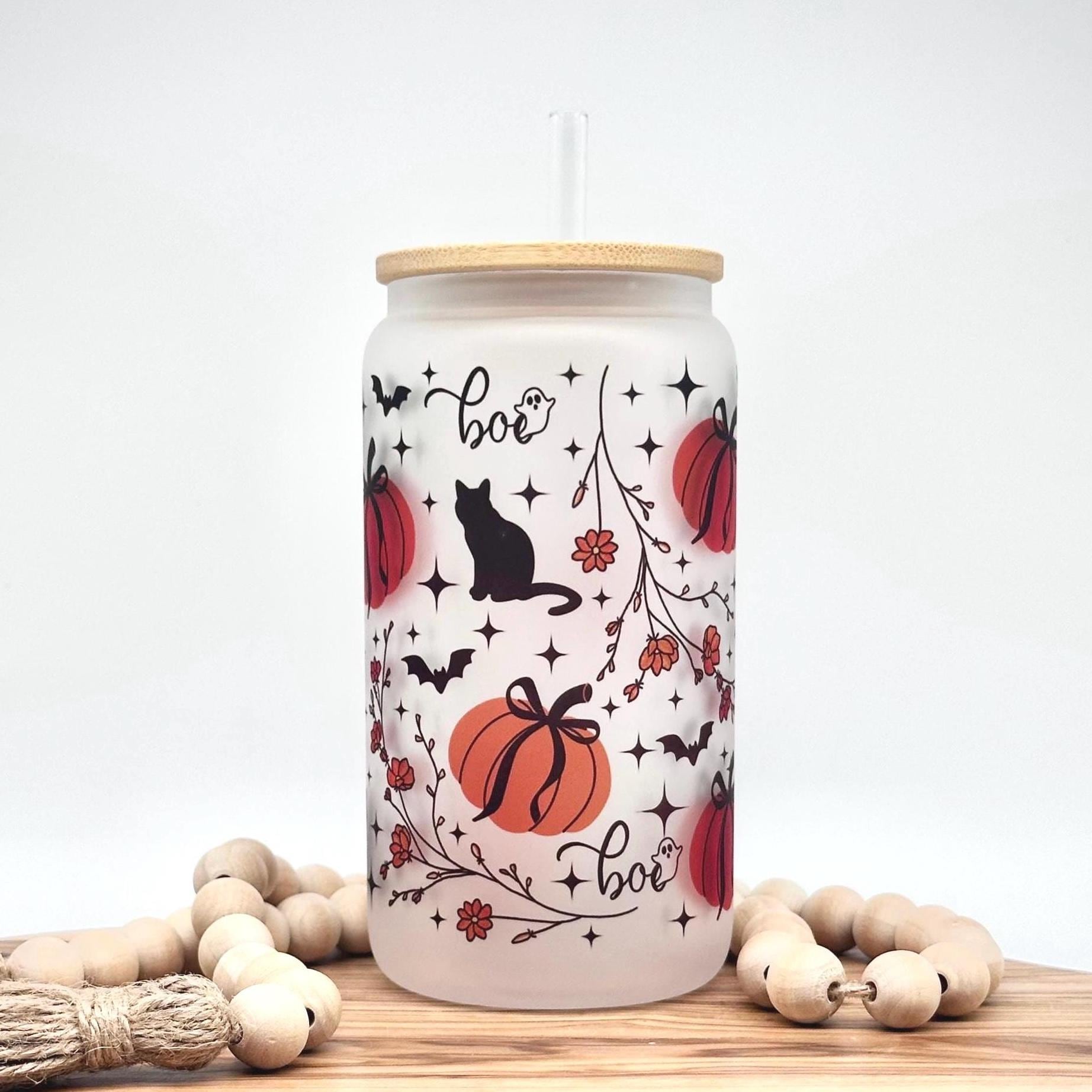 Halloween Iced Coffee Cup - 16oz Glass Tumbler with Lid and Straw