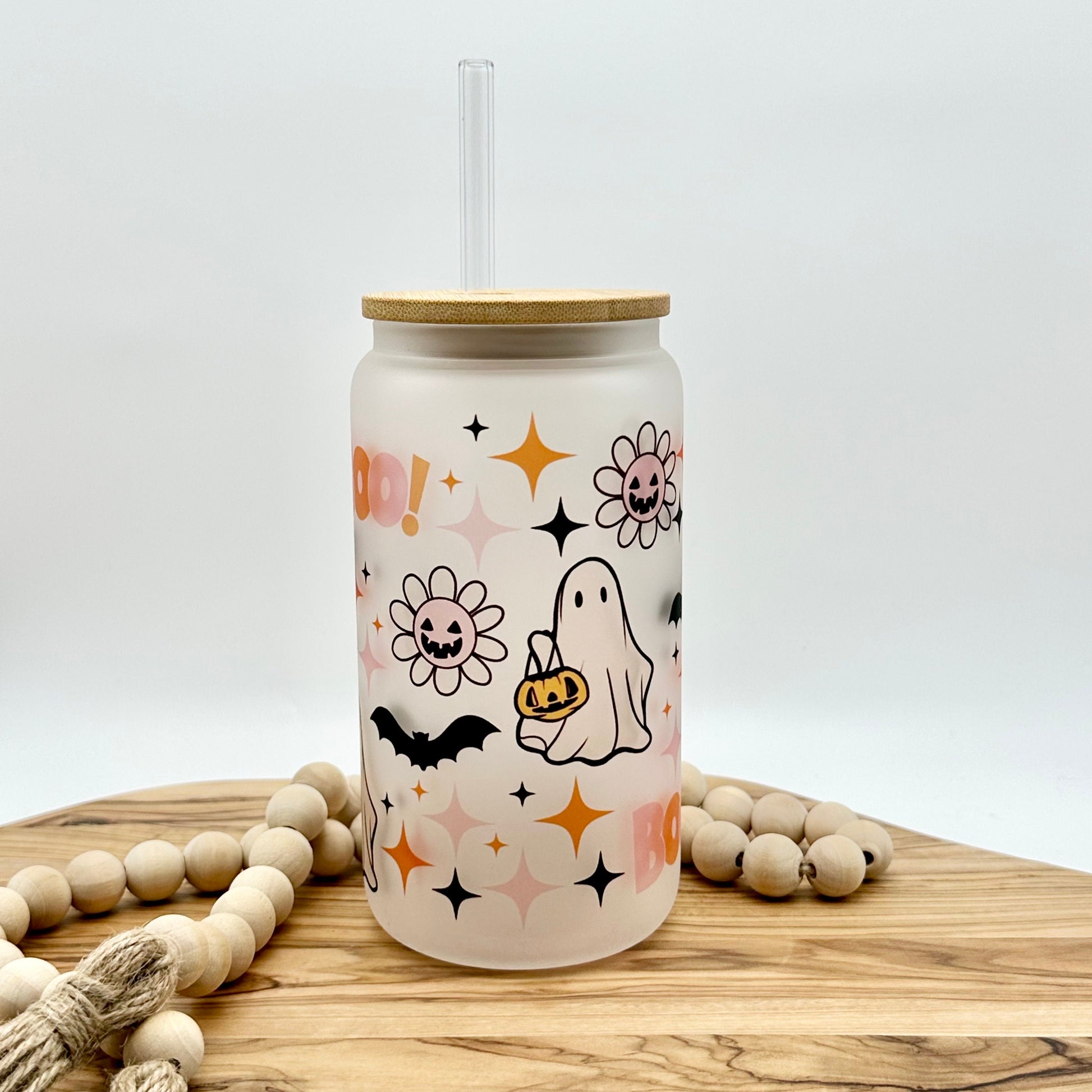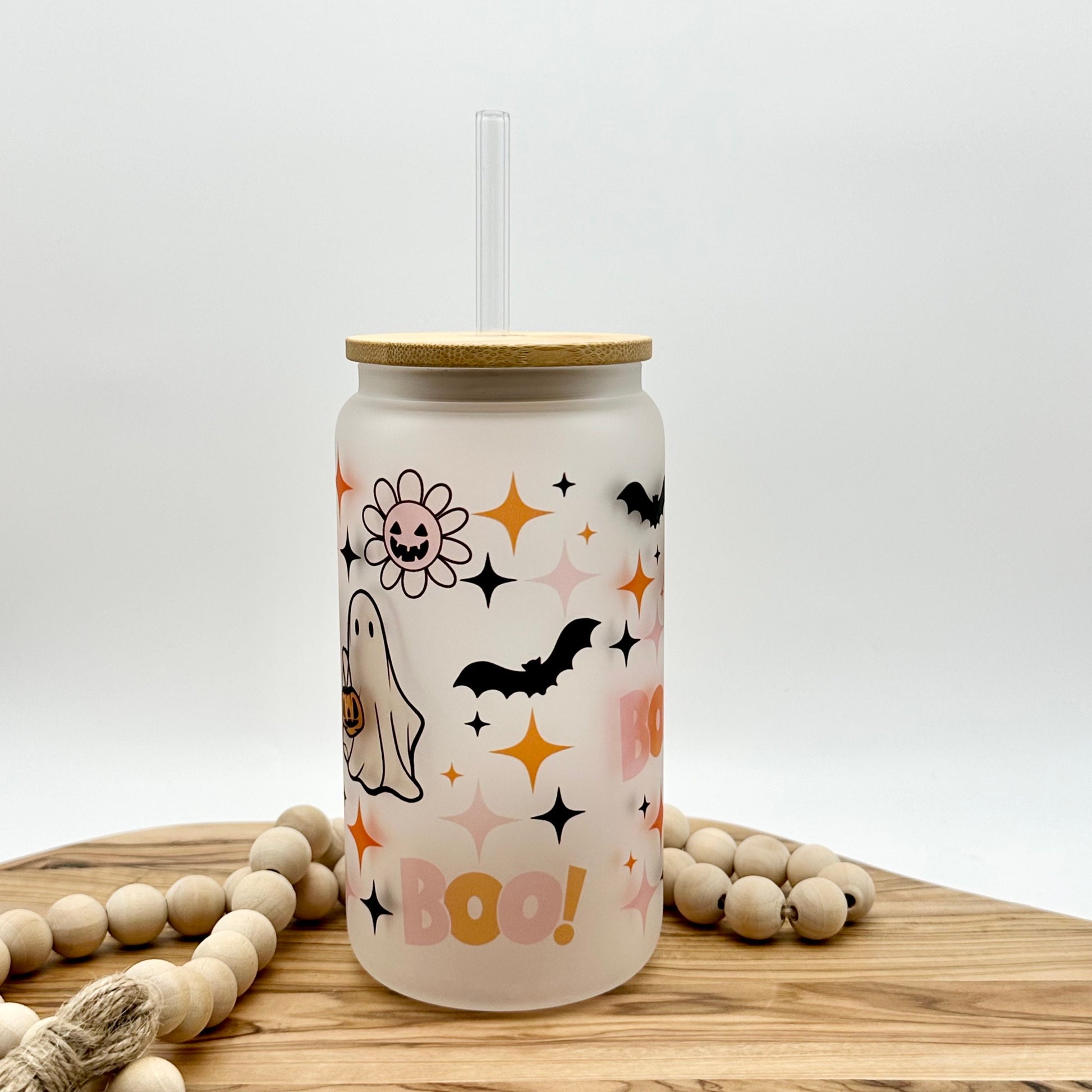 Halloween Iced Coffe Cup - 16oz Frosted Glass Tumbler with Lid and Straw