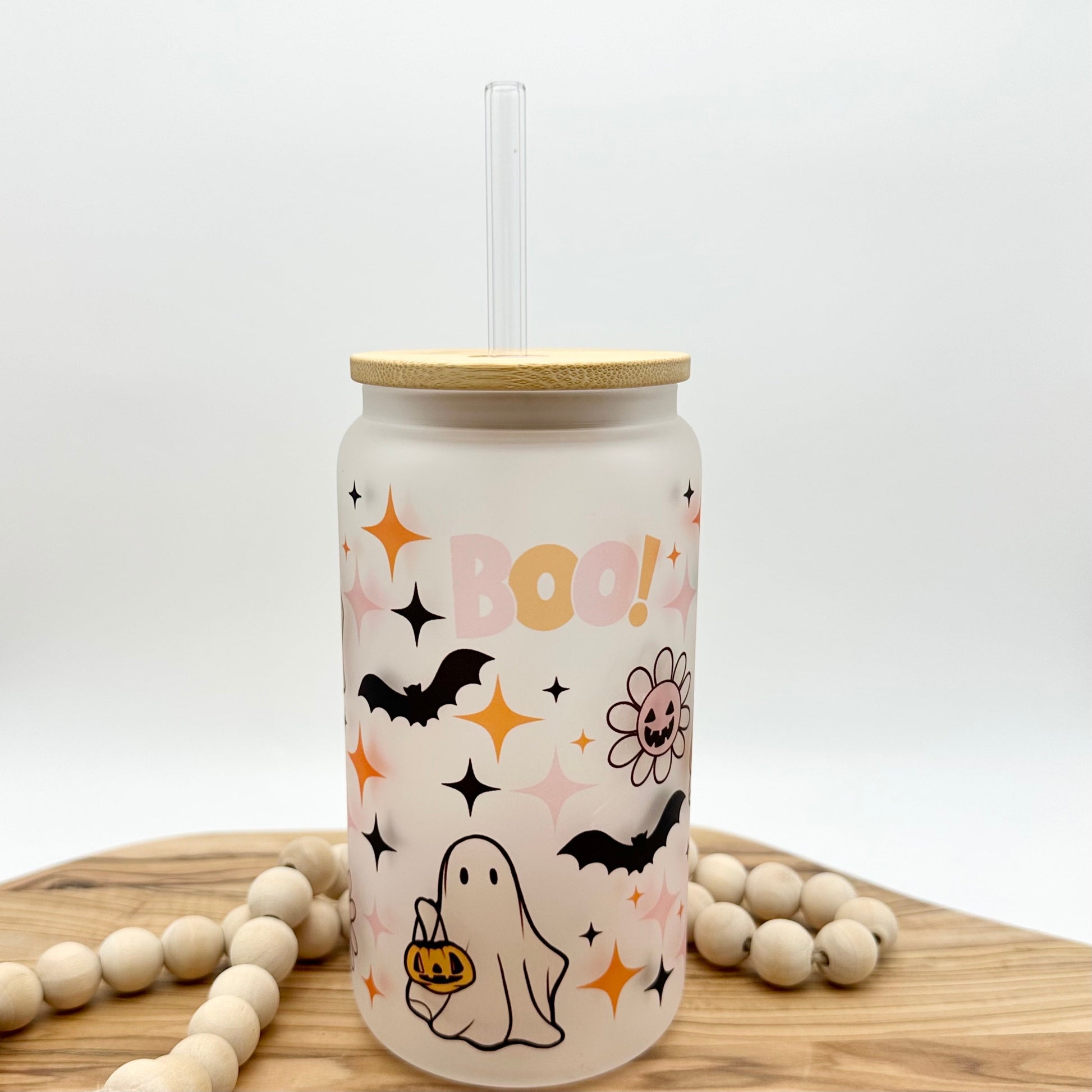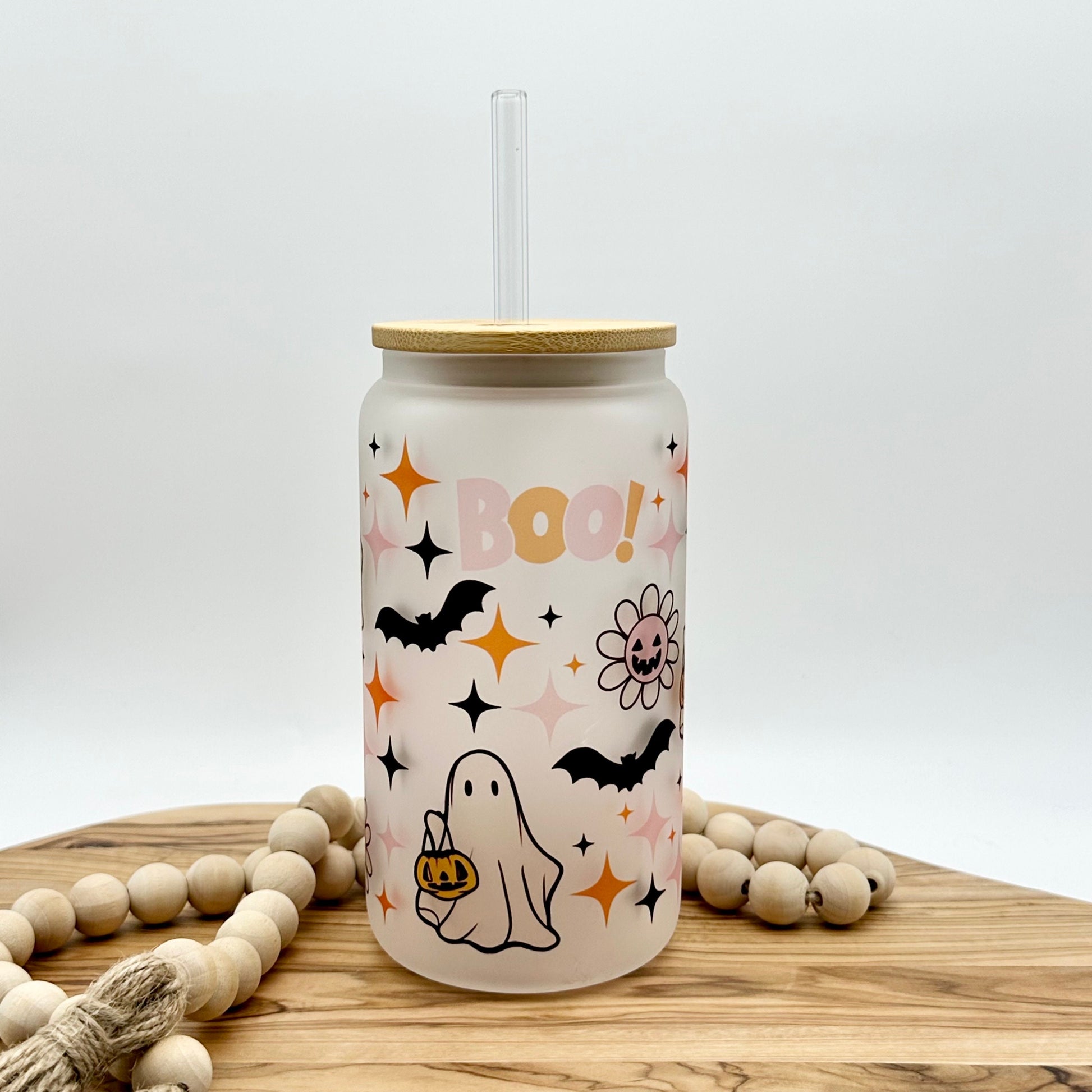 The frosted glass gives a unique and elegant touch, while the Halloween design adds a touch of fun to your drinkware collection. The bamboo lid and glass straw make it easy to take your drink on the go, and they're eco-friendly too!