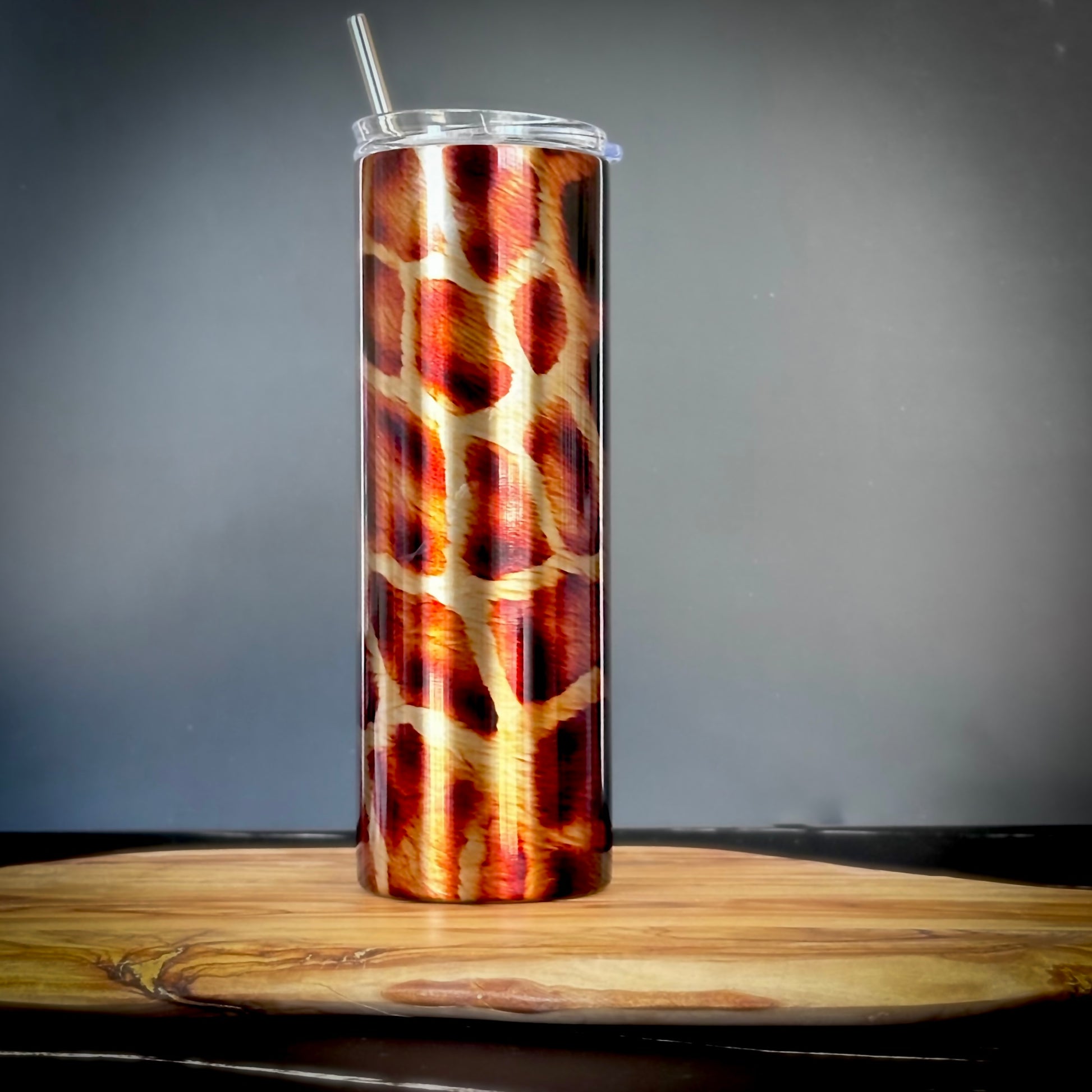 This pretty, giraffe print stainless steel tumbler is a great way to enjoy your favorite hot or cold beverages. It will keep your drinks hot or cold for hours. This 20oz insulated stainless steel tumbler's image is added using sublimation, which means the design is permanently printed onto the tumbler and won't peel off over time like vinyl.