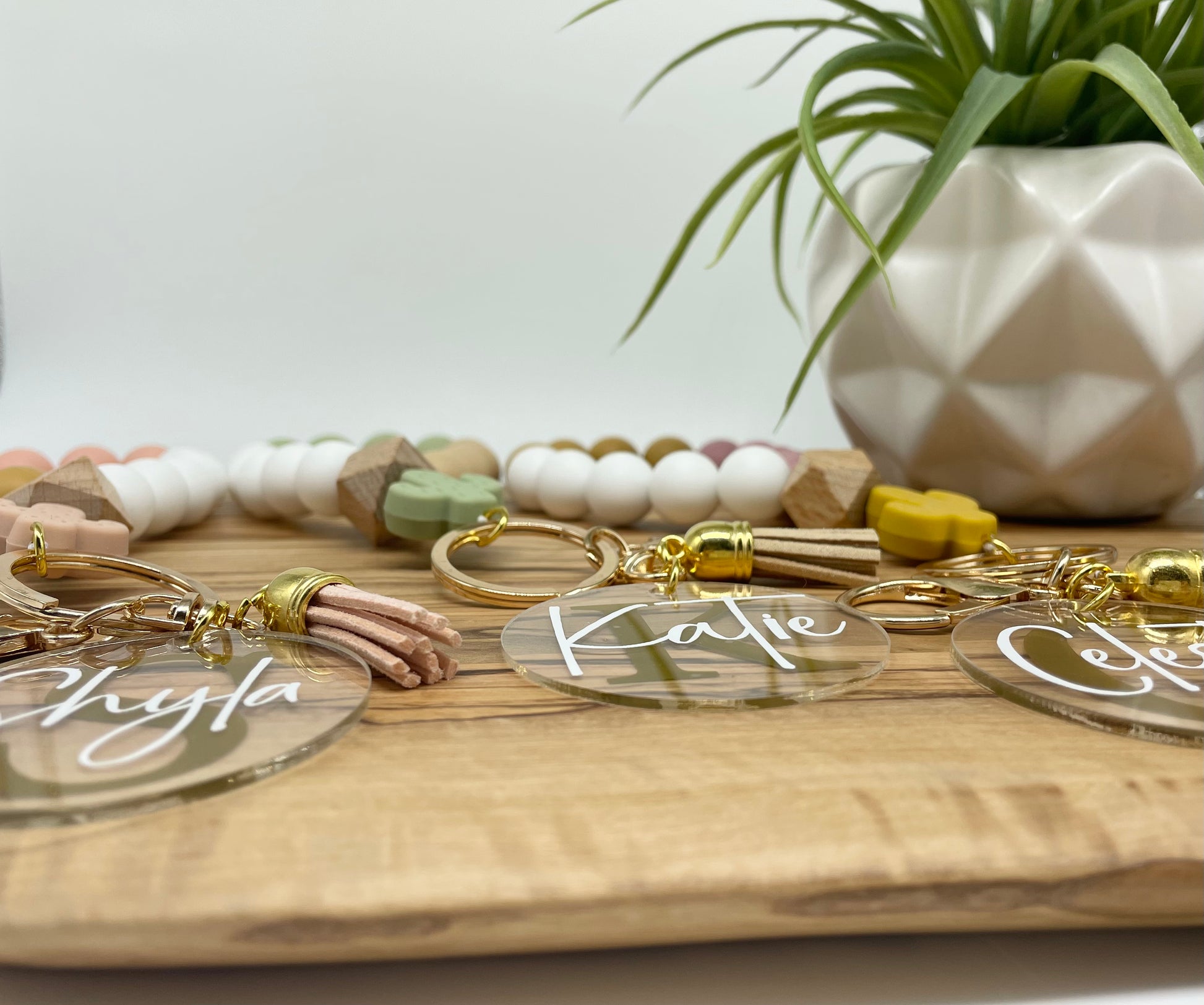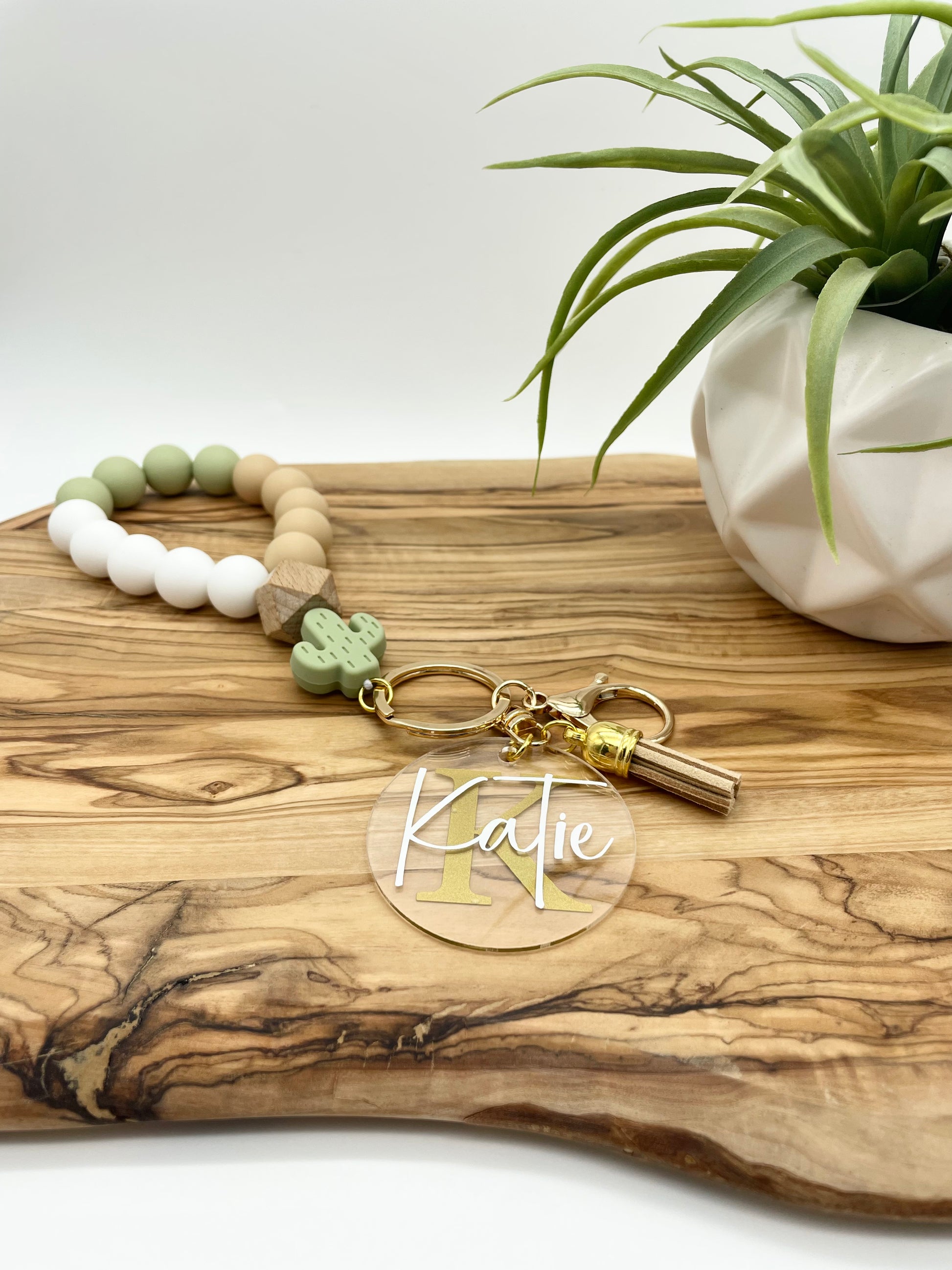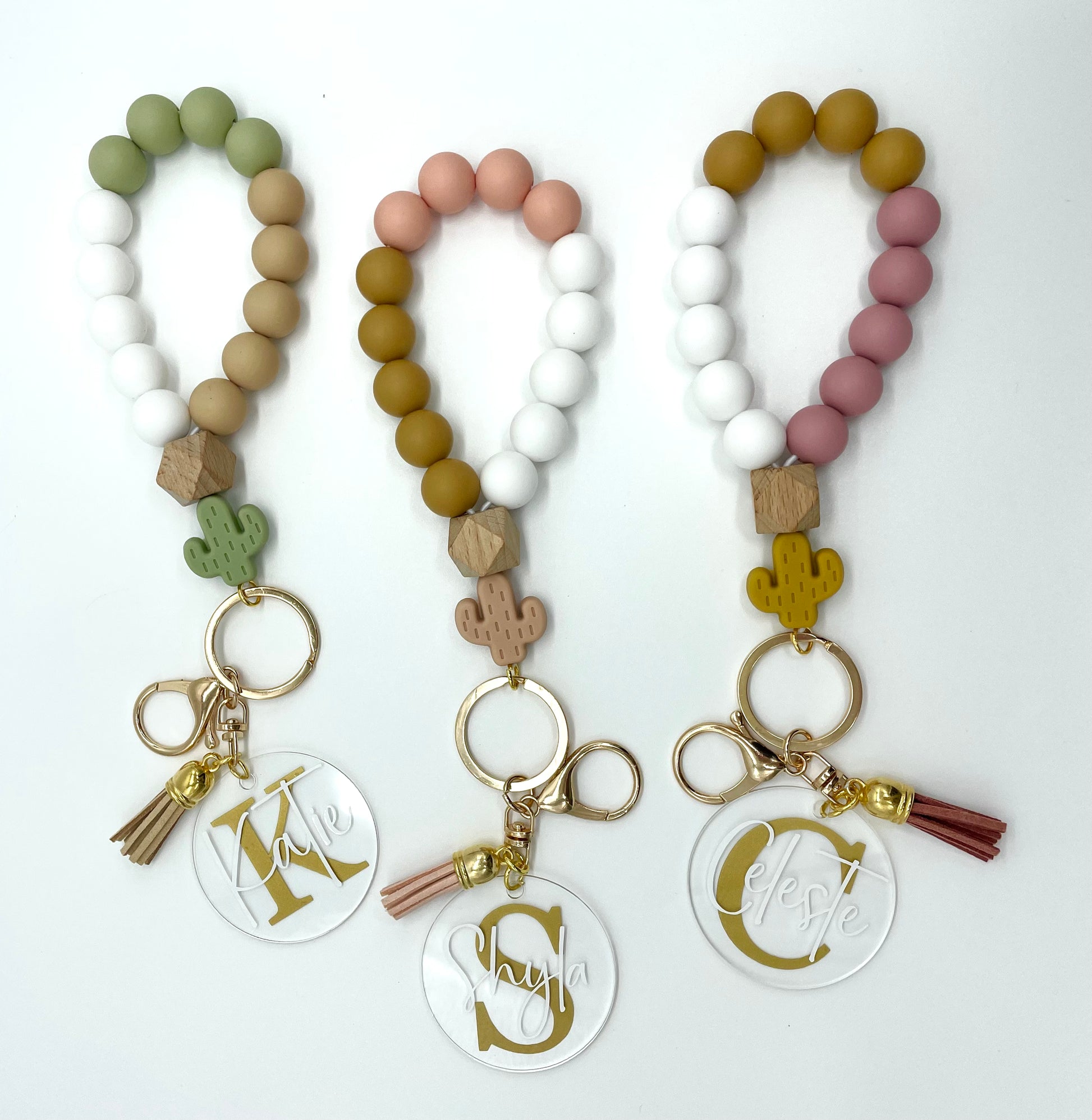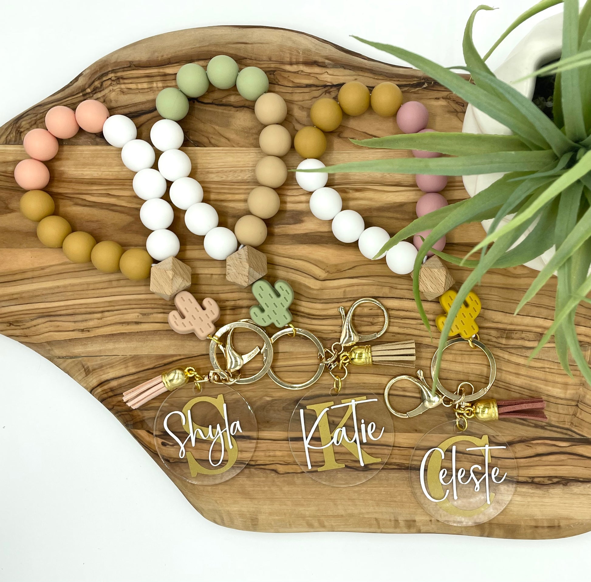 These wristlet keychains are so cute and perfect for anyone who loves rainbows. The name is applied to a 2” acrylic circle with permanent vinyl. The beads are silicone and wood and are connected with an elastic cord so the wristlet can easily slide onto your wrist. The lobster claw hook makes it easy to attach your keychain to a purse or backpack if needed.