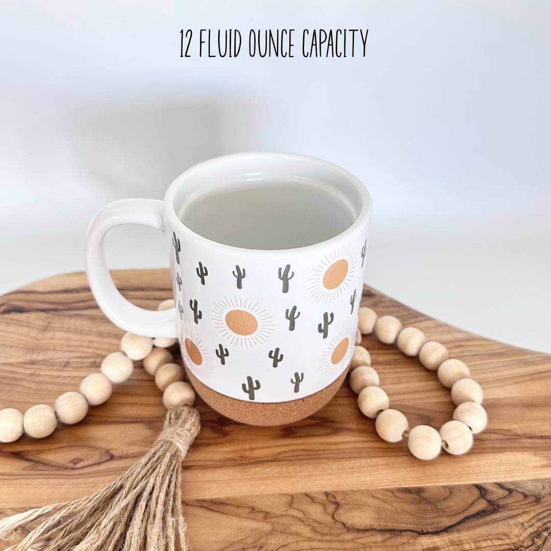 This 12oz ceramic coffe mug includes a cork base that helps protect surfaces from heat and scratches, and a plastic slide-top lid that reduces spills and keeps drinks warmer longer. This mug is ideal for coffee, tea, or any hot beverage.
