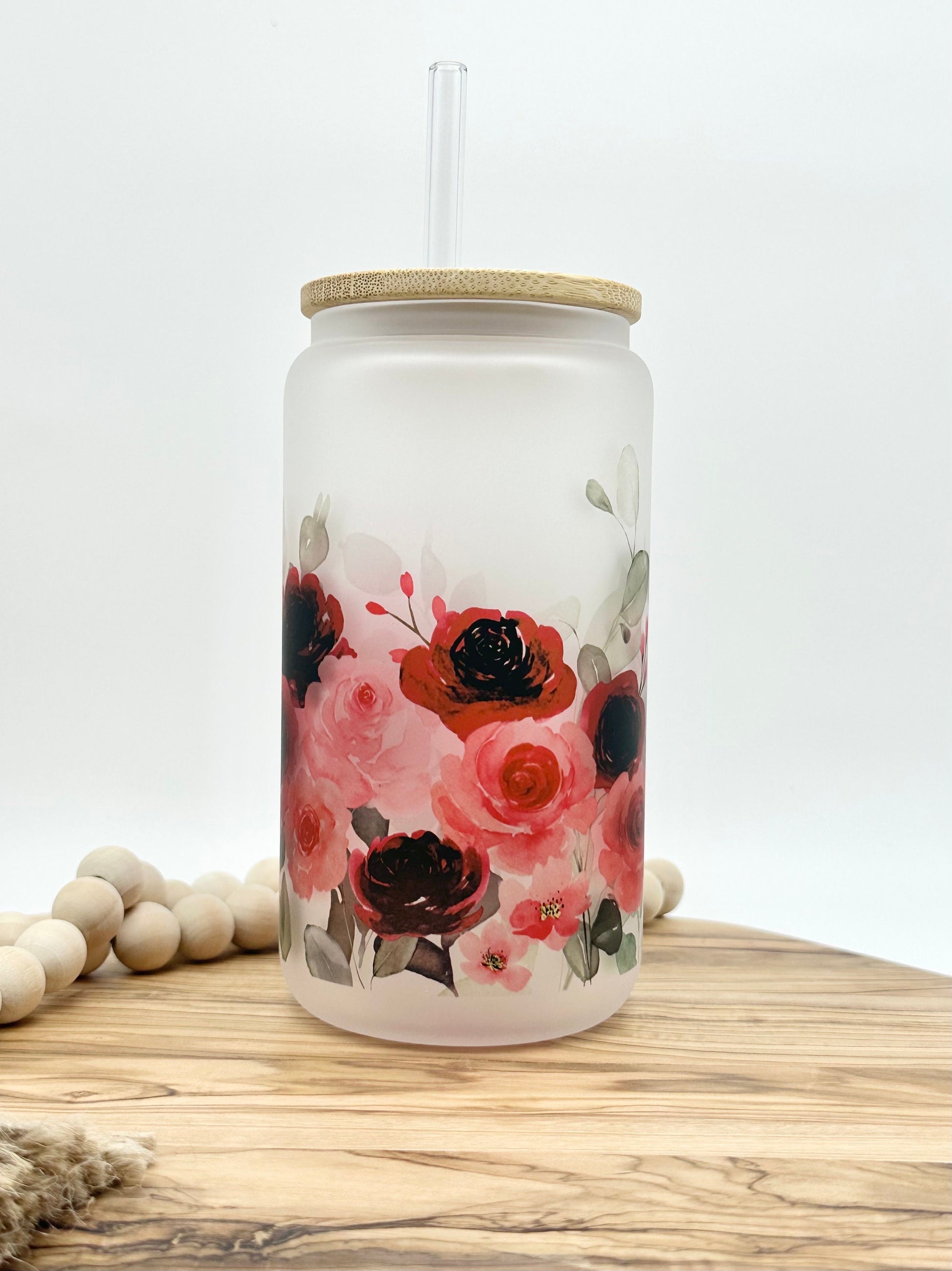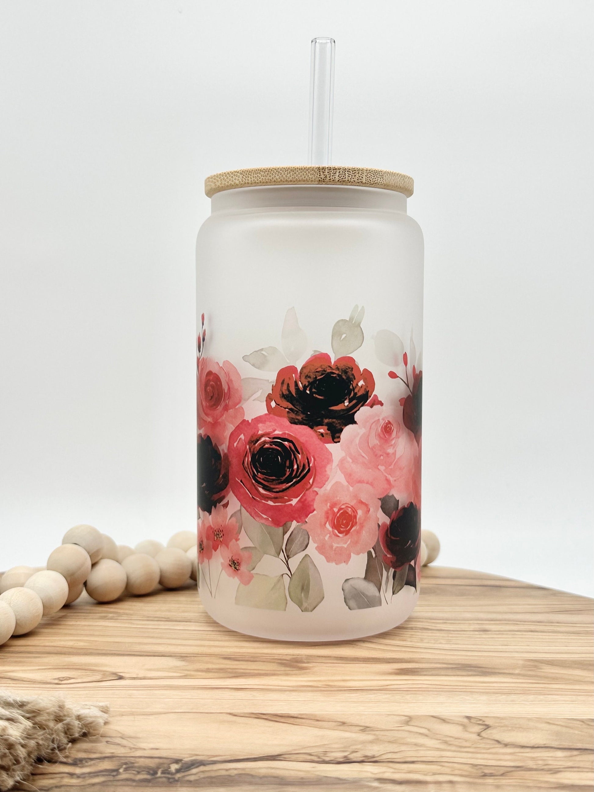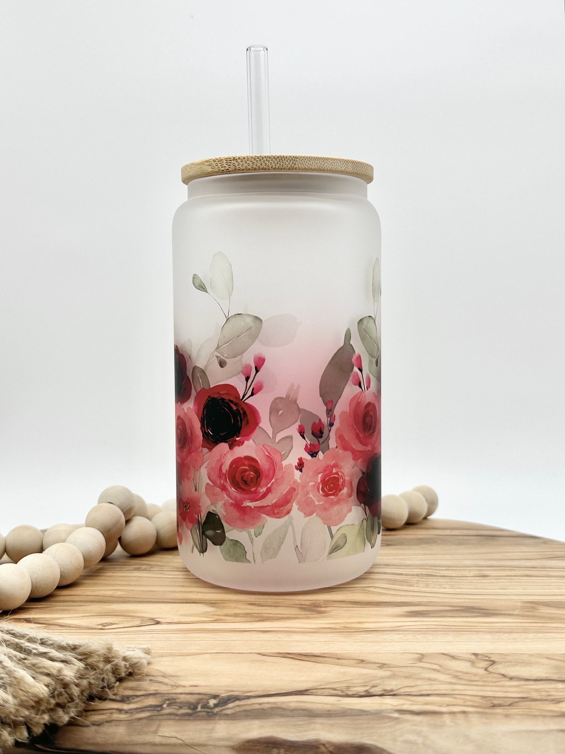 This is such a pretty glass and is a great way to enjoy iced coffee or any of your other favorite cold beverages. The pink and red flowers would make it a great gift for Valentine's Day.