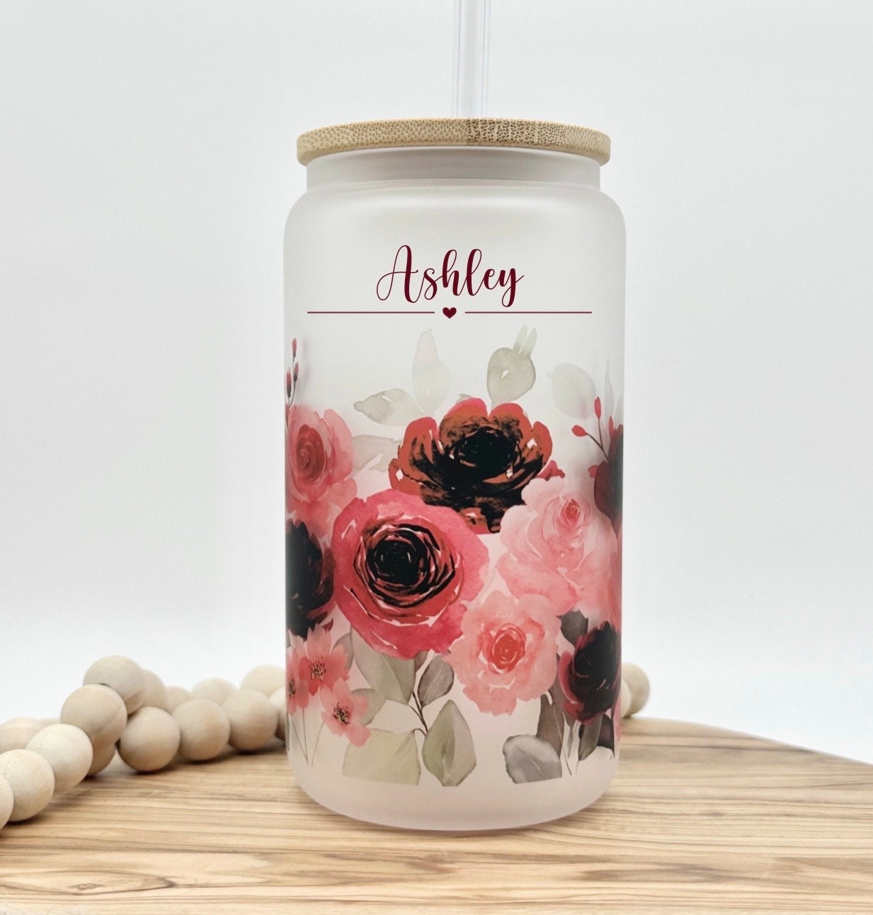 Pink Floral Iced Coffee Glass Tumbler with Lid and Straw - 16oz Personalized Iced Coffee Cup