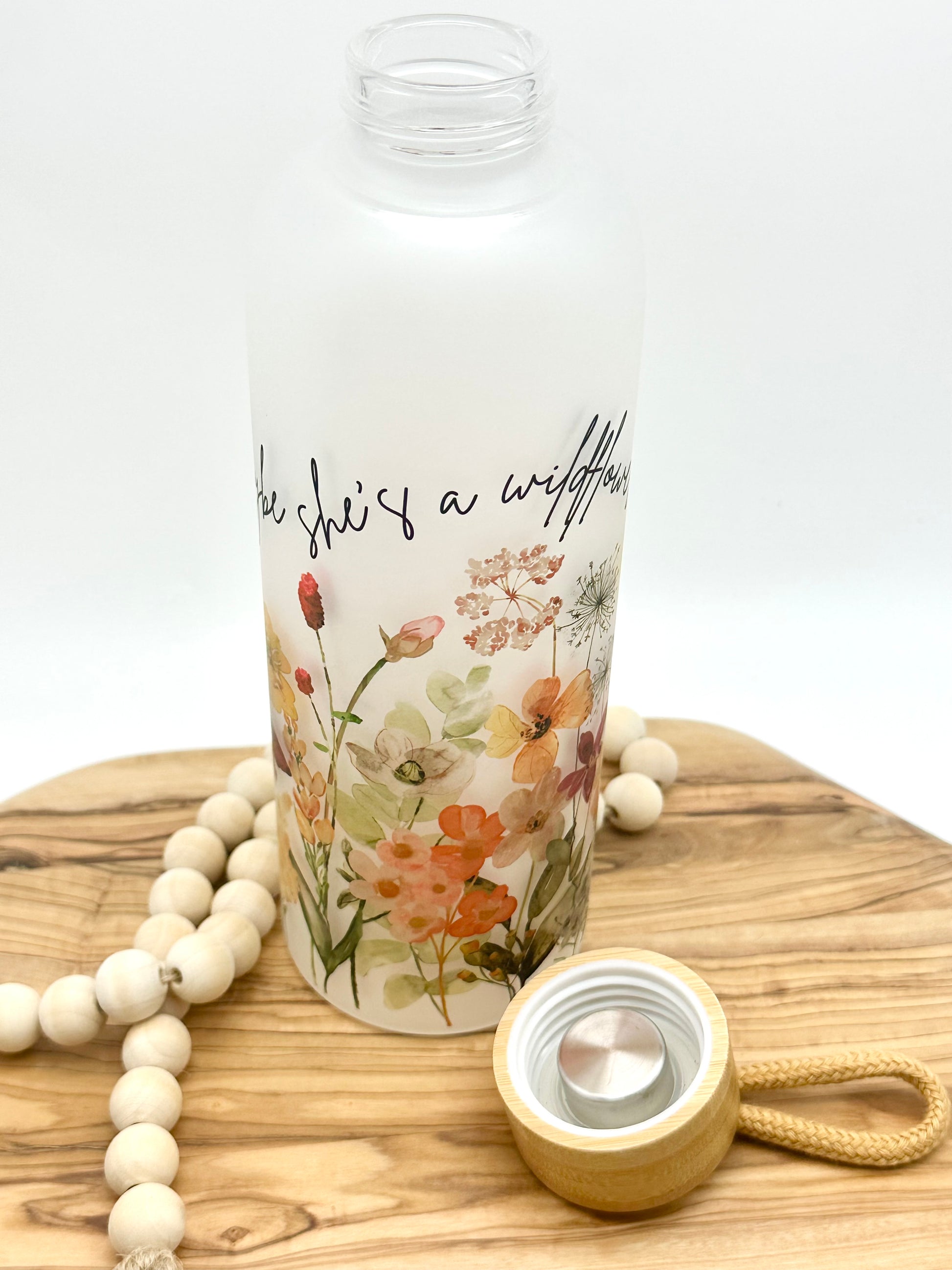 Introducing our beautiful, wildflower frosted glass water bottle with bamboo lid! This glass water bottle has a bamboo lid that screws on and a rope handle. This makes it easy to take on-the-go, but ensures that the lid stays securely in place.