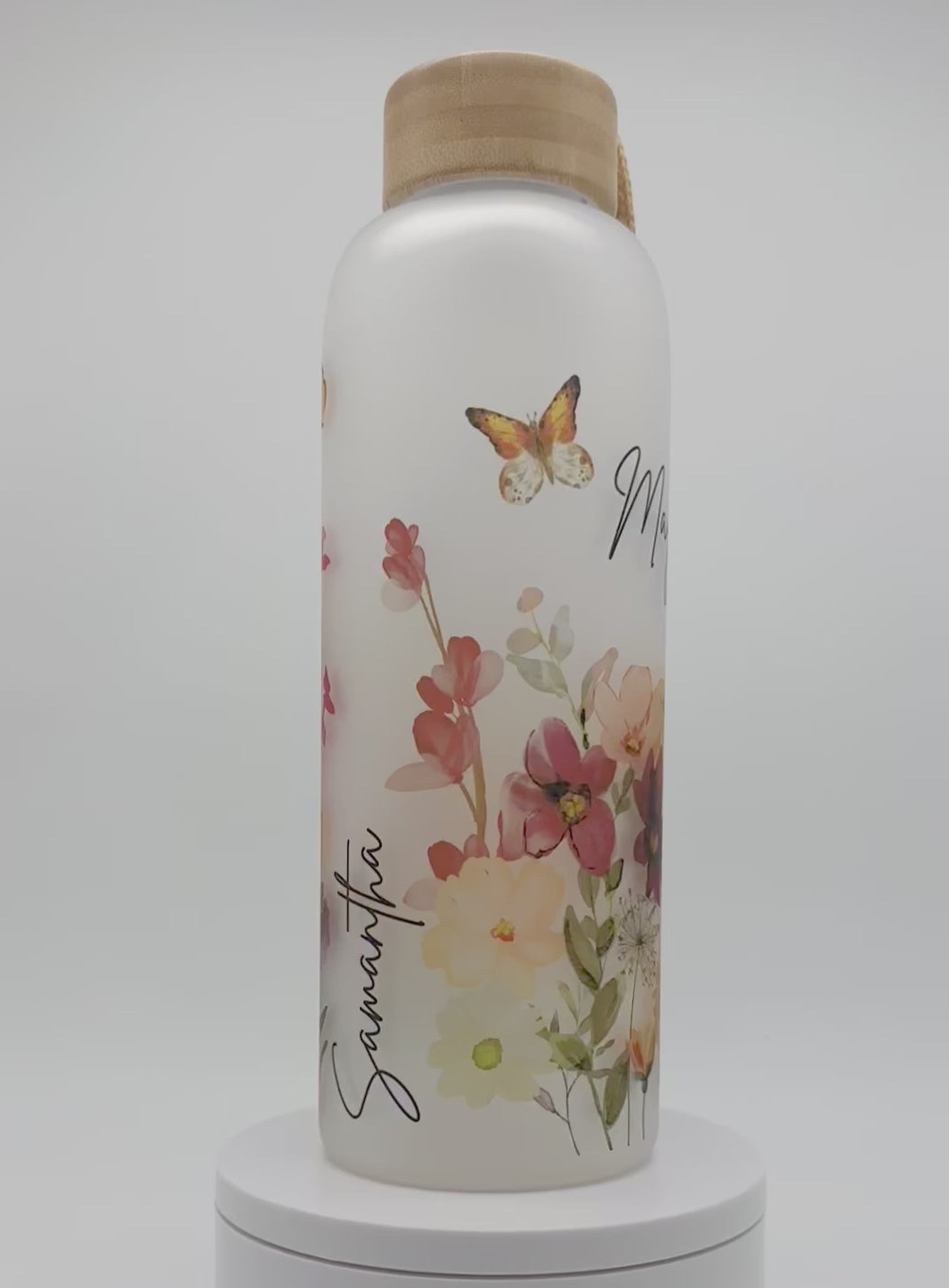 The frosted glass gives a unique and elegant touch, while the floral design adds a touch of natural beauty to your drinkware collection. The bamboo lid makes it easy to take your drink on the go. This glass water bottle can be personalized to include a name, so it would make an excellent gift for a loved one.