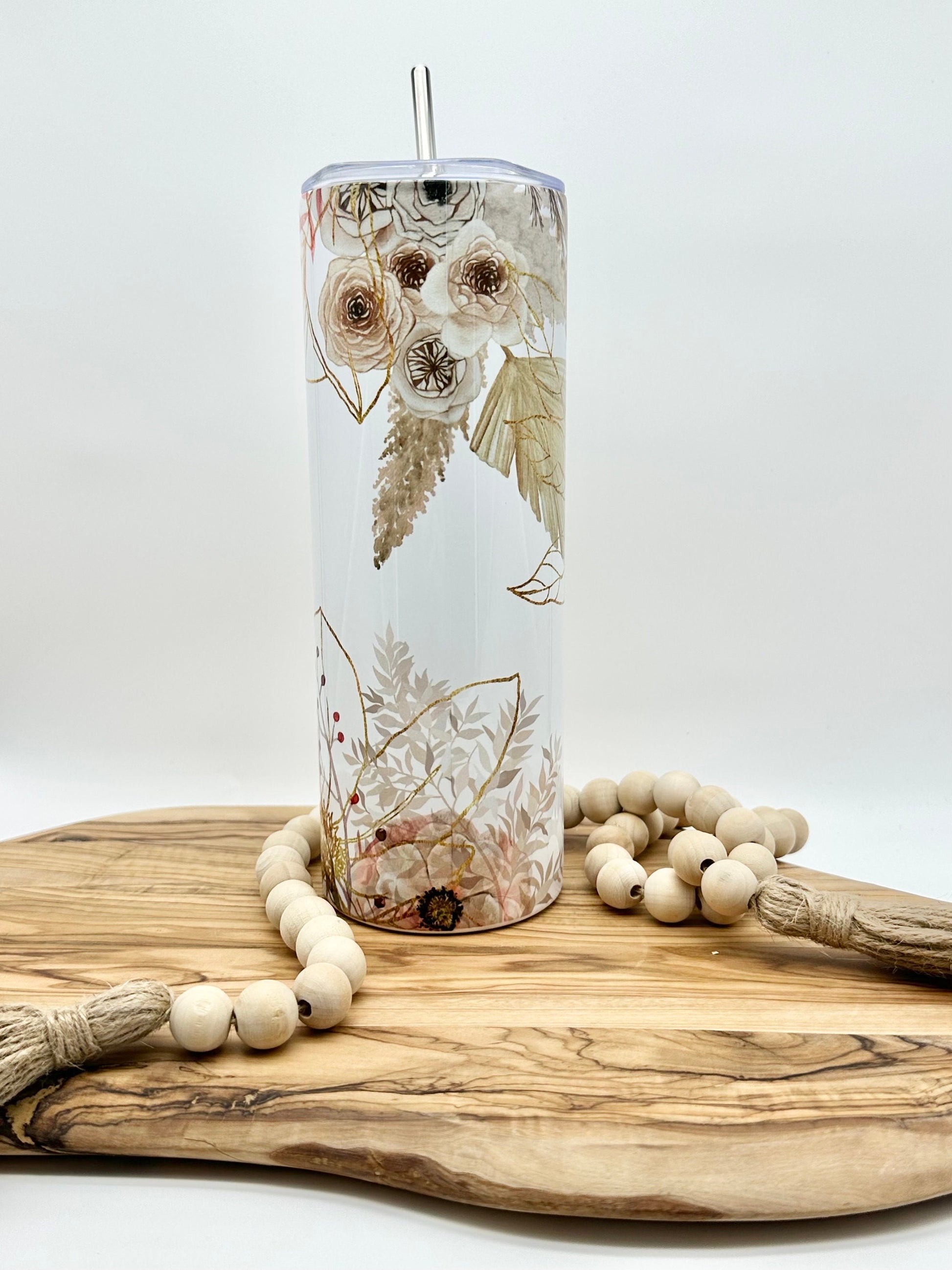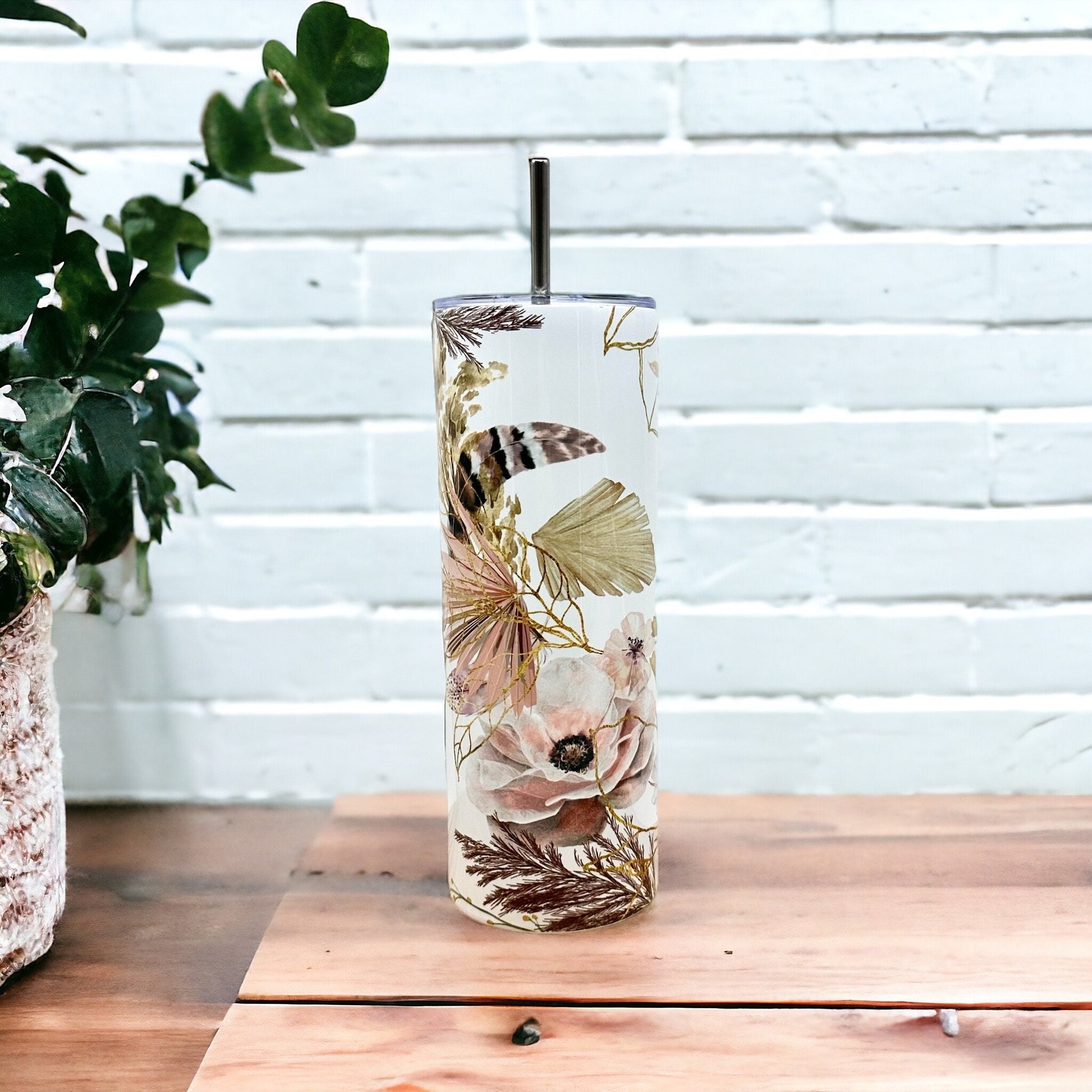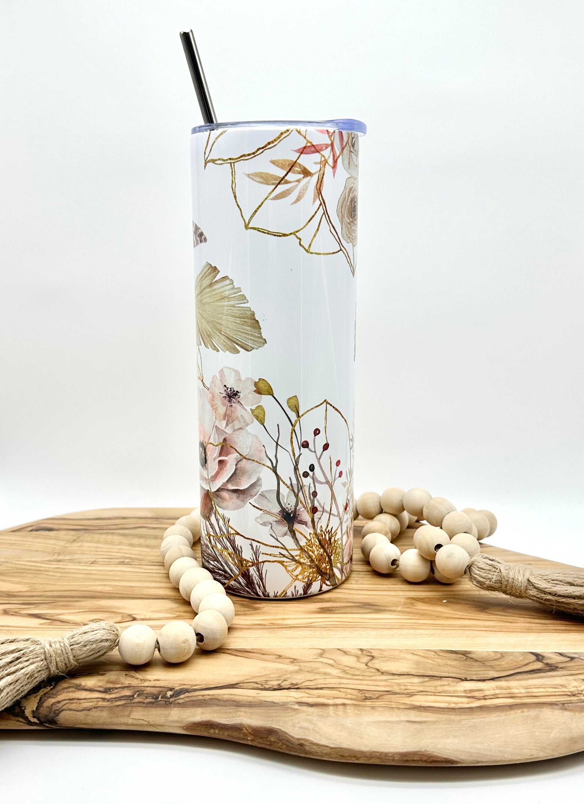 This floral stainless steel tumbler is a great way to enjoy your favorite hot or cold beverages. It will help your drinks cold for up to 12 hours or hot for up to 6 hours. This 20oz insulated stainless steel tumbler's image is added using sublimation, which means the design is permanently printed onto the tumbler and won't peel off over time.