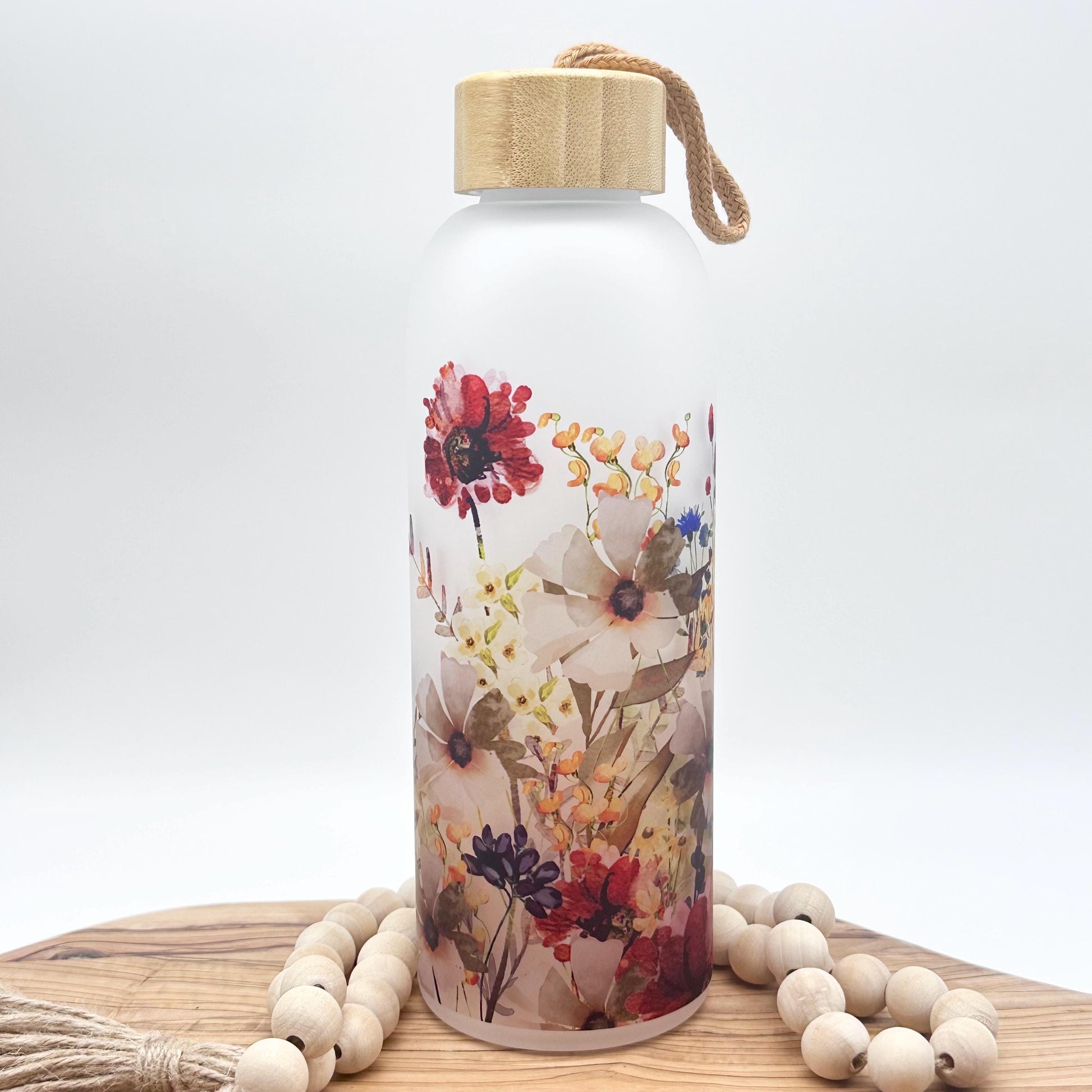 Introducing our beautiful wildflower frosted glass water bottle with bamboo lid! This glass water bottle has a bamboo lid that screws on and a rope handle. This makes it easy to take on-the-go, but ensures that the lid stays securely in place.