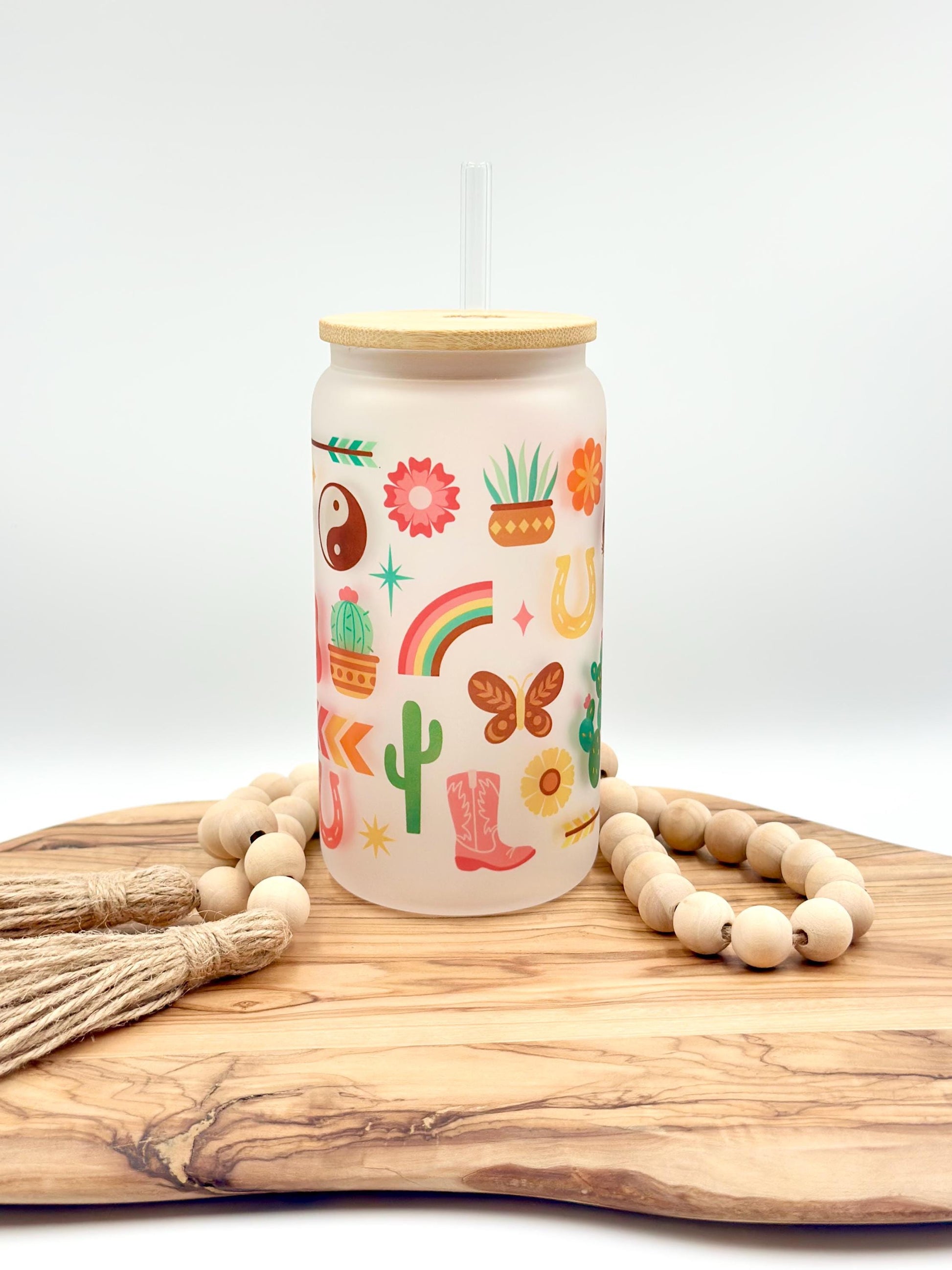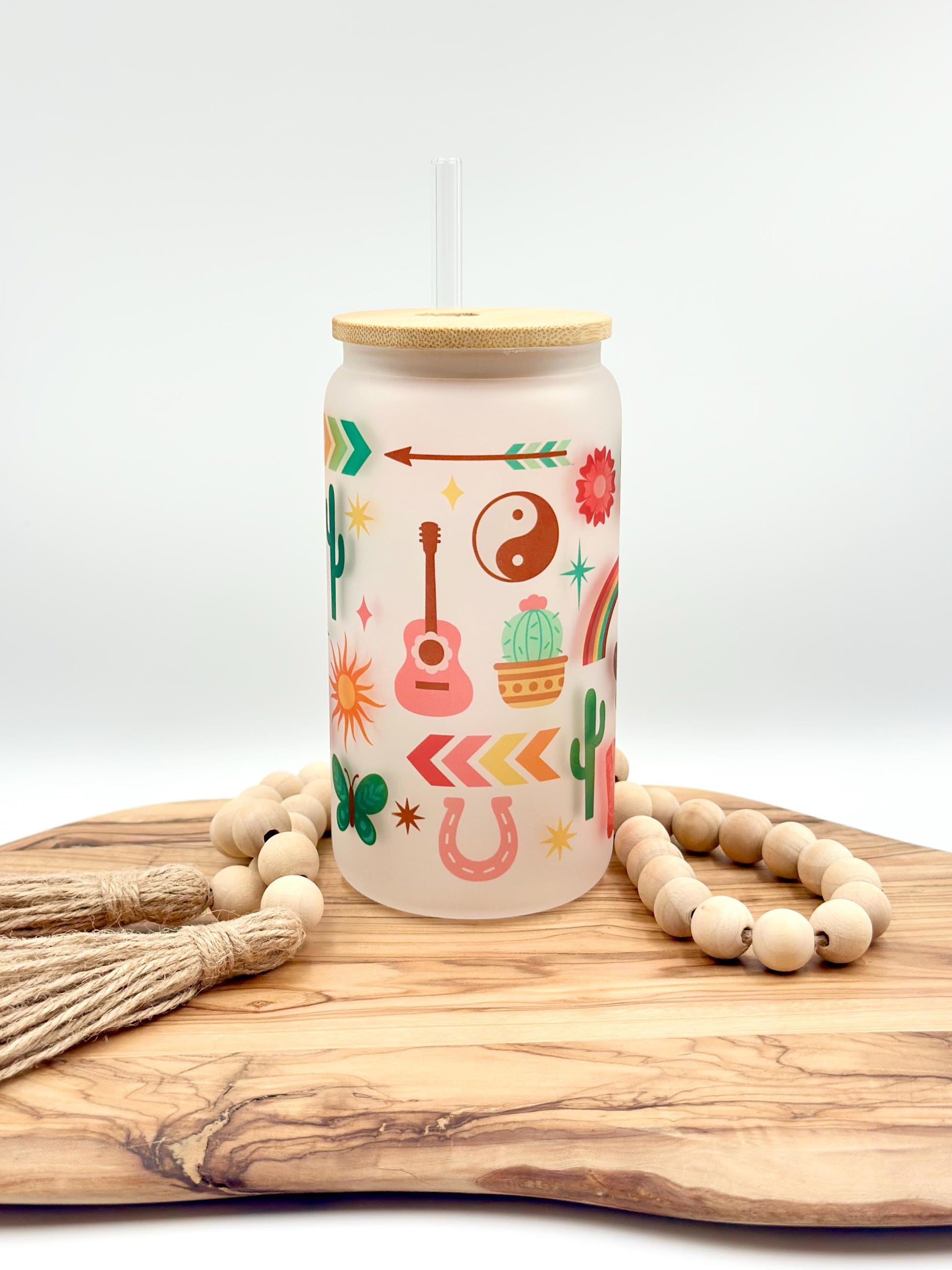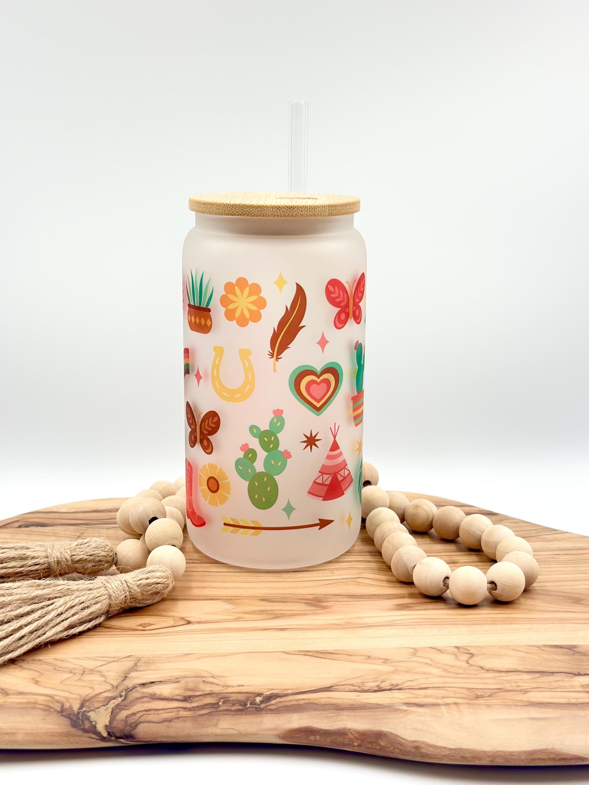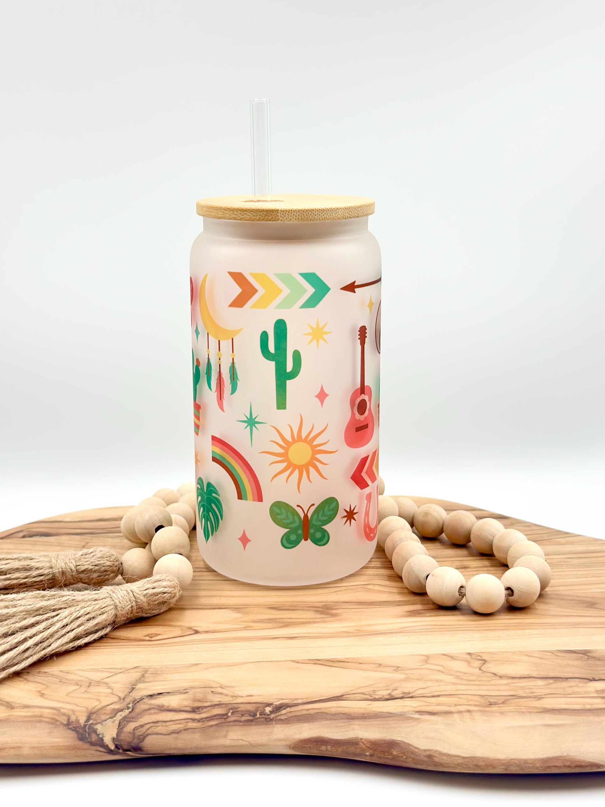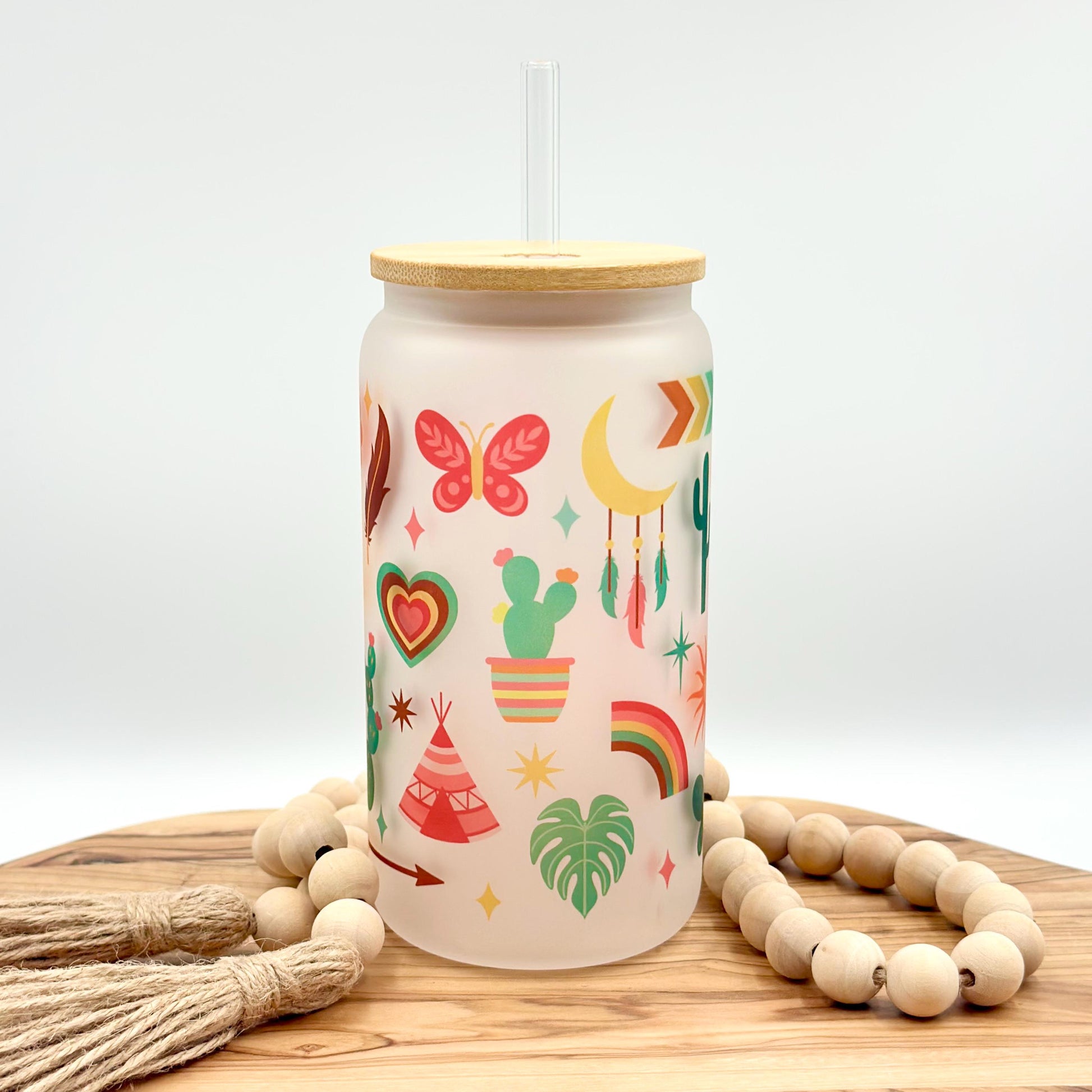 Southwest Boho Rainbow Iced Coffee Cup with Lid and Straw - 16oz Frosted Glass Tumbler