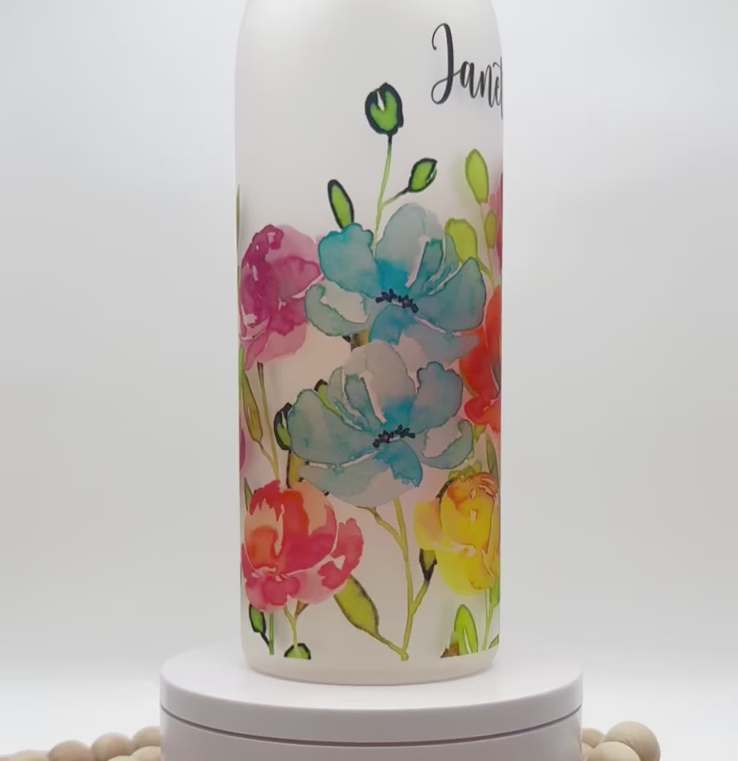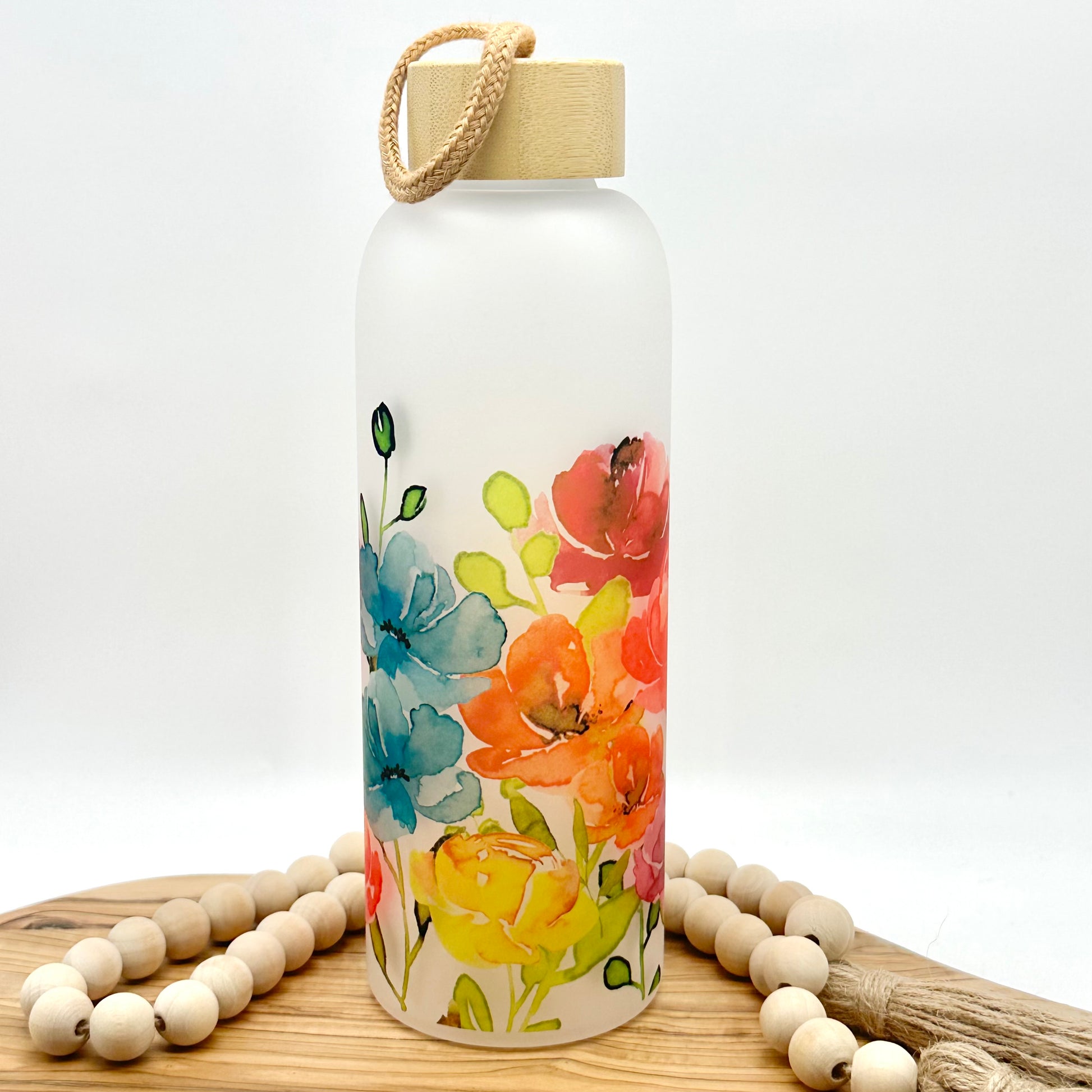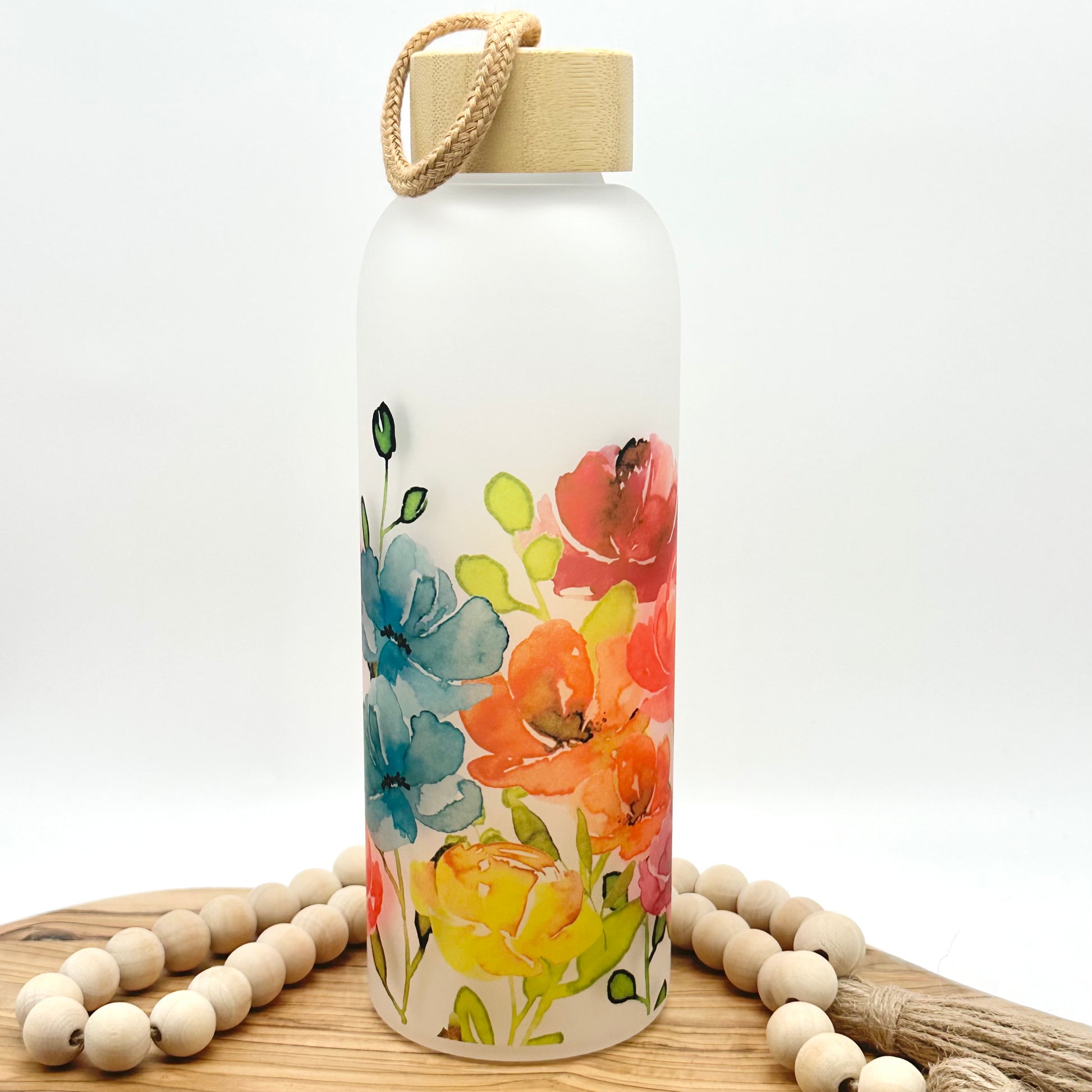 Introducing our colorful spring floral frosted glass water bottle with bamboo lid! This glass water bottle has a capacity of 25 fluid ounces and includes a bamboo lid that twists on and off. This makes it easy to take on-the-go. The frosted glass gives a unique and elegant touch, while the pretty floral image adds a touch of natural beauty to your drinkware collection.