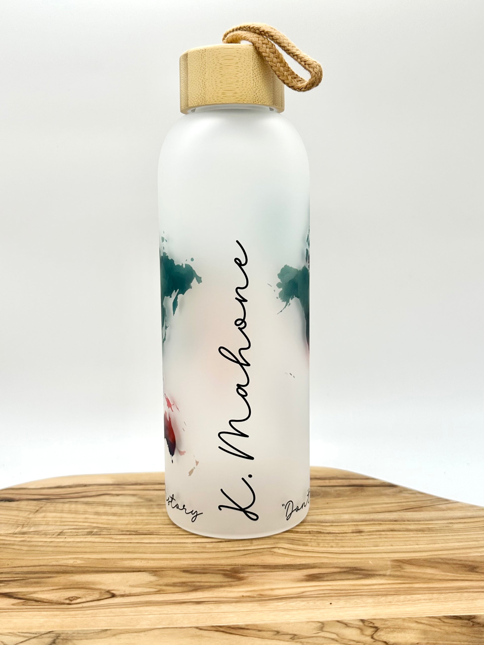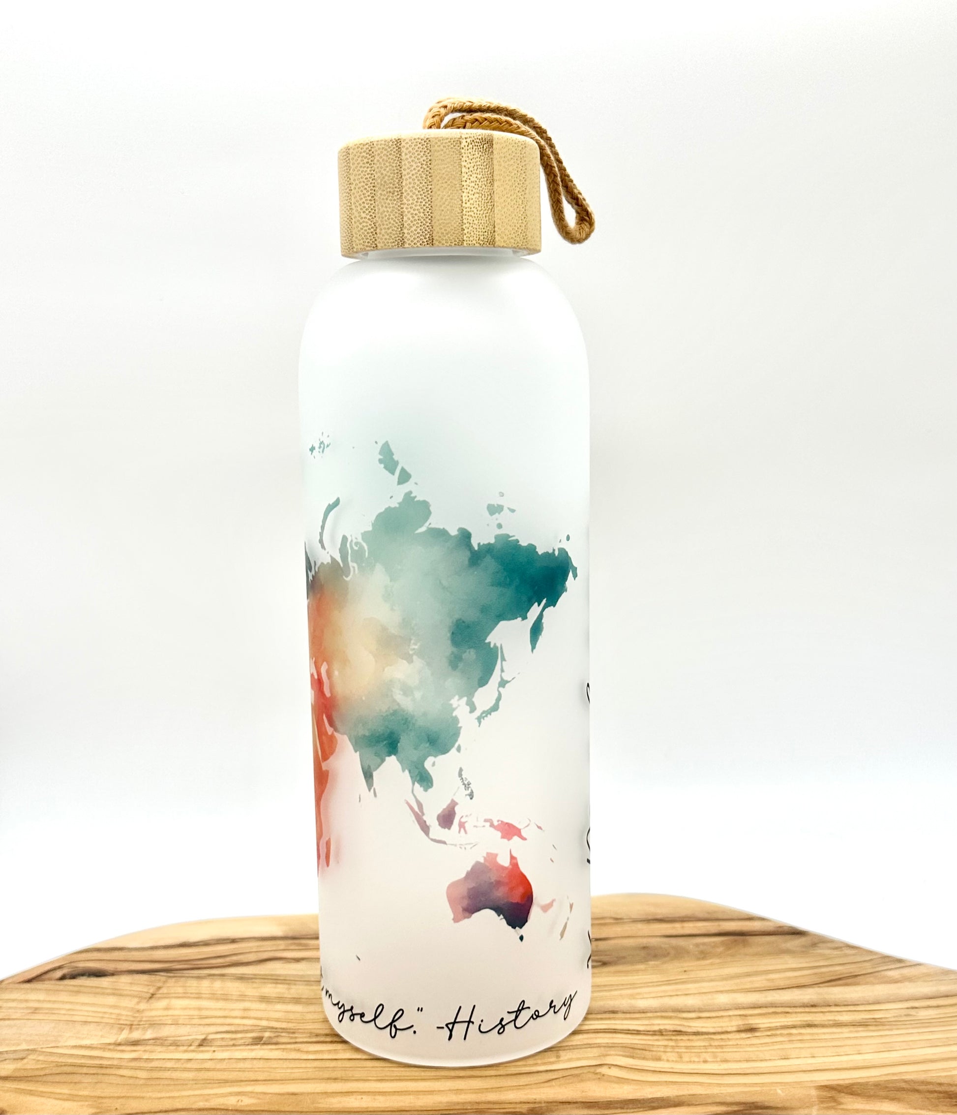 Introducing our world map frosted glass water bottle with bamboo lid! This glass water bottle has a capacity of 25 fluid ounces and includes a bamboo lid that twists on and off. This makes it easy to take on-the-go. The frosted glass gives a unique and elegant touch, while the pretty watercolor image adds a touch of beauty to your drinkware collection. The wording on the bottle say “Don’t make me repeat myself. - History” Ot can also be personalized to include a name and could make an excellent gift for a history liver or teacher.